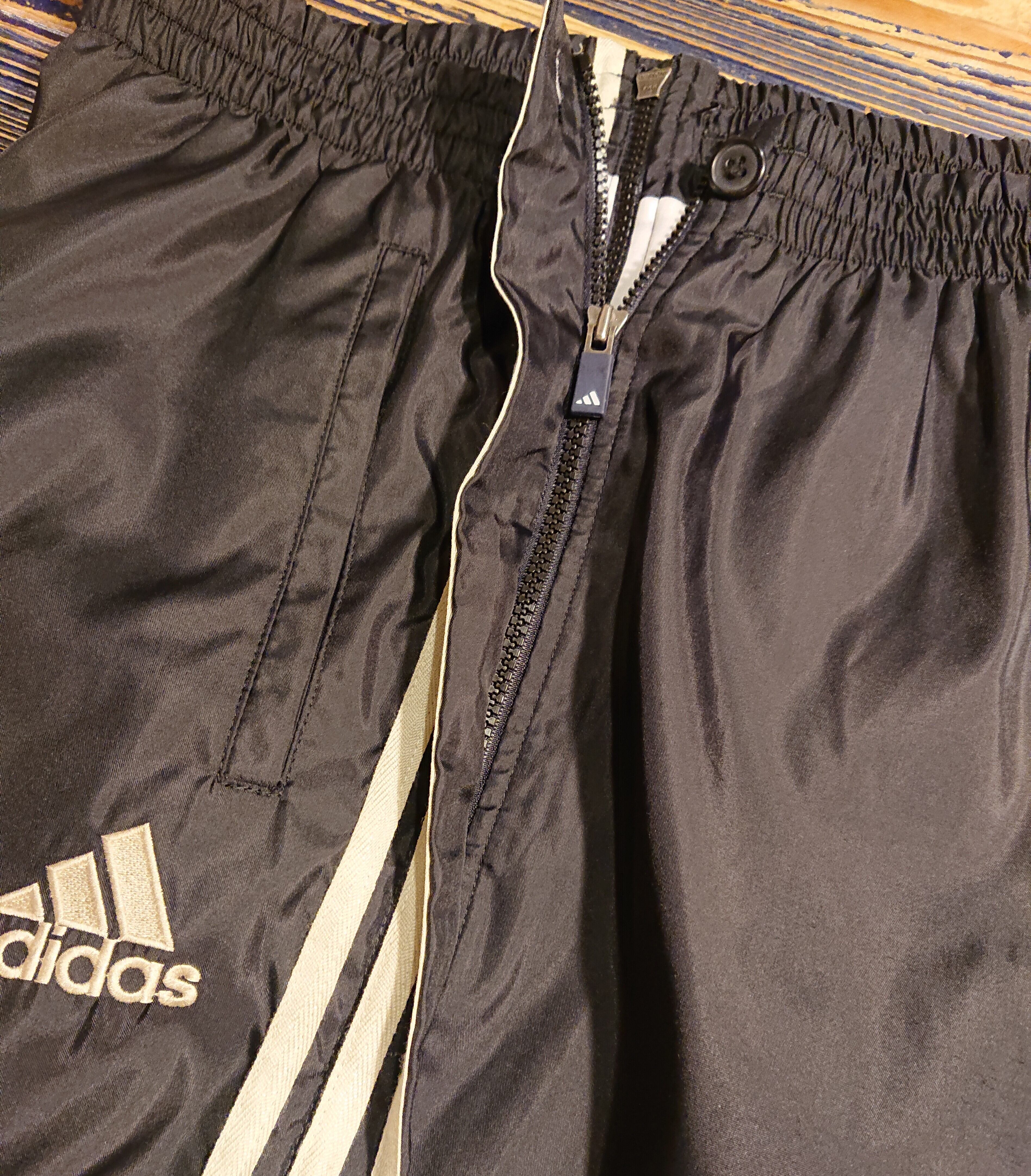 両サイドにジッパーがついており、裾はマジックテープ仕様。その為腰にドローコードはなく紐で絞ることは出来ません。表はナイロンで裏地はポリエステルなのでナイロンのみのシャカシャカさはあまり感じないと思います。全体的にコンディション良い一本です。