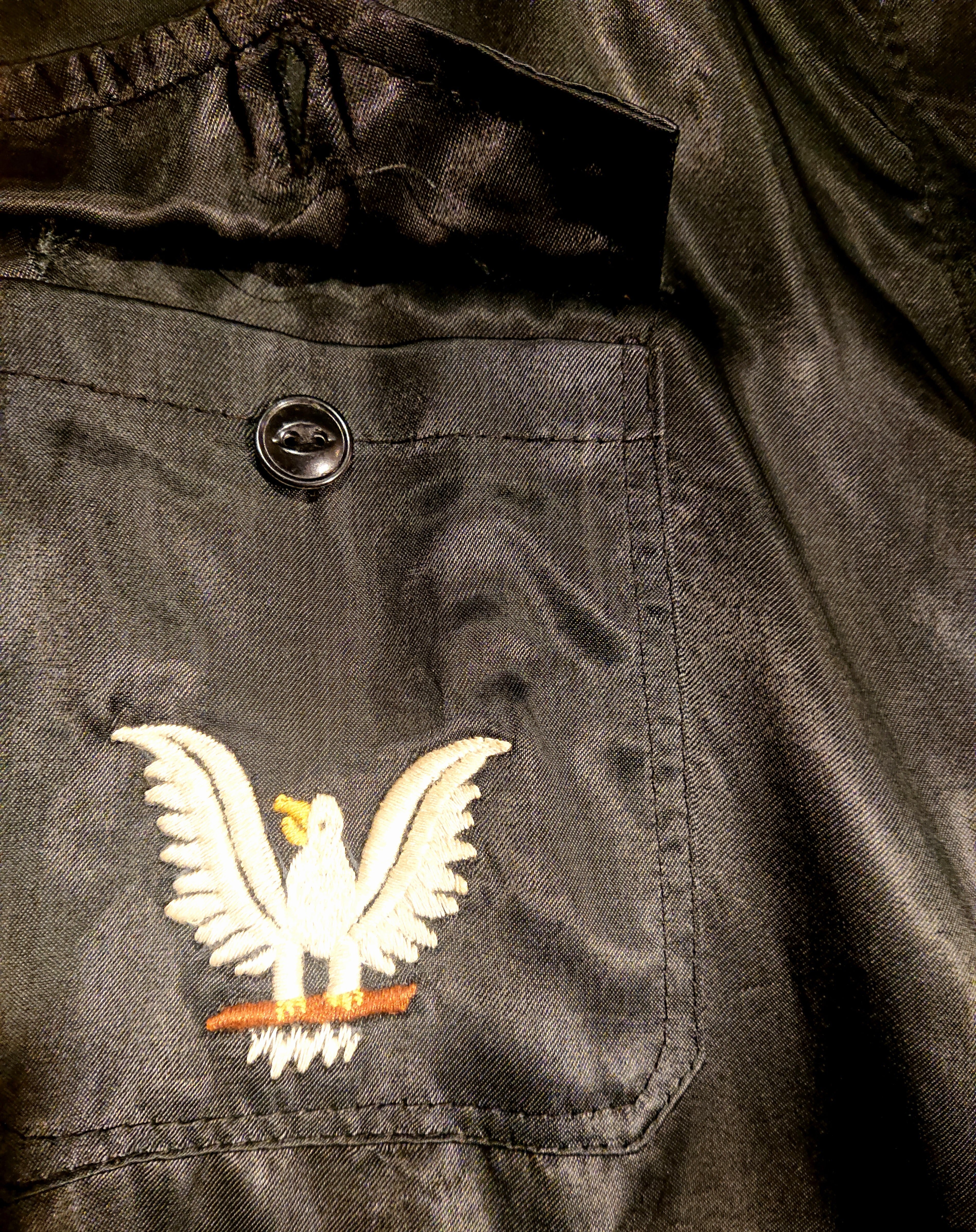 ブラックのサテン生地。両腕に染み汚れがあります。俗に言うスカジャンより、刺繍の入りかた