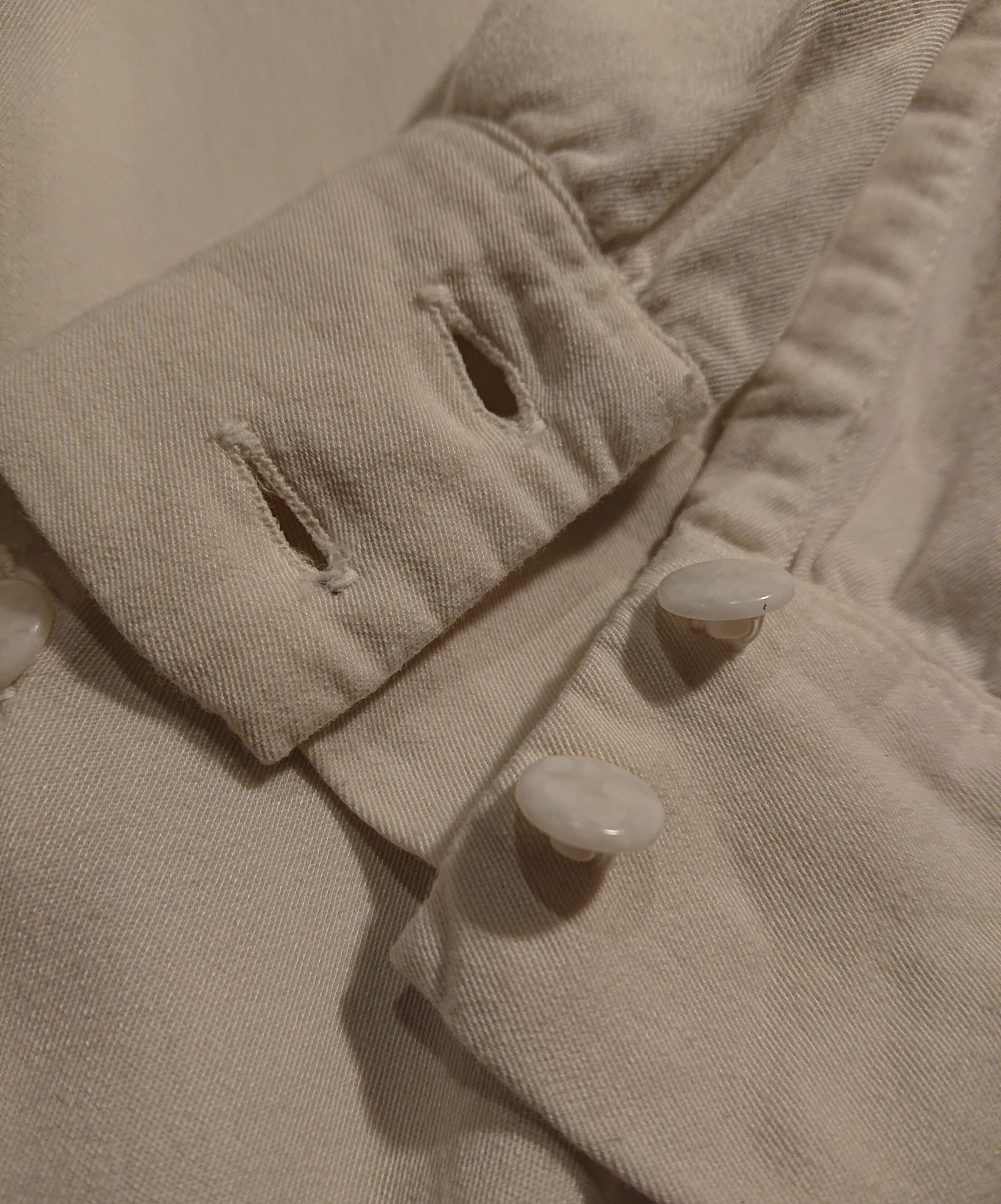 白黒の2トーンの良い配色。フロントとフラップ、袖口はボタン仕様。着用感あり。首周りの内側に