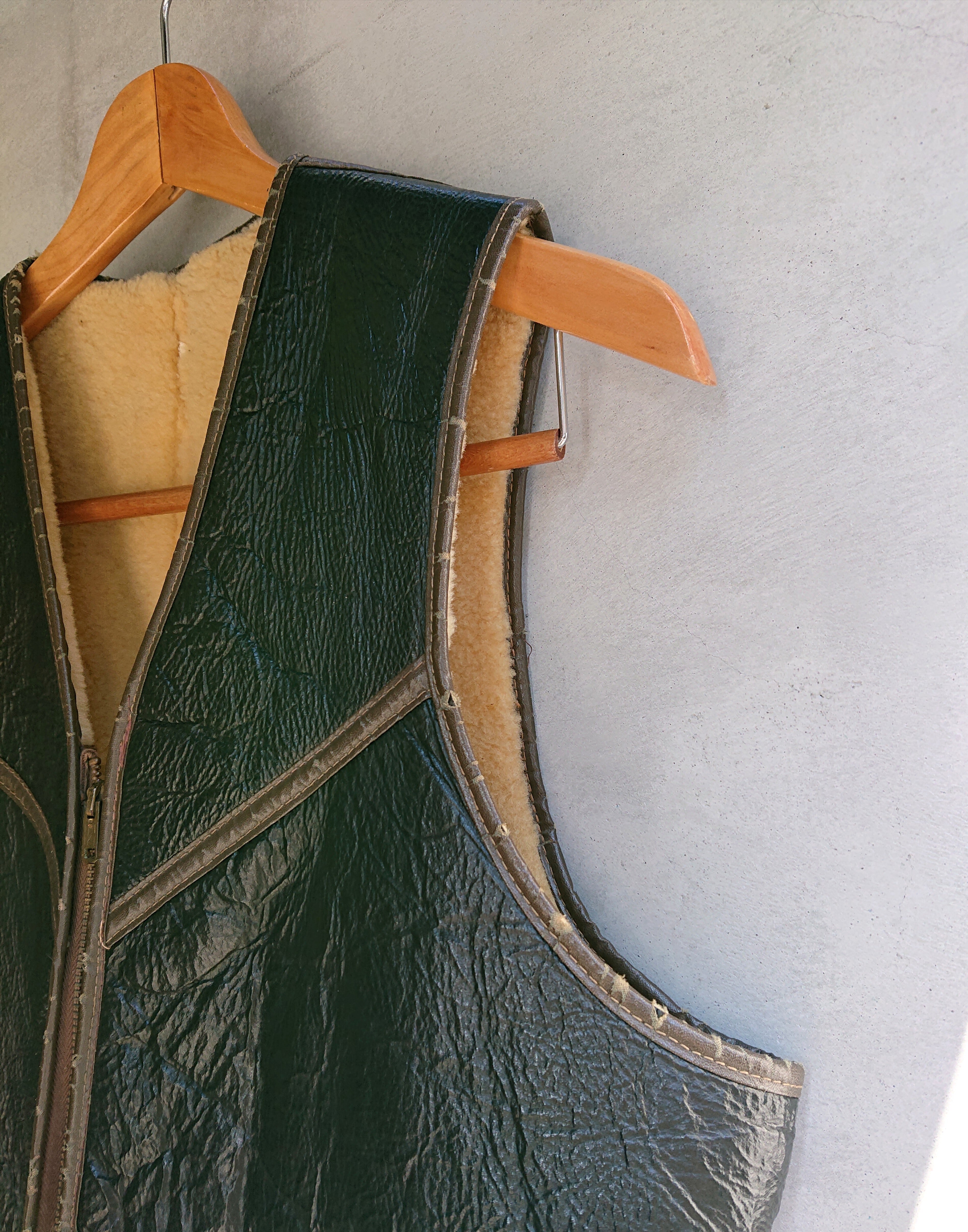 ジッパーフロントのベストでムートンなので保温性も高いです。ゆったりしたシルエットではないのでインナーとして使うのには最適かと思います。ミリタリージャケットやワークジャケットをムートンベストの上から羽織る格好良さ。
