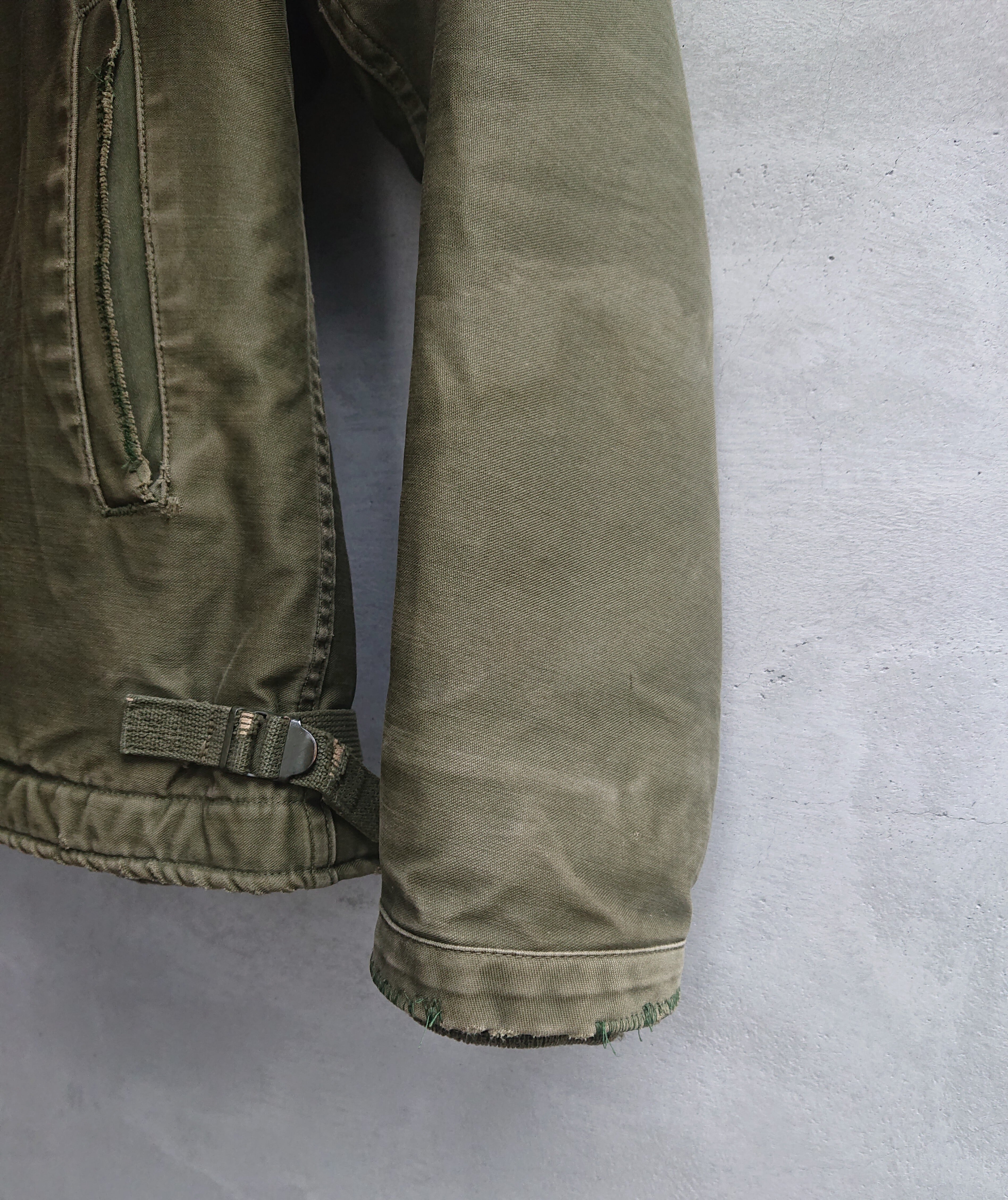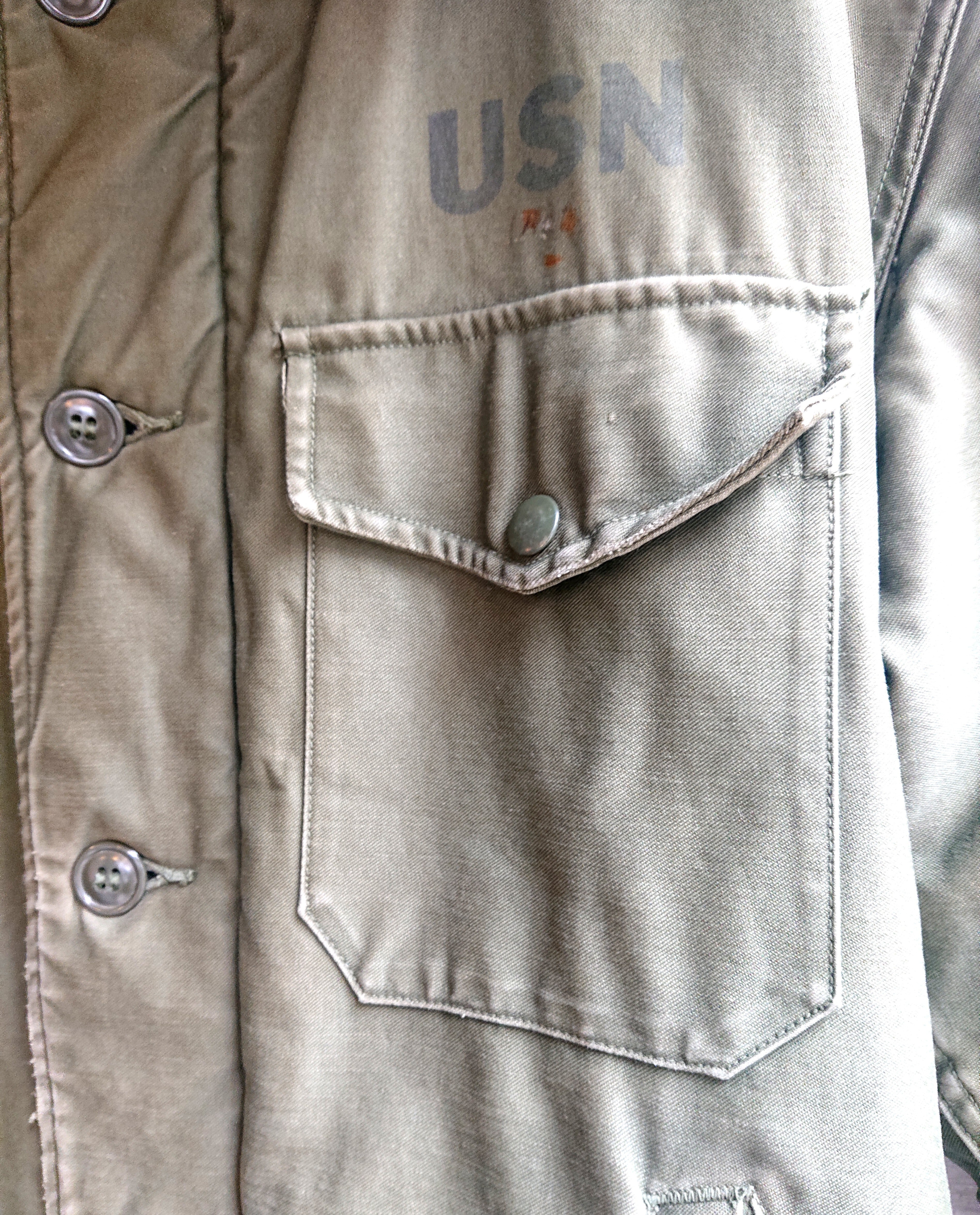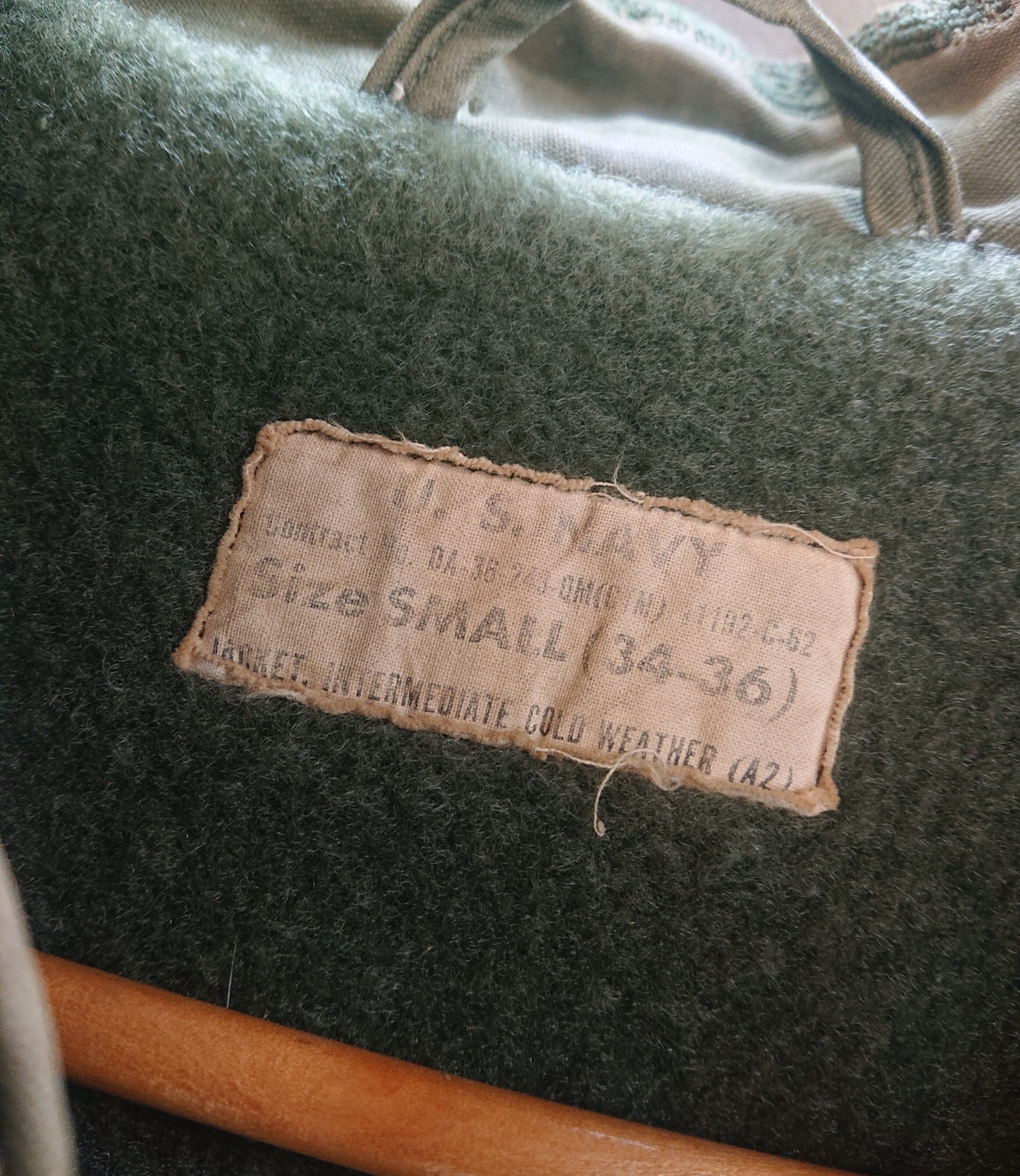 1960年代US NAVY A-2 DECK JACKETになります。1962年製造。前期型のモデルでフラップポケットのデザインが違うのが特徴の1つで、分かりやすく後期モデルと見分けるポイントかと思います。その他の違いとし袖口の補強布に襟裏のステッチの違い等もあります。A-2自体、80年代頃まで製造、初期型は約5年程しか作られてなく貴重なアイテムになります。胸ポケット上にUSNと背中にステンシルプリントが入ります。初期モデルでプリントが入るのはまた一段上の感じもします。