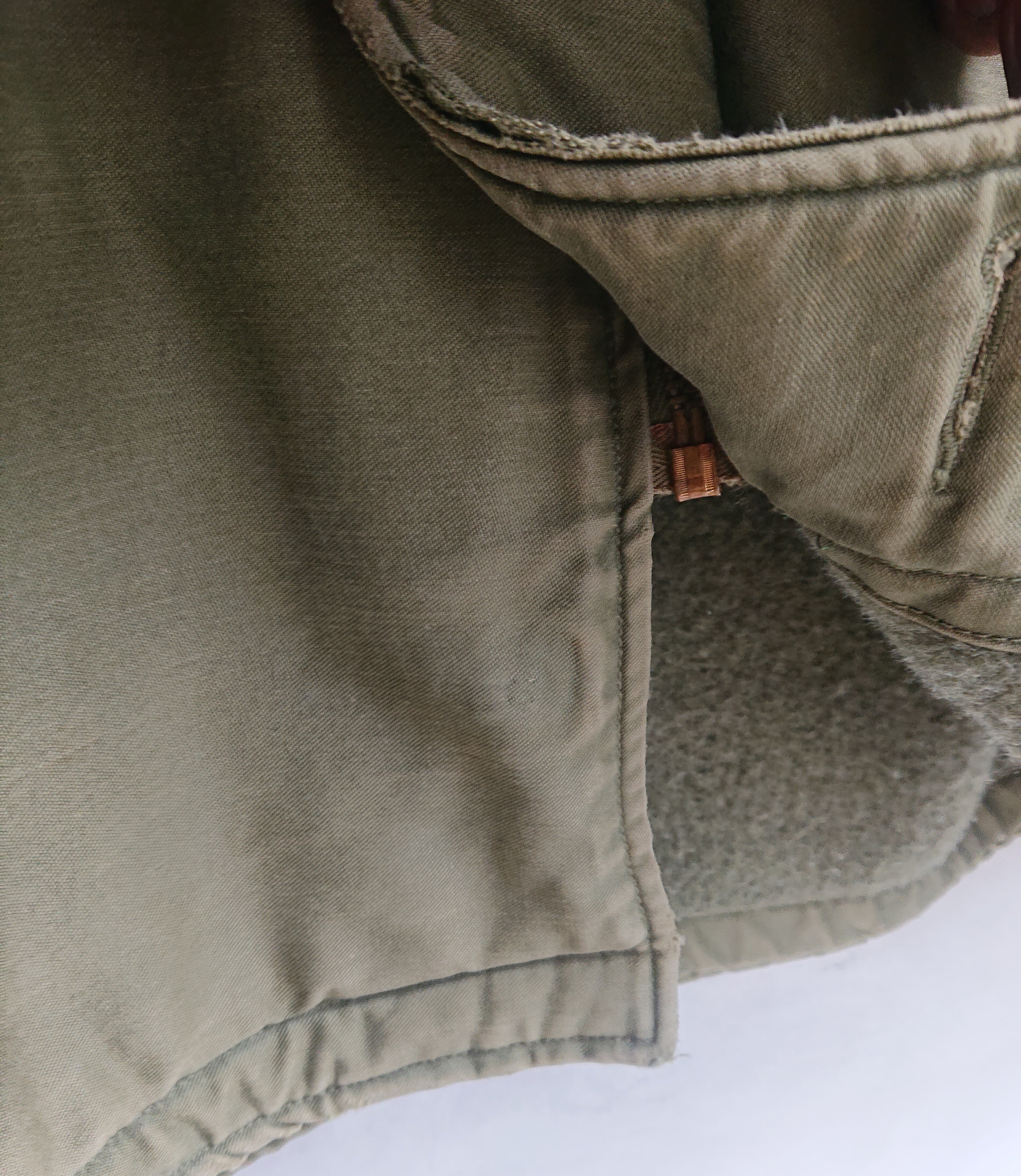 ジッパーの上から10cm程開閉が出来ない状態ですが引き手と挿し込み部分は問題ないので途中まではジッパーが使える状態。全体的にこのA-2 DECK JACKETがもつ雰囲気は抜群と思います。