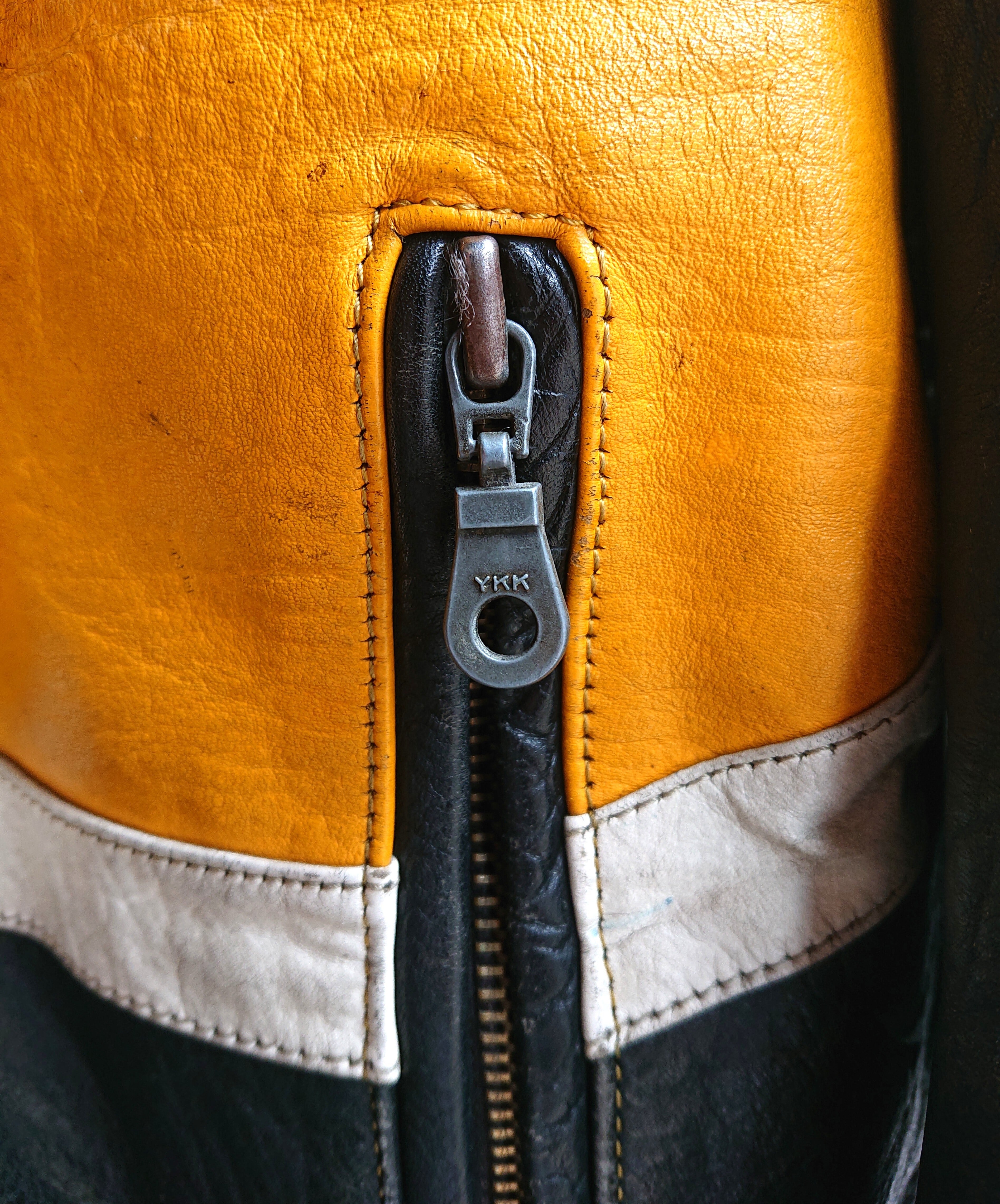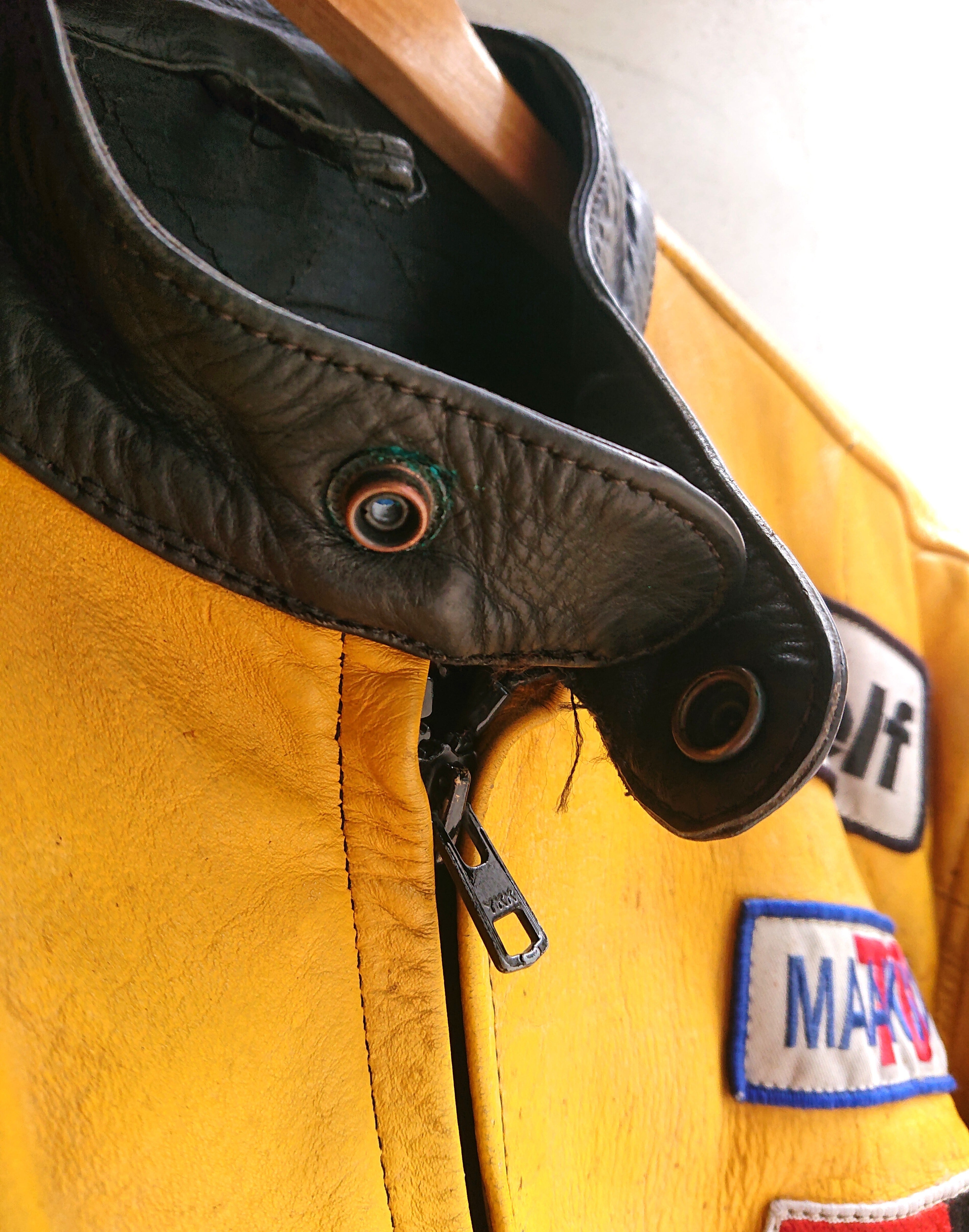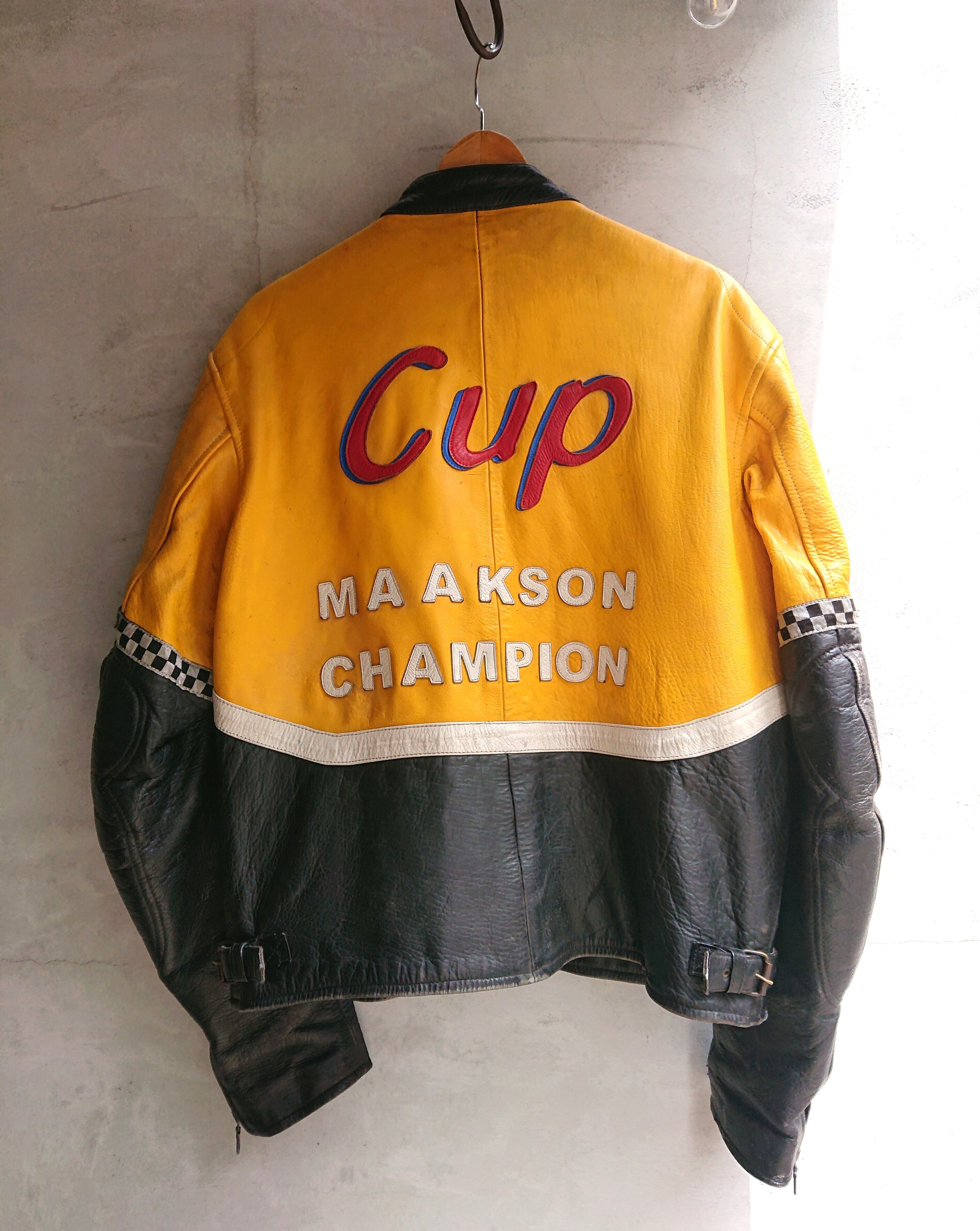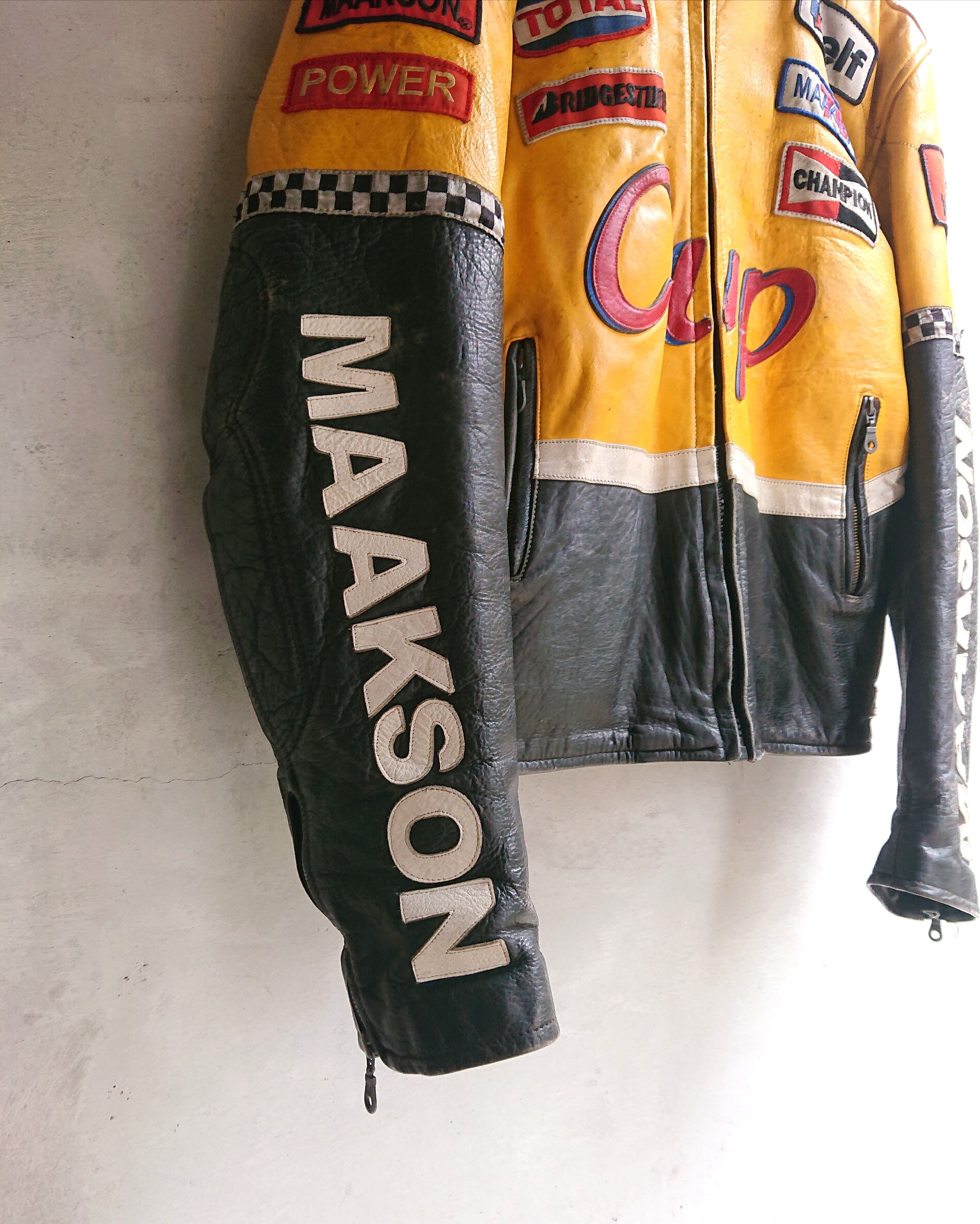80年代 MAAKSON レザージャケットになります。ユーロヴィンテージのものでモーターサイクル レーシングチームのジャケットになります。イエロー×ブラックの好配色。背中にはMAAKSON CHAMPION CUP、両腕にはMAAKSONとレザーで切り取った文字が入りインパクト大。両腕、胸元にスポンサーのワッペンがついており、それもこのジャケットの魅力の1つです。腕につくチェッカー柄のテープもさりげないポイントに。サイズはXXLと大きめ。レーシングジャケットなのでジャストで着ると本気感が強くでてしまうので、ゆったりと少しだらしなく着ることでコーディネートの幅も広がり楽しい合わせ方が出来ると思います。着用感ありますが致命的な傷等はありません。