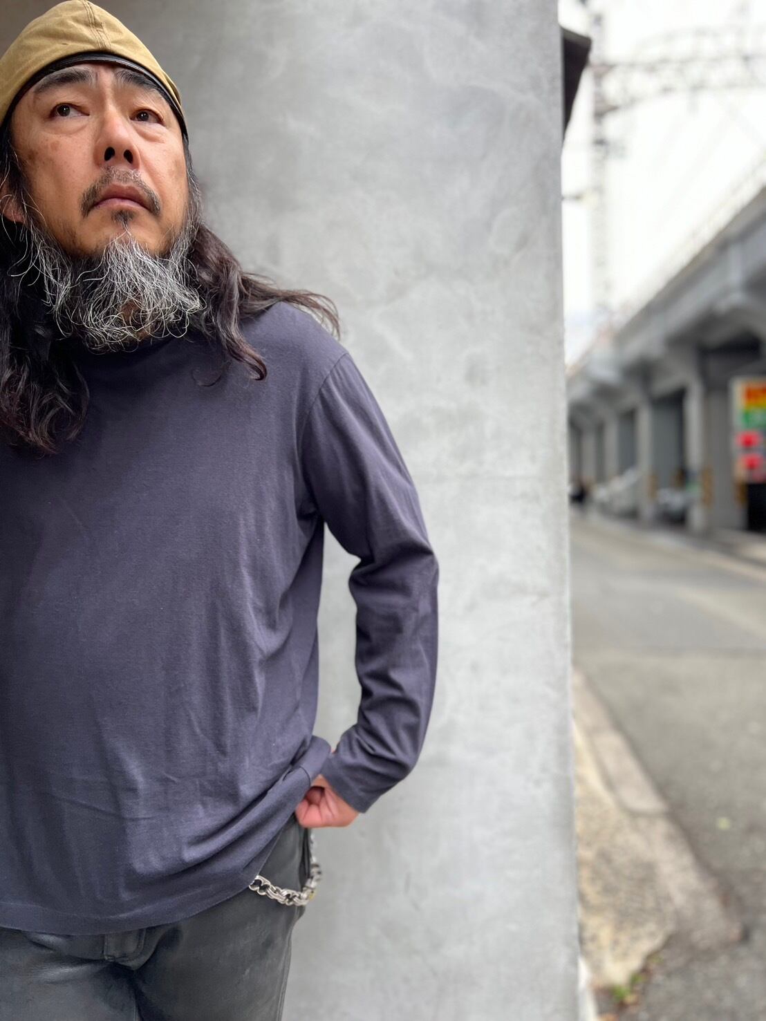 YOHJI YAMAMOTO POUR HOMMEのロングスリーブTシャツ。写真では光の加減でネイビーっぽく見えますが、スミ黒カラー。