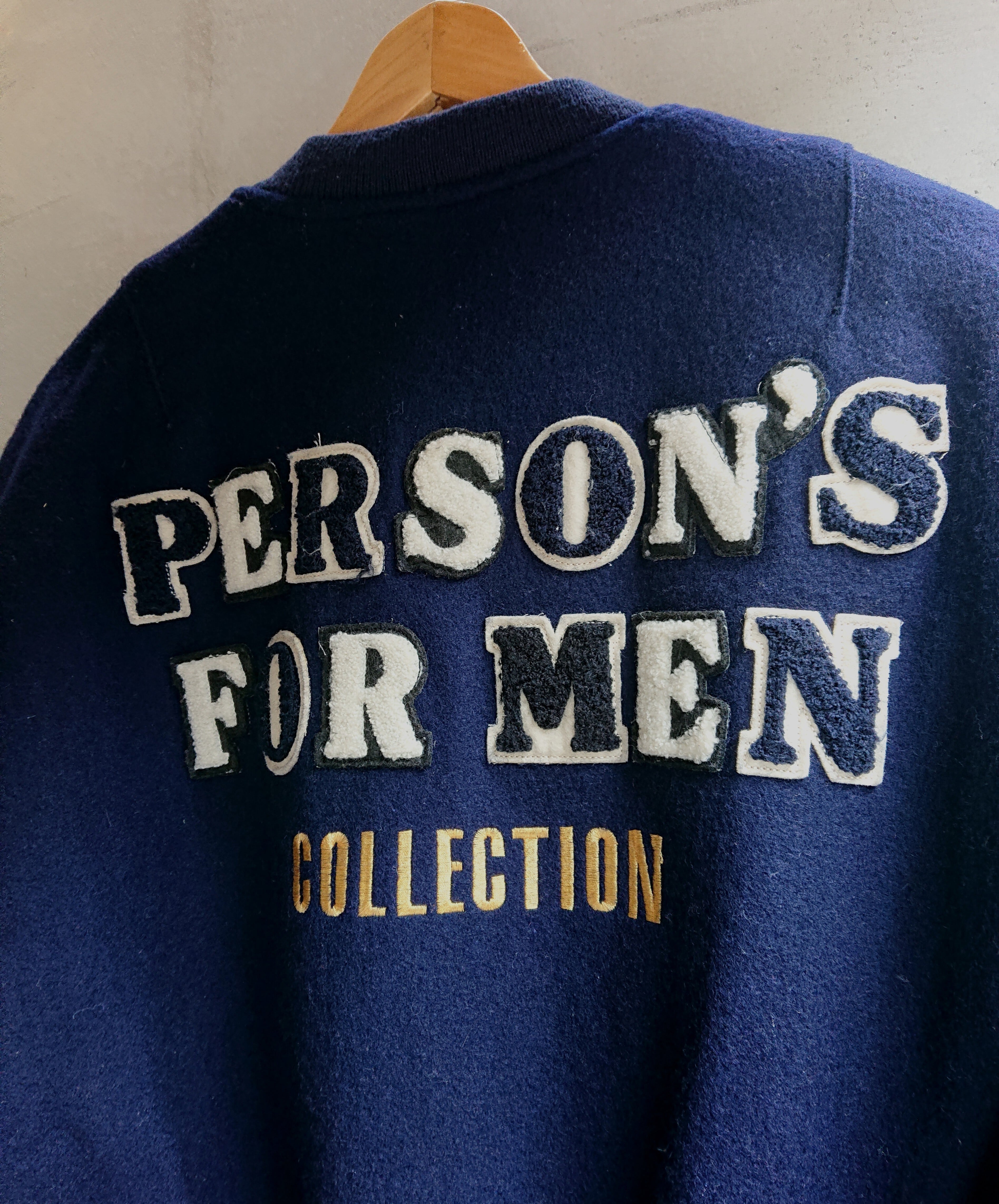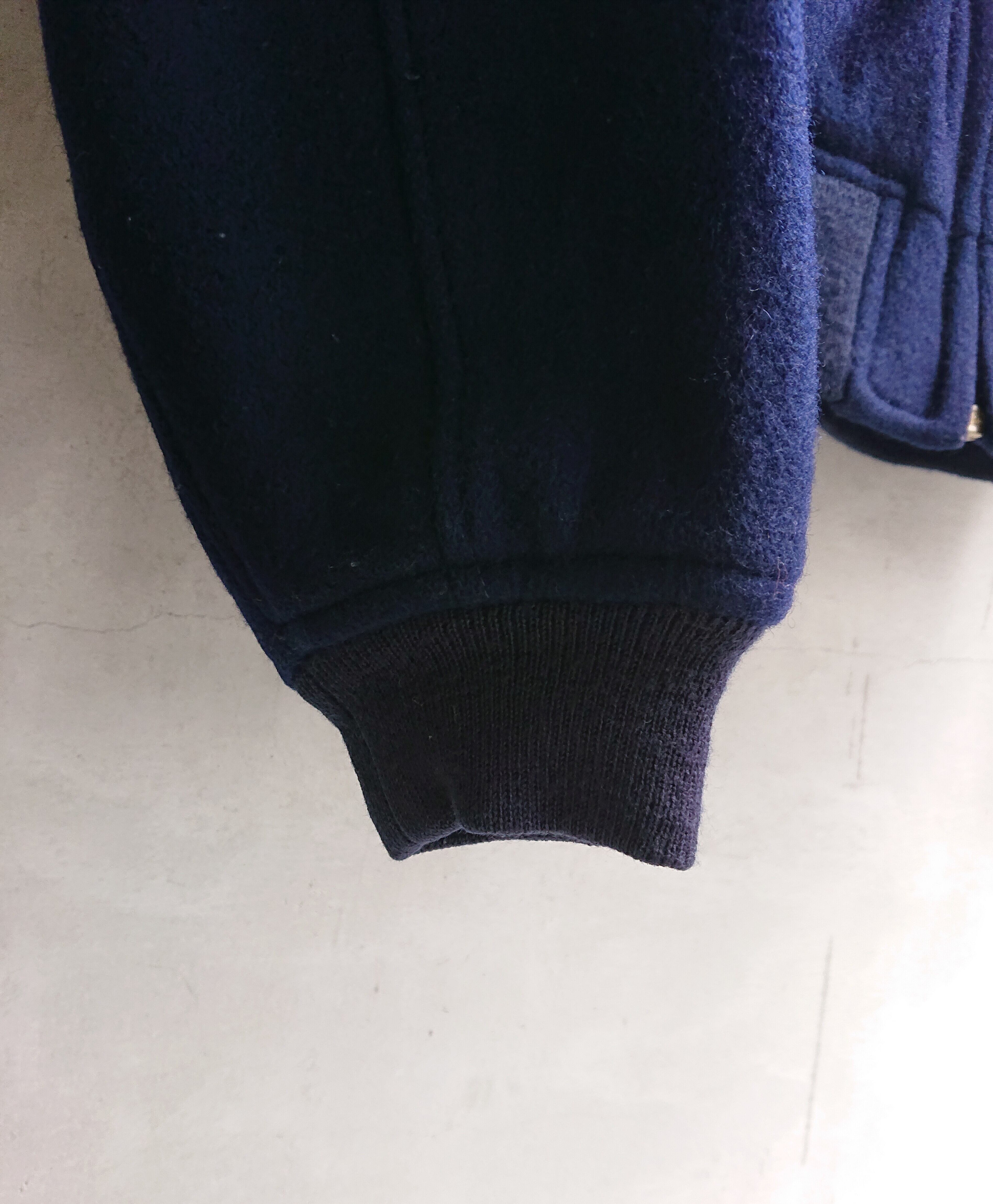 今回紹介するMA-1タイプのジャケットはウール素材で中綿入り。背中にはブランドネームのパッチと刺繍でCOLLECTIONの文字。ネイビーカラーで