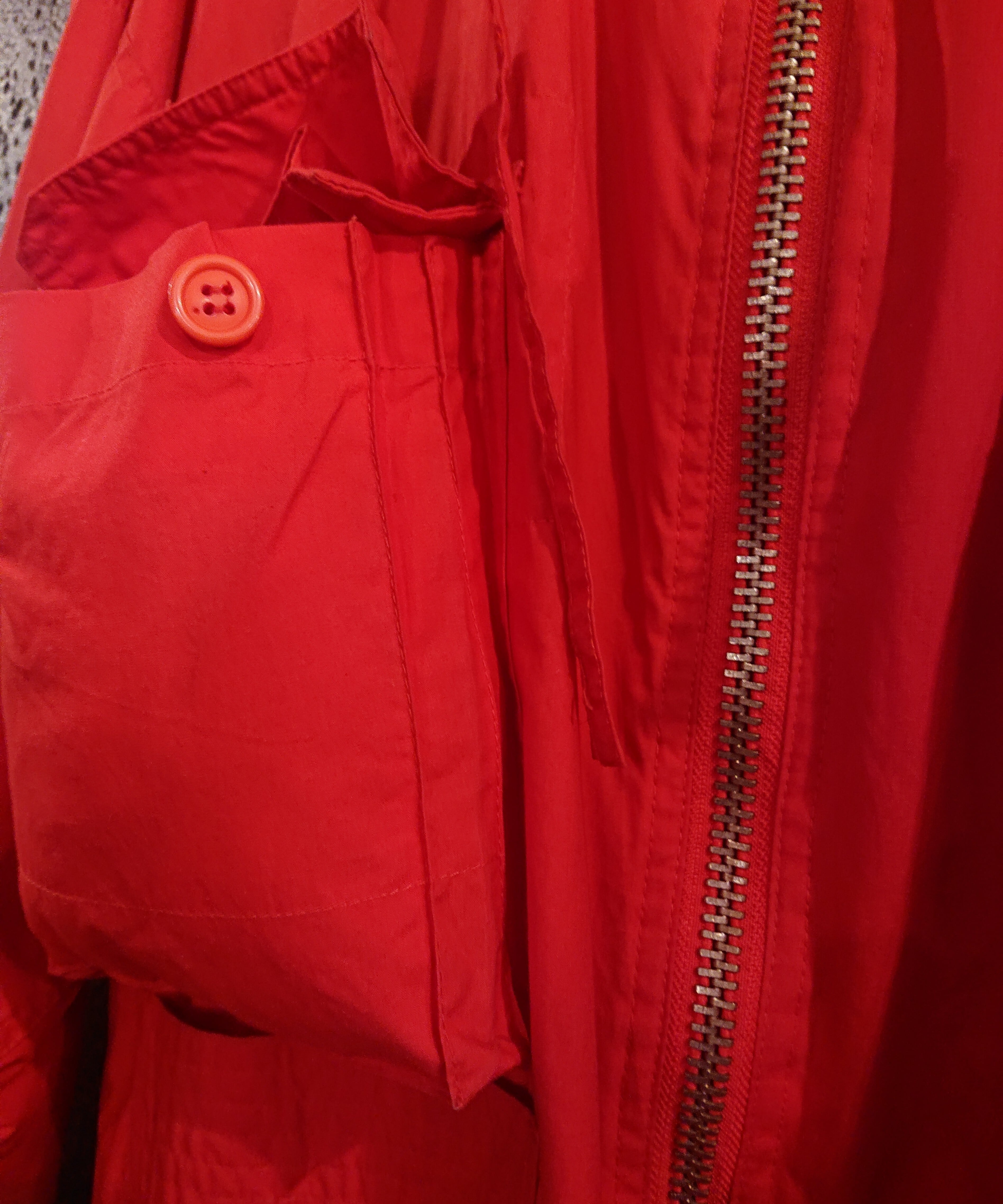 今回紹介するミリタリーデザインのジャケットはコットン素材で特徴的な丸みある襟のマジックテープをはがすとフードが内蔵。4ポケットスタイルでマチのある胸ポケット。左腕にワッペンがつきます。襟部分と裾にドローコードが入っており