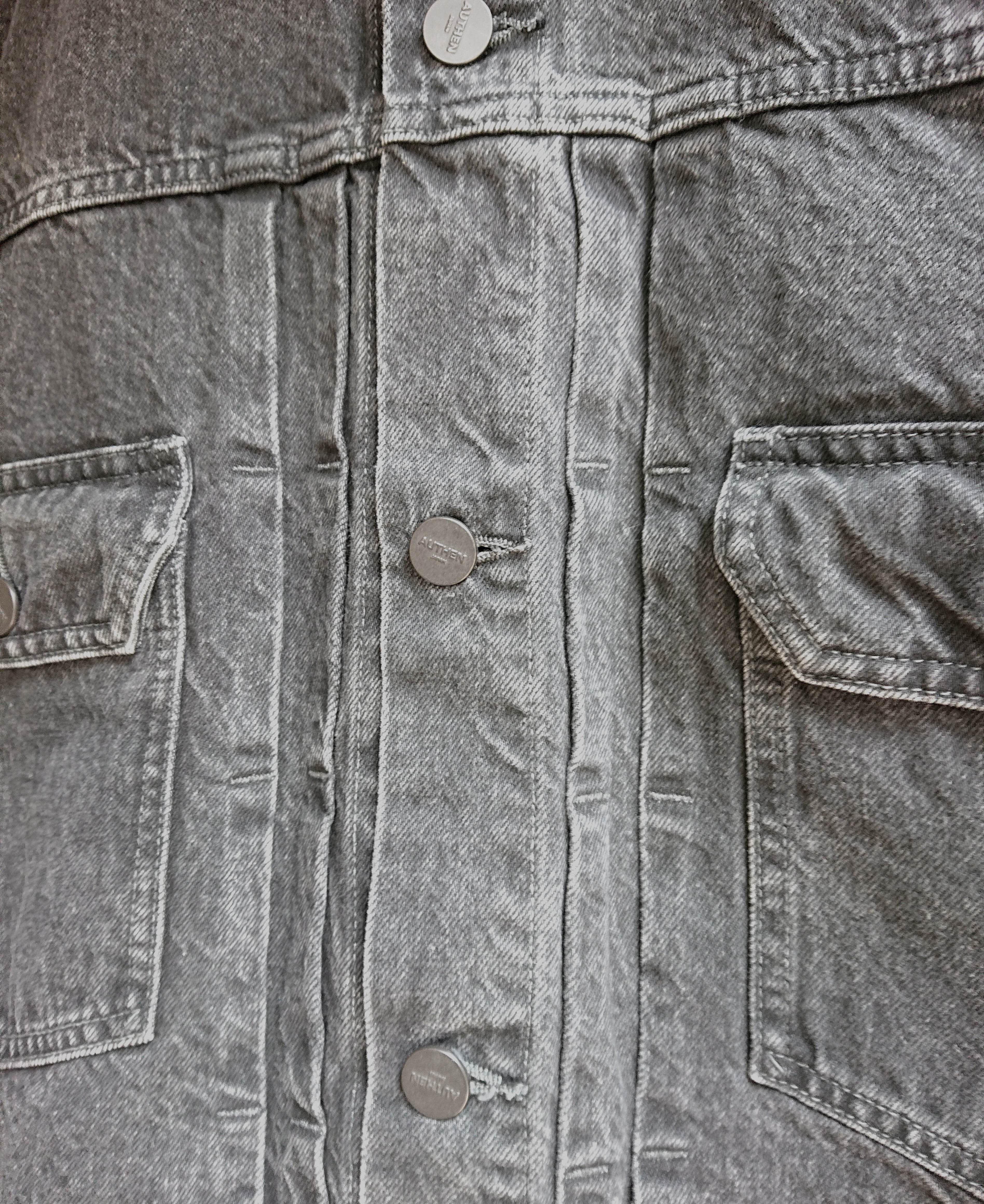 80~90年代を感じさせる、ゆったりとしたシルエット。ユーズド加工されたブラックデニムのジャケットはコーディネートの幅も広げてくれること