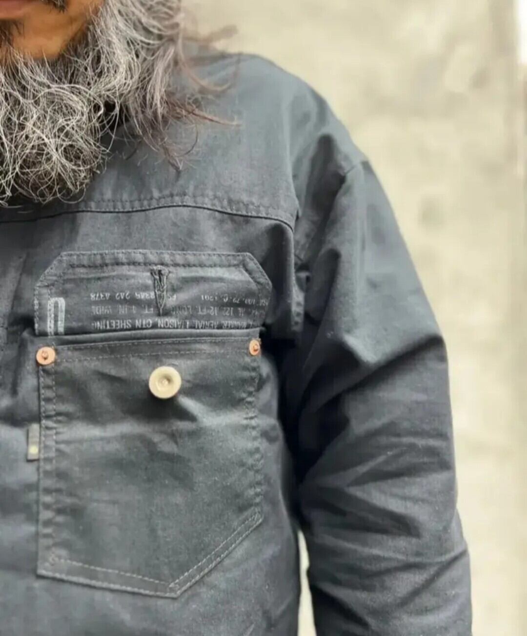 画像のステンシル部分の一部もフラップ裏や、カフスパーツ裏などに配置して製作しております。昨今、この様な素材が纏まって入手出来る事は稀で、素晴らしい素材に巡り会えて嬉しい限りです。