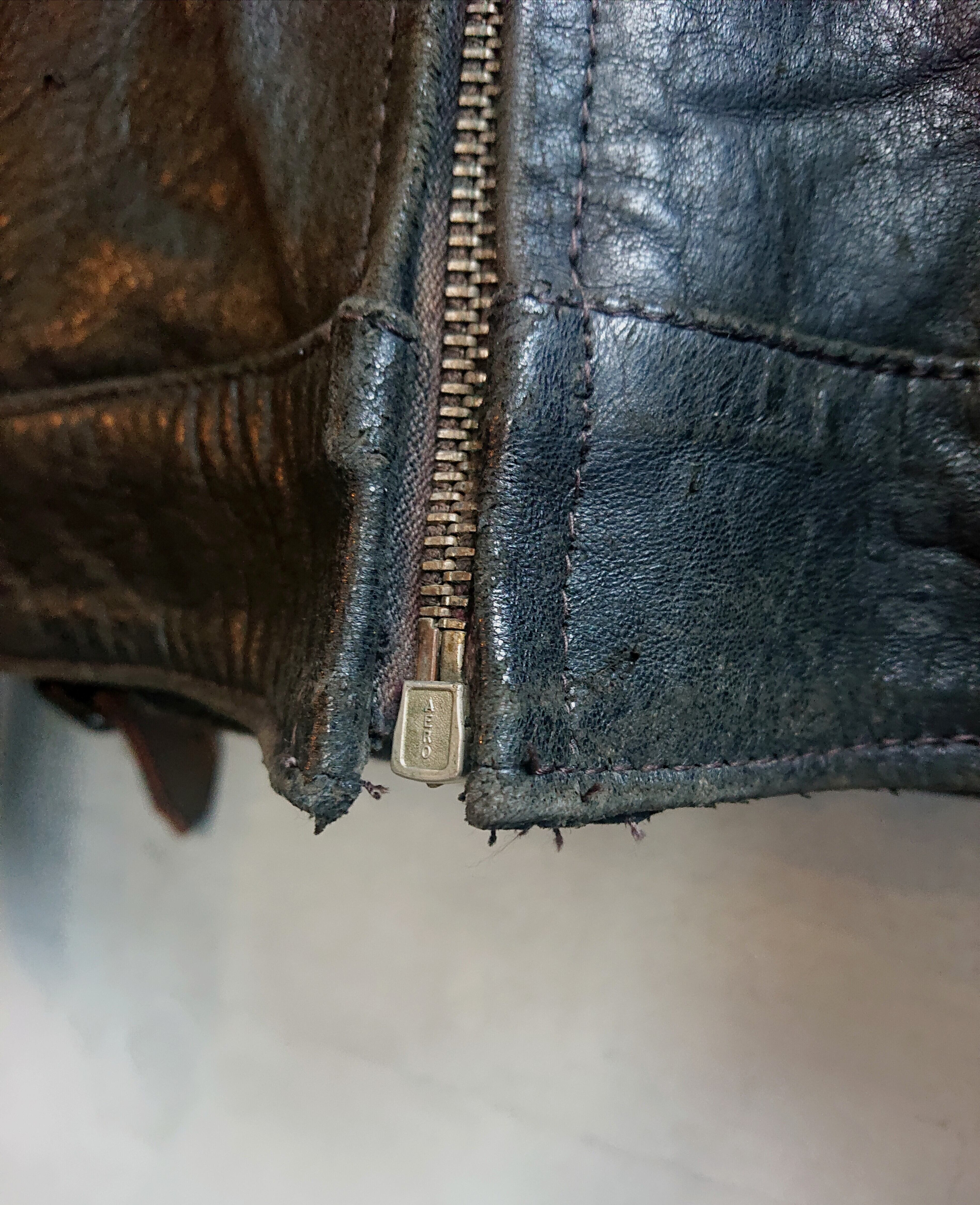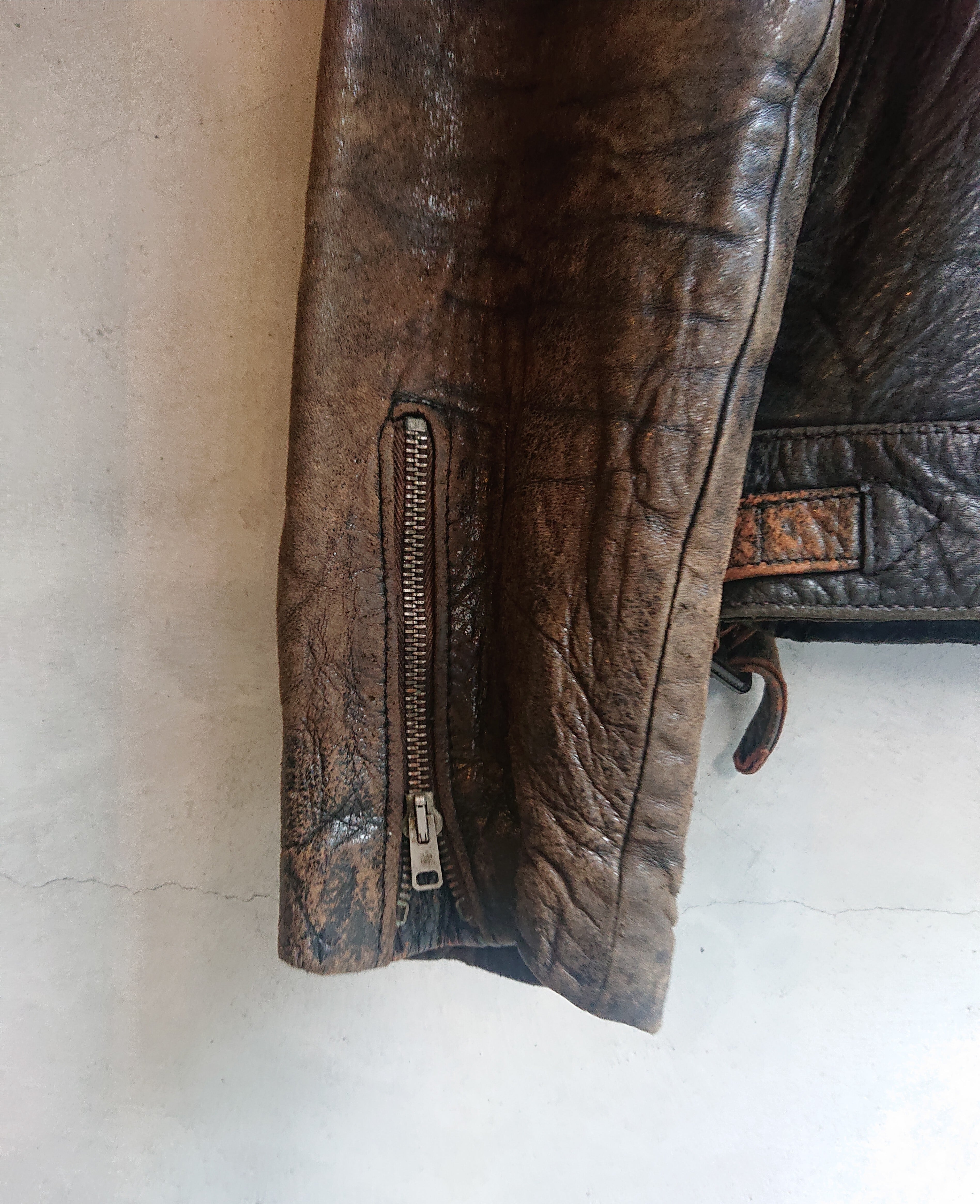 この雰囲気ヤバくないですか!!デニムやスウェット、Tシャツ等の雰囲気系とは違うレザーの着古した雰囲気。シープスキンレザーで銀面の剥がれ具合に、右袖だけ経年変化もあってかブラウンカラーに。襟付きシングルタイプのライダースでAERO’ジッパーが装着。ハンドウォーマーポケットにはボールチェーンがつきます。イギリス製のレザーモーターサイクルジャケットではベーシックなスタイル。内側はキルティング仕様。キルティング面に多少擦れや汚れもありますがそこもこの雰囲気抜群なレザージャケットのプラス要素とも思います。あえて綺麗めなスタイルに取り入れてもらいたいジャケットです。