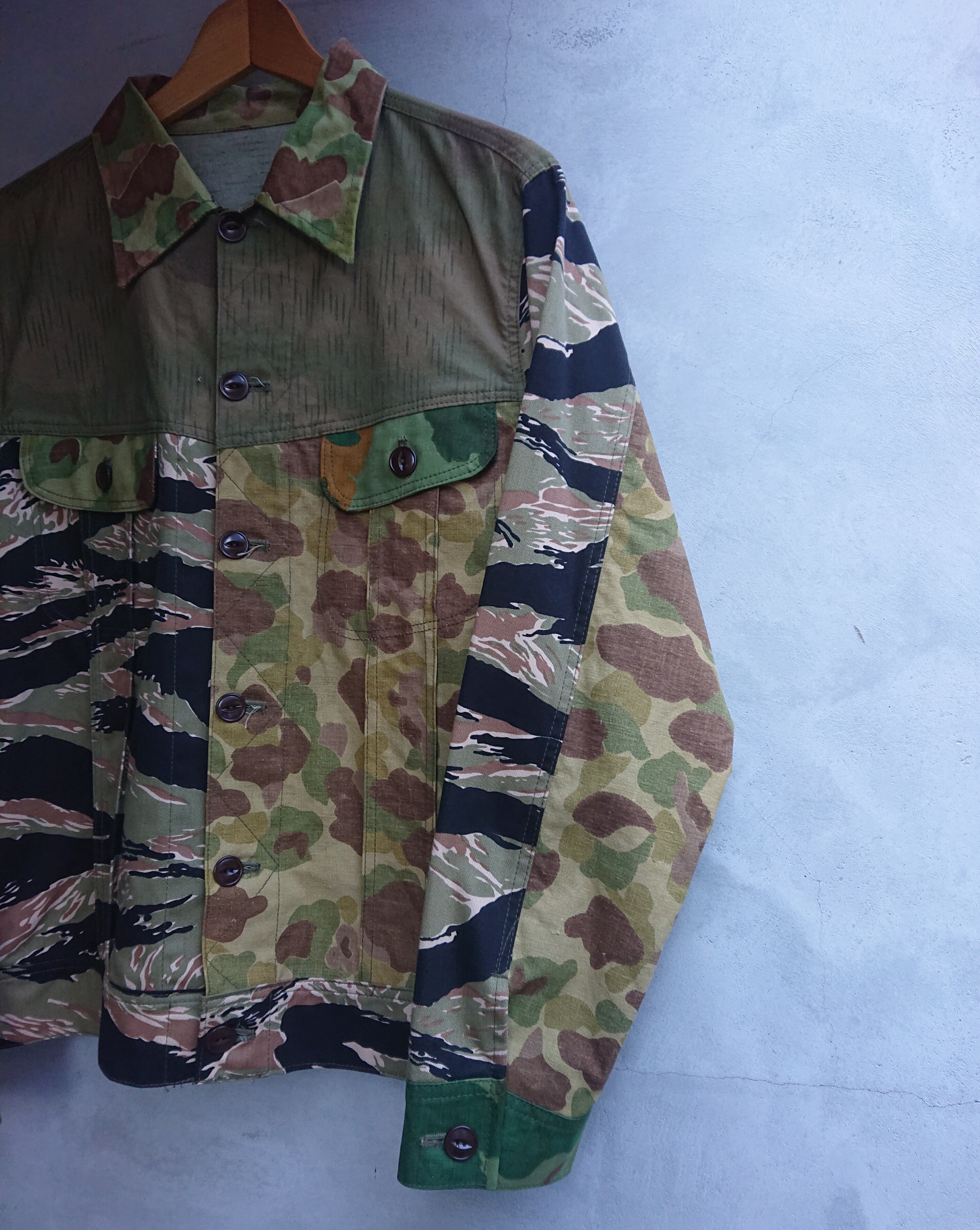 BAA COSTUMEからリリースのライダースデニムスタイルのリビルドジャケットは、4種類のカモフラージュ柄を絶妙なバランスで配置したスペシャルなジャケット。使用生地は1940年代のダックハンターカモ、1950年代のミッチェルカモのヴィンテージファブリックとムービーコスチュームに使われた貴重なリプロダクションファブリックをミックスした贅沢なプロダクツです。