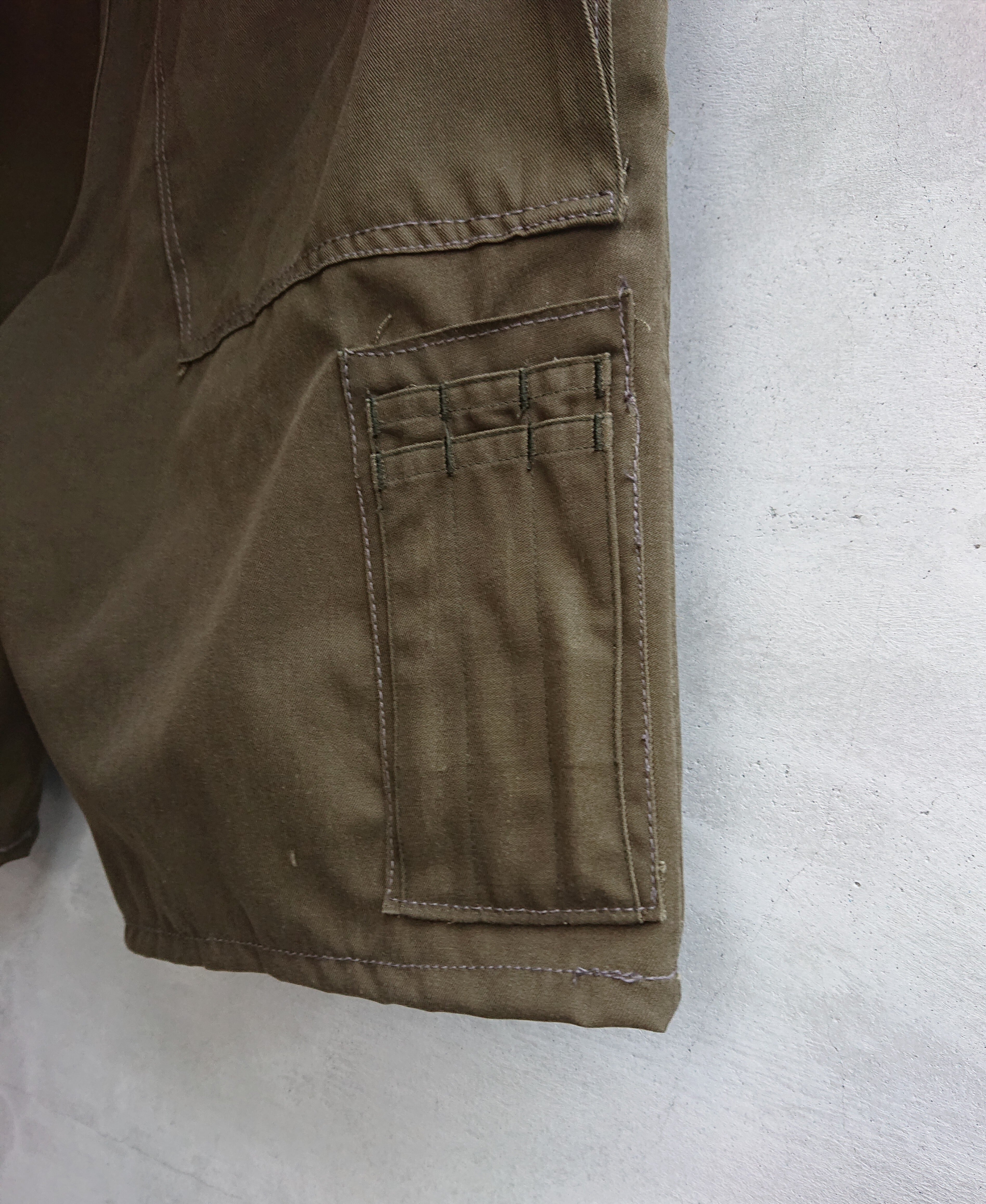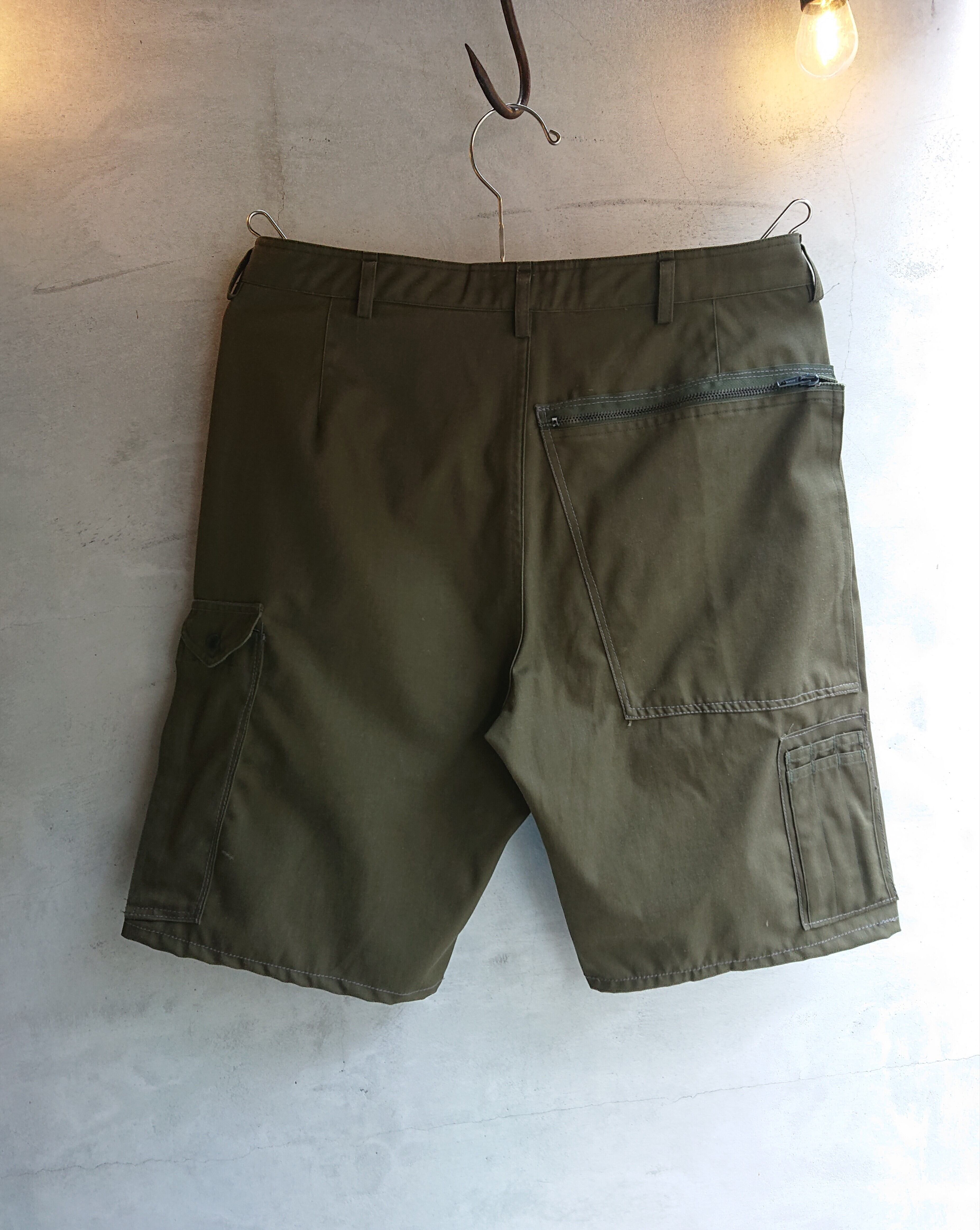 希少なイタリア軍のパラトルーバーパンツをリビルドしショーツに。パラトルーバーパンツはパラシュートやグライダーなどによるエアボーン戦術を実施する空挺部隊で使用されていた希少性高いパンツです。所々目を惹くディテールはそのまま活かし、本来無いヒップポケットが右側に装着。大きめなヒップポケットが着くことで便利さは勿論、見た目にも迫力がでます。野暮ったくなく、綺麗なシルエット。幅広いスタイルに使っていただけるパンツです。