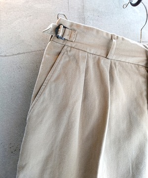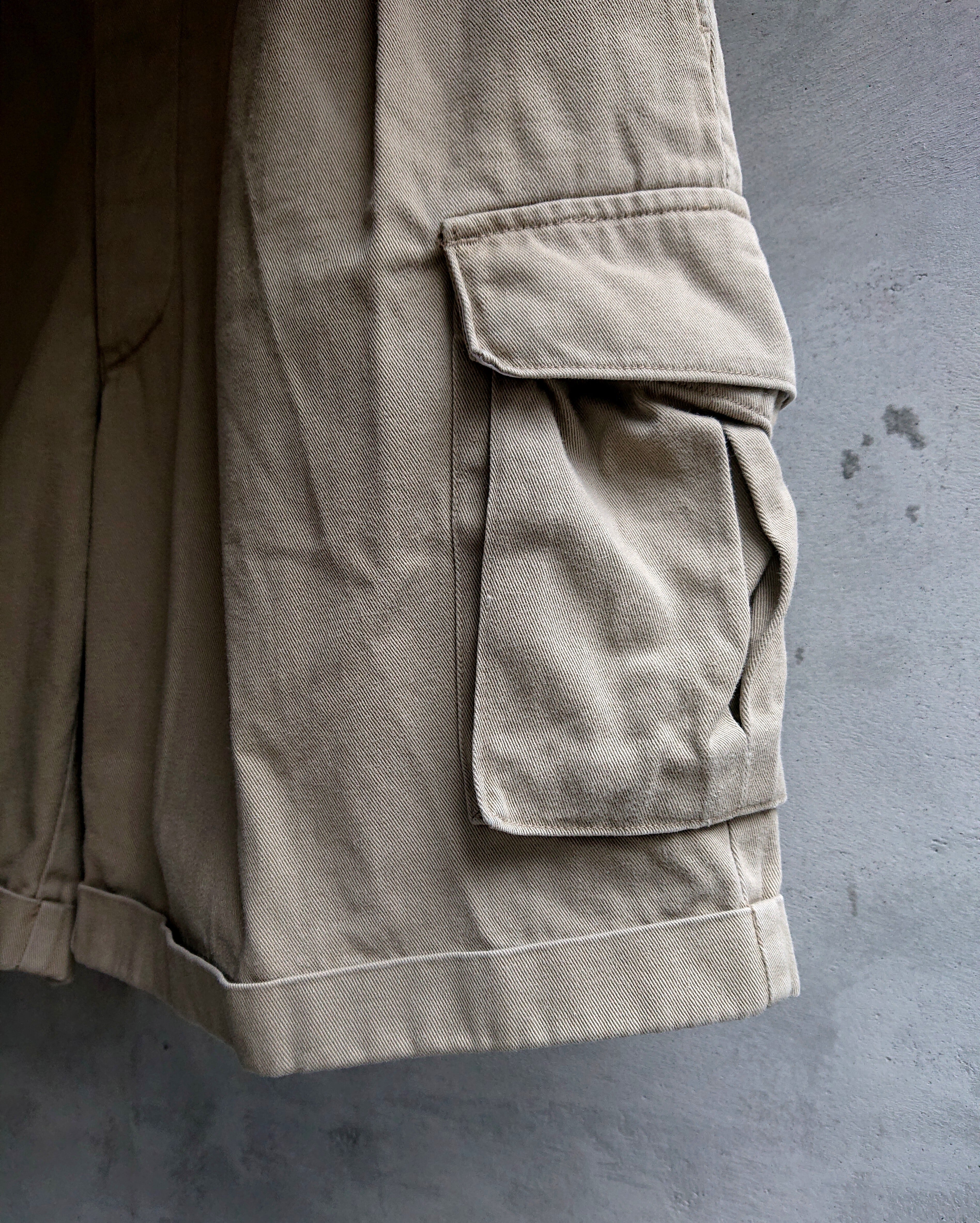 一見、グルカショーツのようなデザインショーツになります。ベルトループもあり、腰部分にはアジャスターもつきます。左側にのみカーゴポケットがつくデザイン。2タックで裾はダブル仕様。