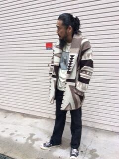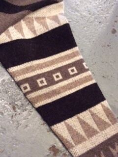 1900年代初頭のアースカラーのグラデーションで構築されたシンプルで美しいナバホ族の図柄。パーツごとに異なるパターンの図柄を肉厚なダブルジャガードで造り上げ、絶妙な配置でクレイジーパターンに組み合わせた至極贅沢な逸品。見事に一つの作品として溶け込みあった図柄に驚嘆しバイイングを即決意したバイヤー推しのアイテムです。