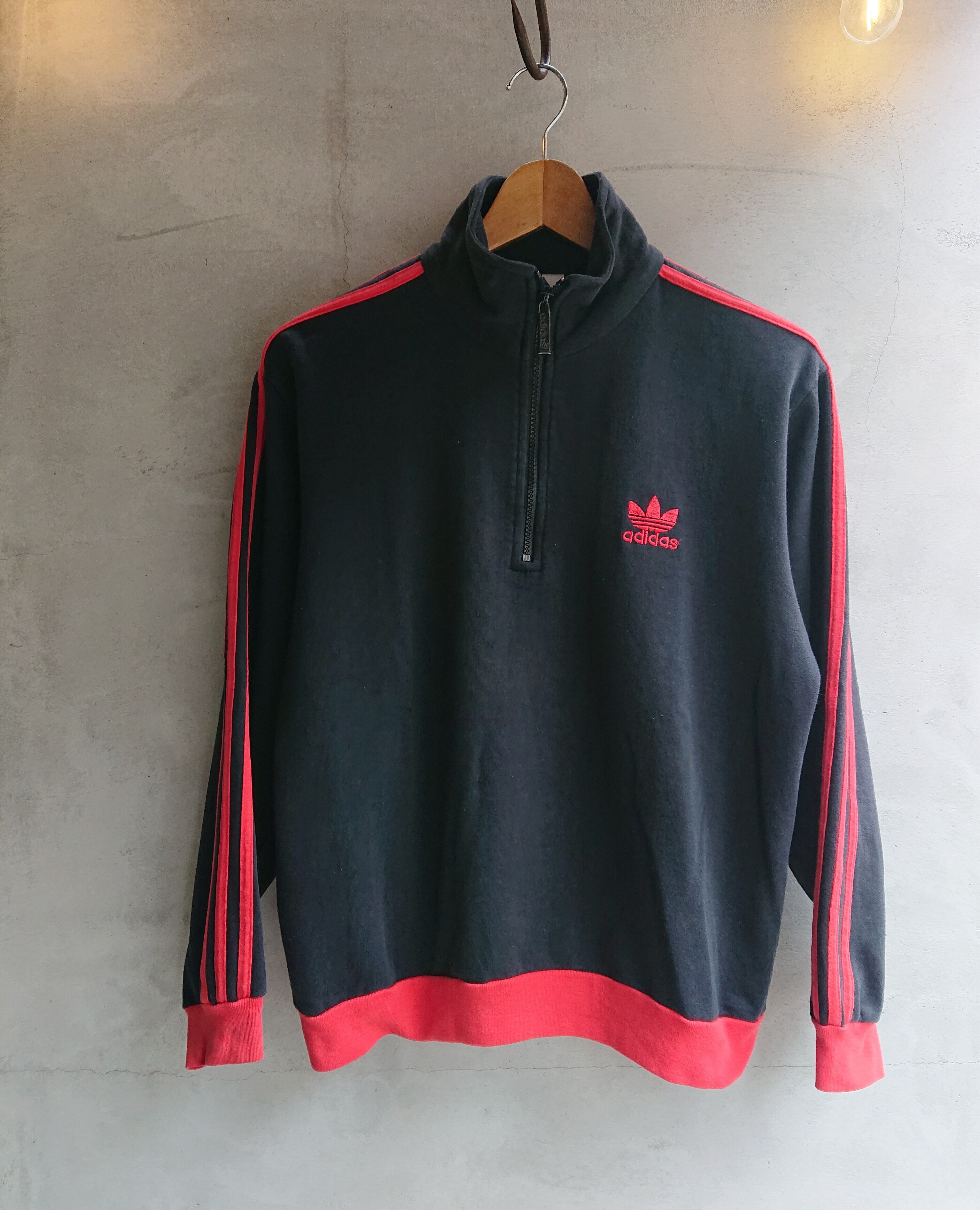 1990年代 adidas プルオーバー仕様のトラックジャケットになります。昨今、若い人は勿論、私共の世代40歳アップの方までと幅広い年齢層の方がお探しになってるトラックジャケット。今回紹介するのはコットン × ポリエステルの混紡でジャージというよりスウェットのような感じです。胸元のトレフォイル。黒ボディに赤の三本ラインと赤リブが安定した格好良さを見せてくれます。