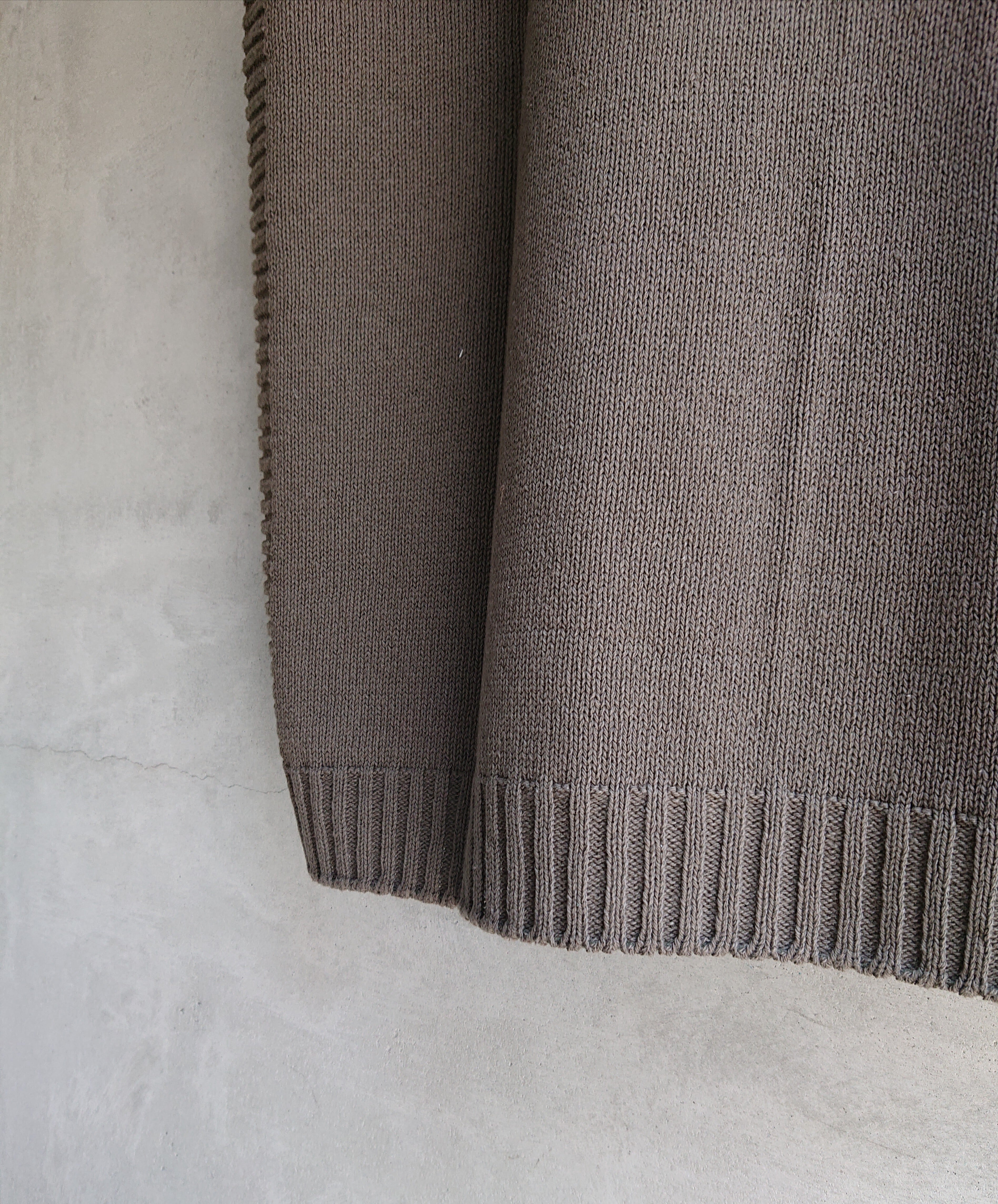 ヴィンテージのレッドクロスのニットベストをサンプリングした、コットンニットのジップベストです。当時のジップベストを再現し、フロントにジップを配置しています。また、ドライ感のある糸を使用しているため、春先から初夏にかけて快適に着用できます。ブラックとカーキの2色展開です。糸にドライ感と強度を持たせるために樹脂加工を施し、度詰で編むことであまり伸びず型崩れしないようにデザインしています。この製法の糸で編むことで、シャリ感があり涼しい印象のニットに仕上がっています。アームホールやネック、脇などの編み目はヴィンテージを再現しています。また、フロントに配置したジッパーは重さでベストが伸びないように、軽量なアルミジッパーを使用しており、型崩れの心配もありません。