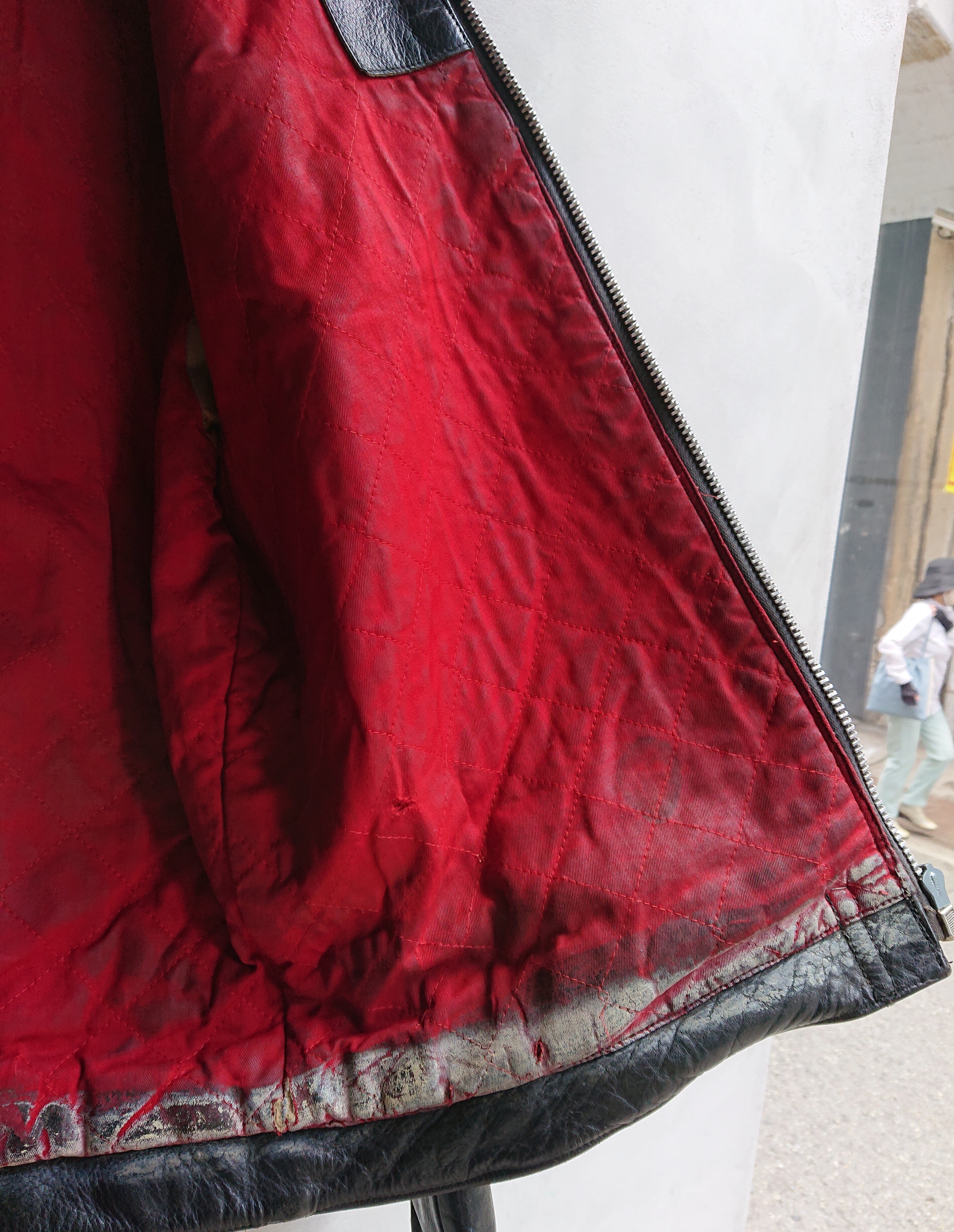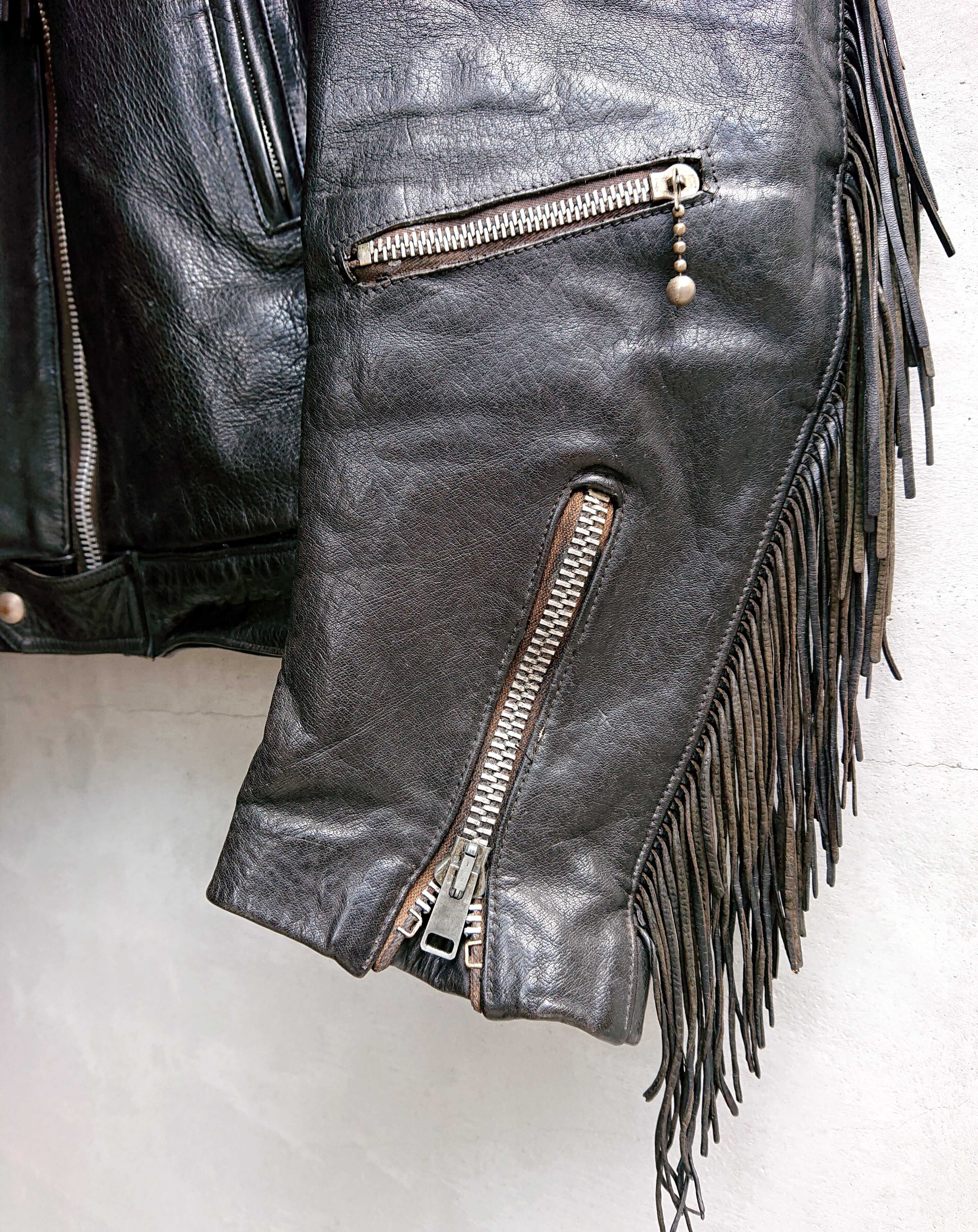 前身頃と背中、袖のアウトシームに配されてるフリンジがつきます。フロント、袖等にはAEROジッパーが装着。レザーはカウハイド。着用感あり。袖内側の生地にヤブレがありますが、腕をとおすときに注意してもらったら問題はありません。