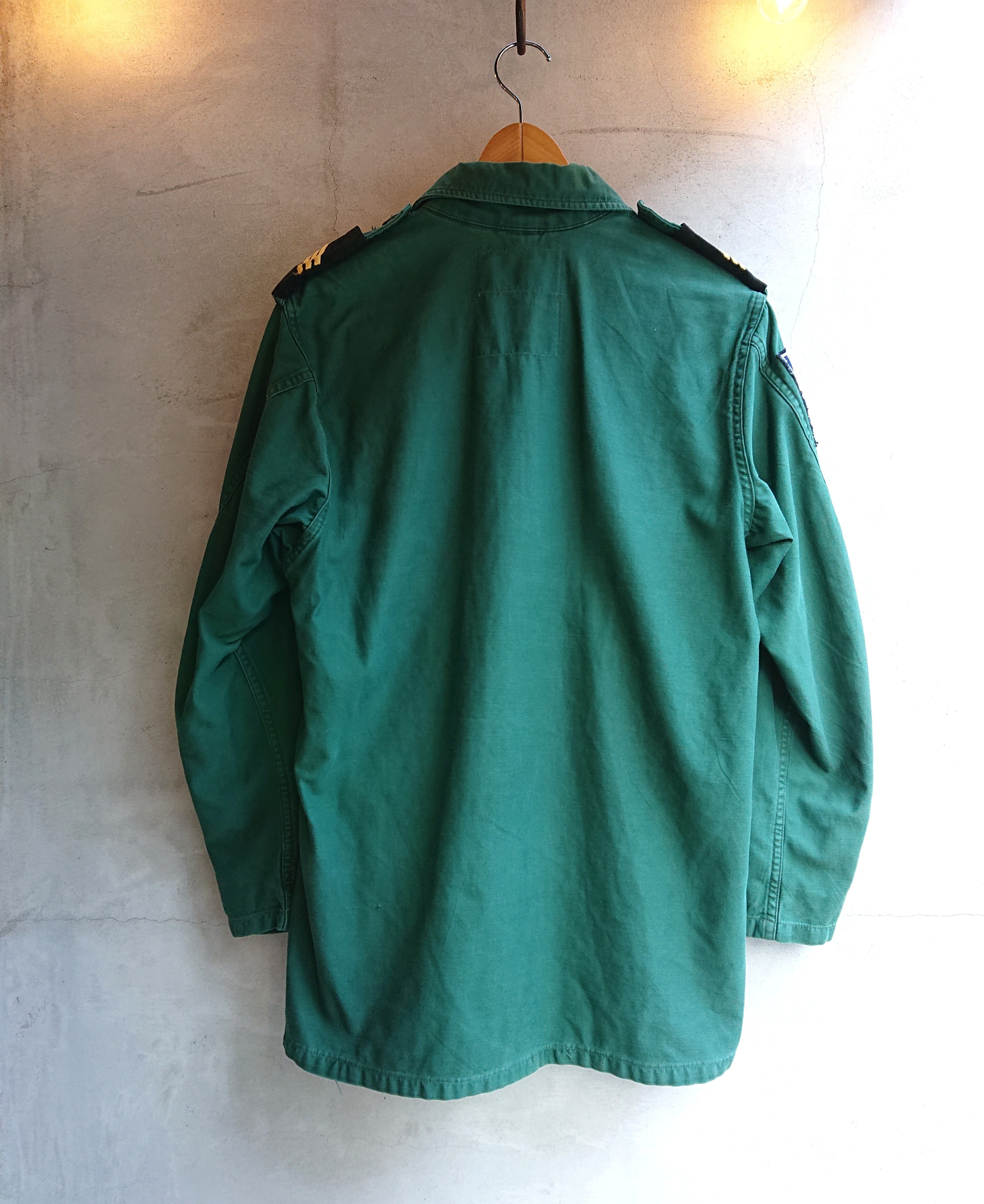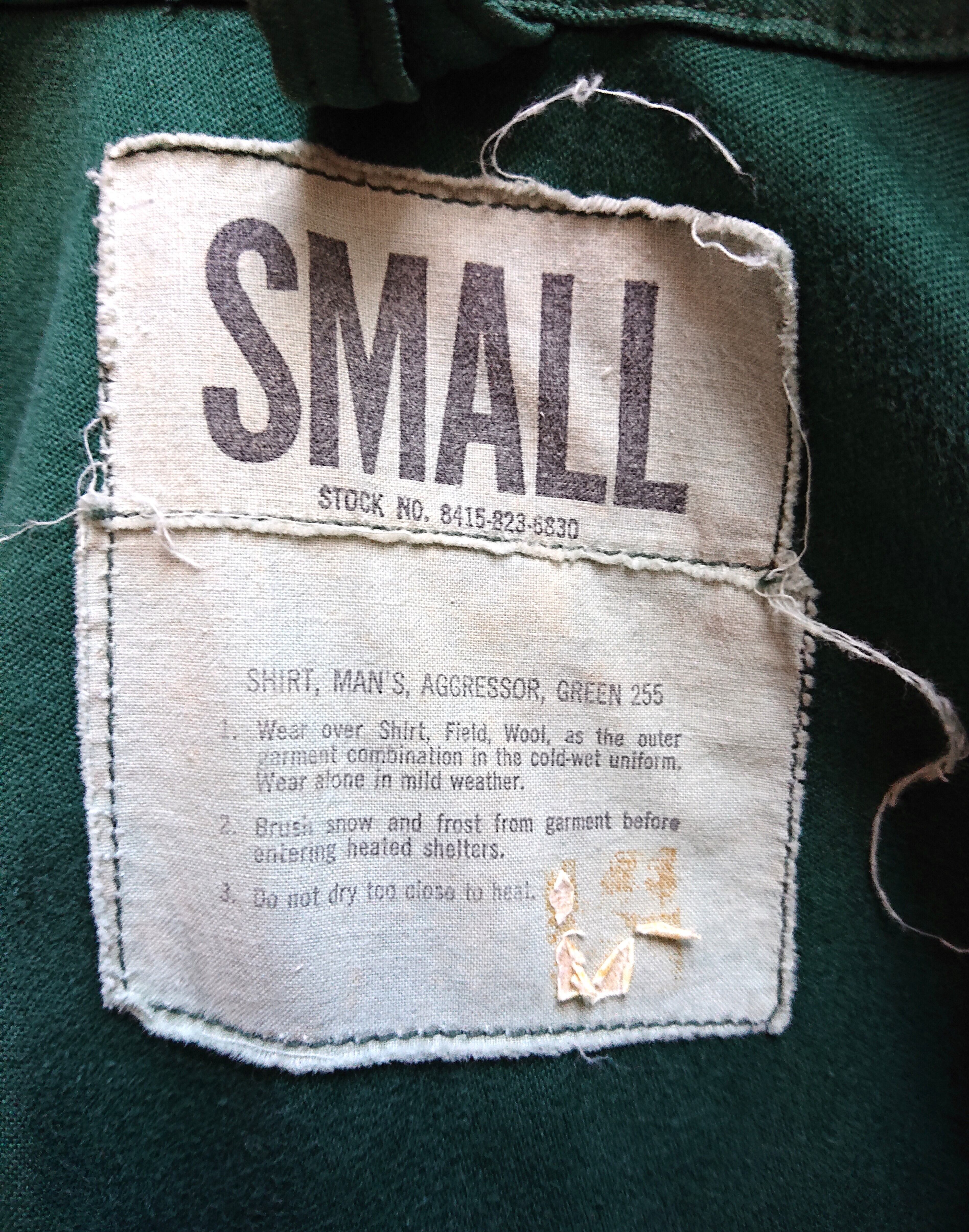 1960年代 US ARMY アグレッサーシャツになります。冷戦時代に存在した軍事演習や訓練時に仮想敵国側を演じる部隊"アグレッサー"のユニフォームでカラーはGREEN SHADE255と呼ばれる濃いめのグリーン。素材はコットンサテンで襟には襟章を取り付けるように大き目のハトメがついてます。本来ベルトがつくのですが欠損しています。