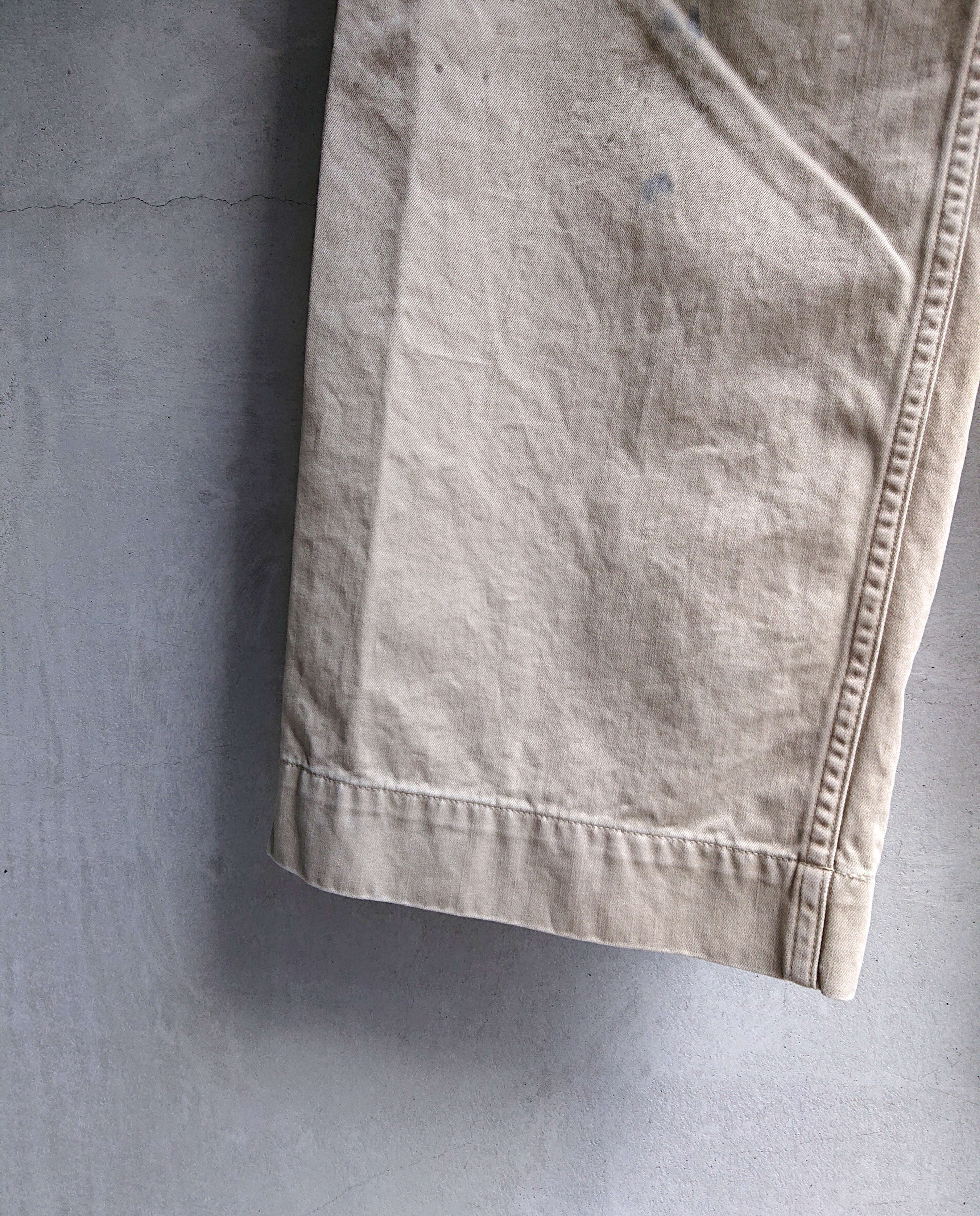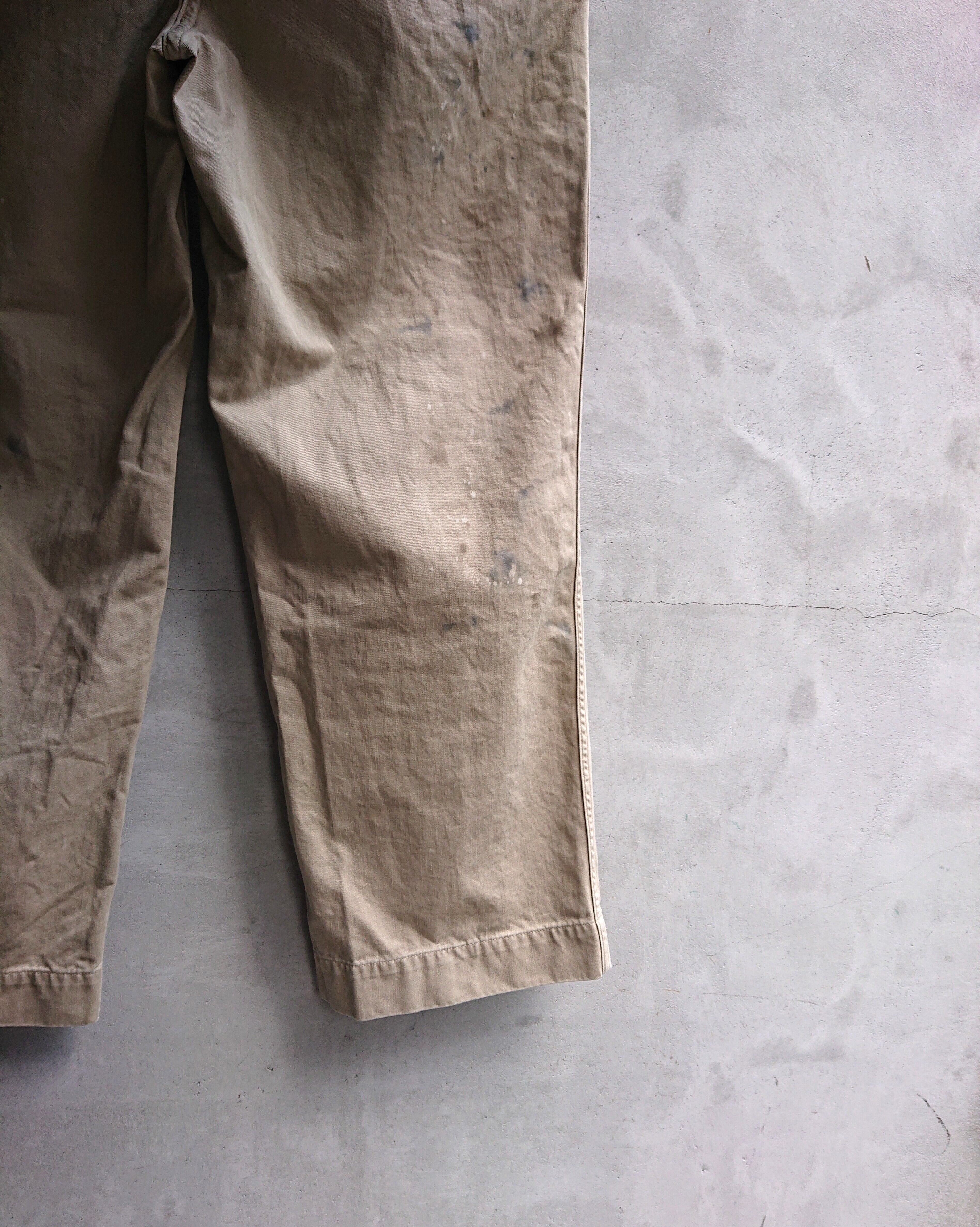 1941年から1942年にかけて、US ARMYで採用され たメタルボタン搭載の最初期型チノトラウザー。 今までBOW WOWにより製作された41 KHAKIの原型 にあたり、生産性を考えて省かれたもみ玉縁ポケッ ト、中高ベルトループ、メタルボタンなどのディテ ィールは、現代の服から感じえない趣を宿していま す。脇のチェーンWステッチ、汚し加工、水染みなどの ディテールは継承、小さな拘りを詰め込んだ渾身の 一本。