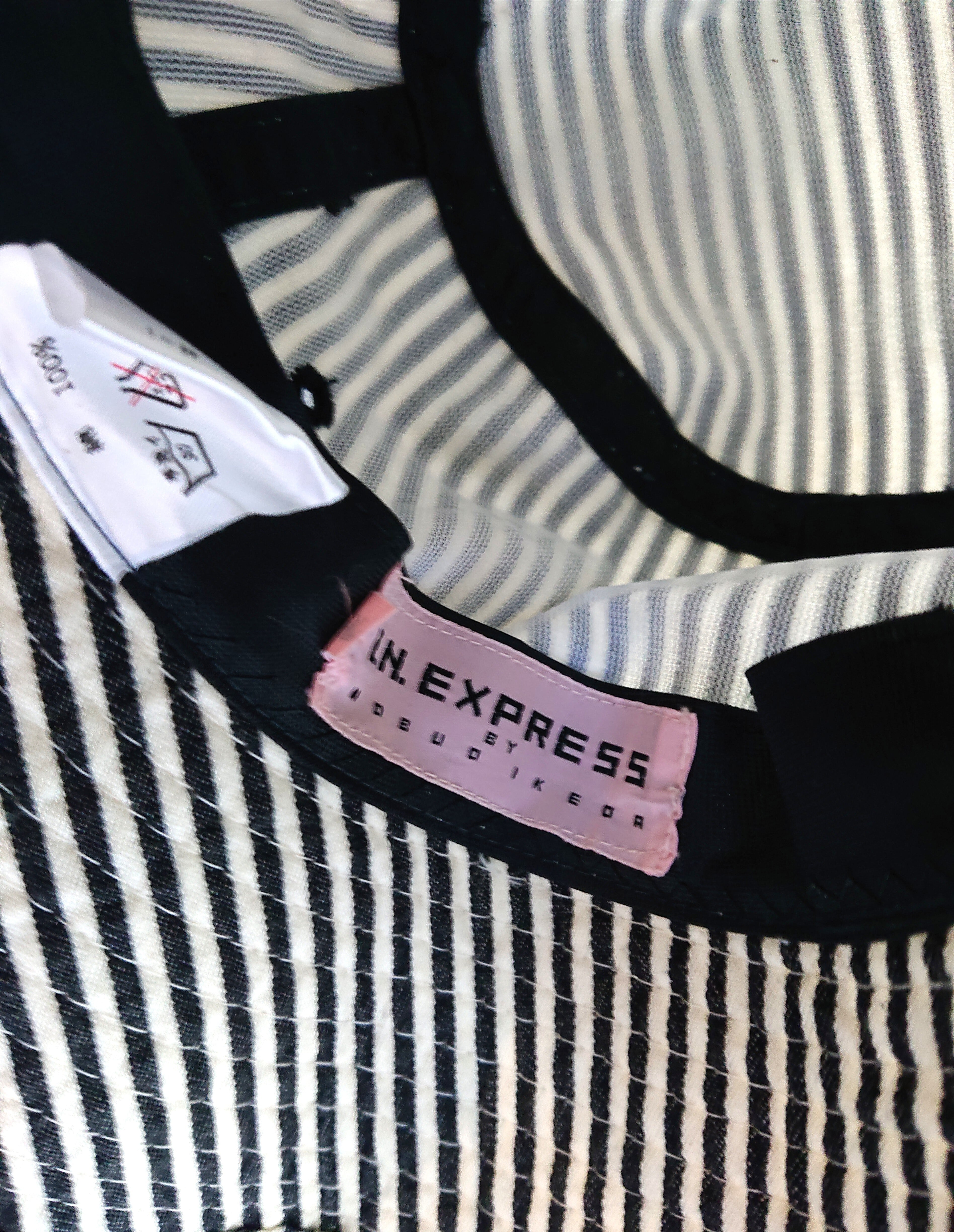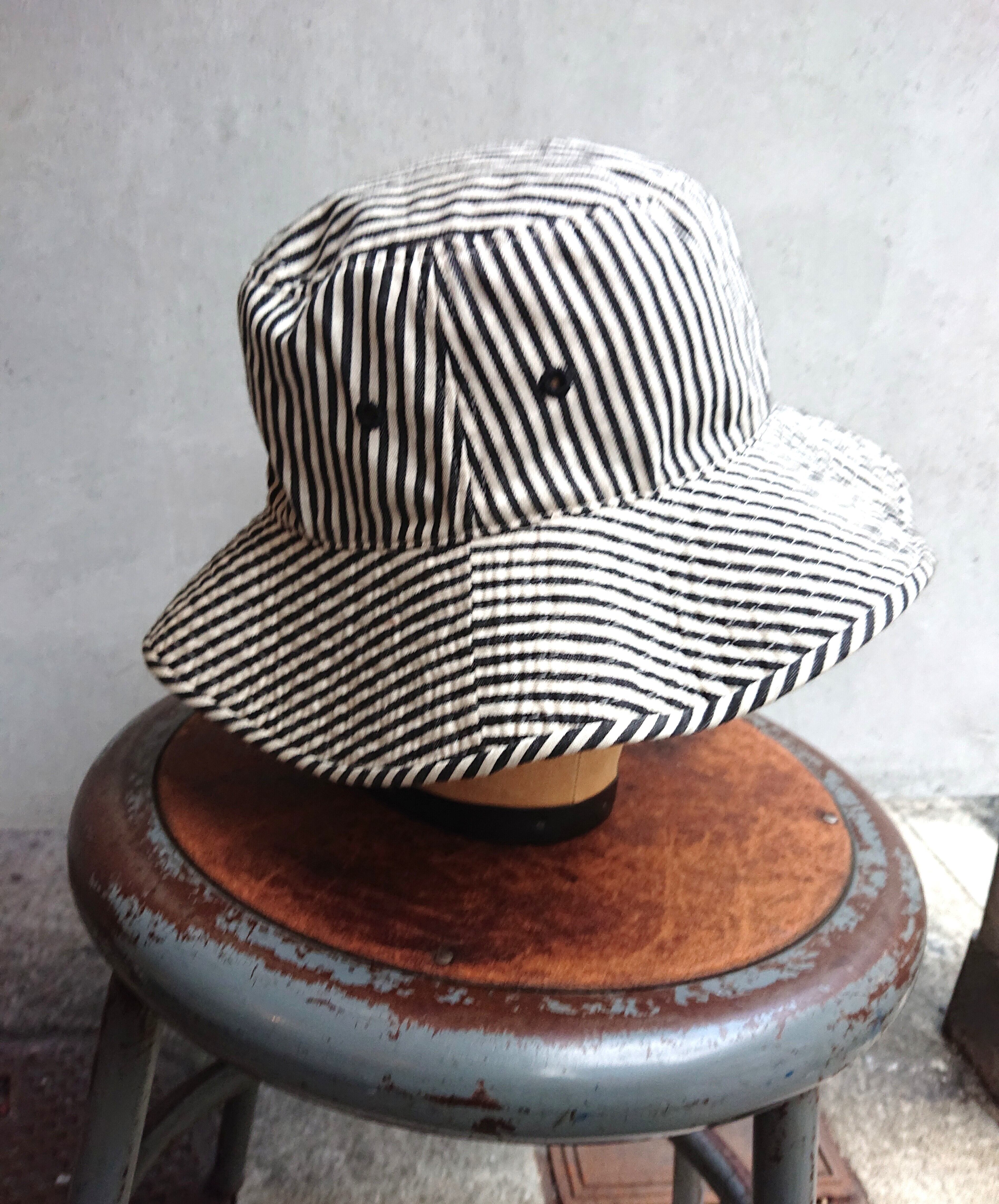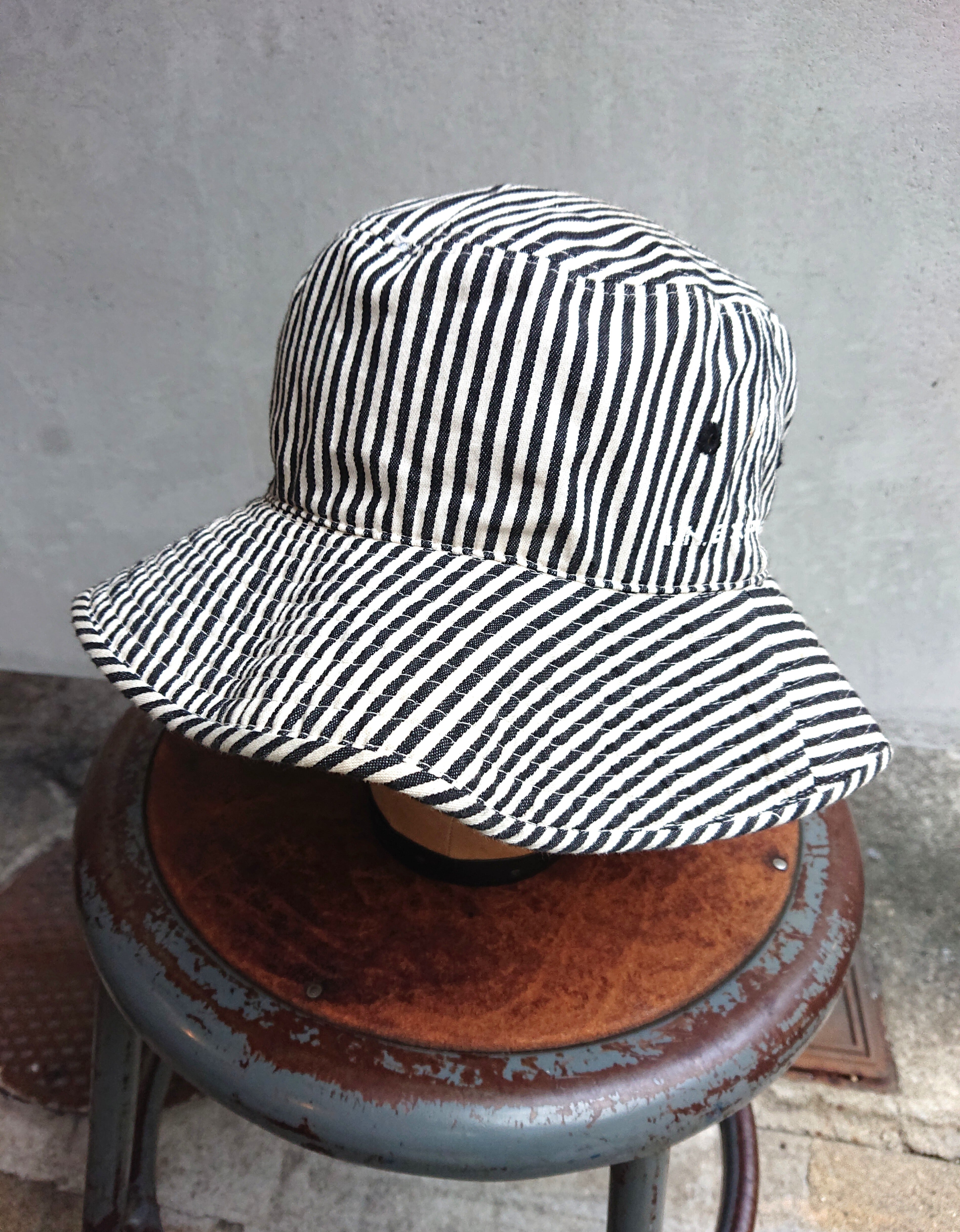 今回紹介するのはI.N. EXPRESS BY NOBUO IKEDAのハット。バケットハットのタイプでヒッコリーストライプみたいな感じ。左柄にブランドネームが入ります。着用感あり。左側に小さな染み汚れがありますが気にならない程度と思います。