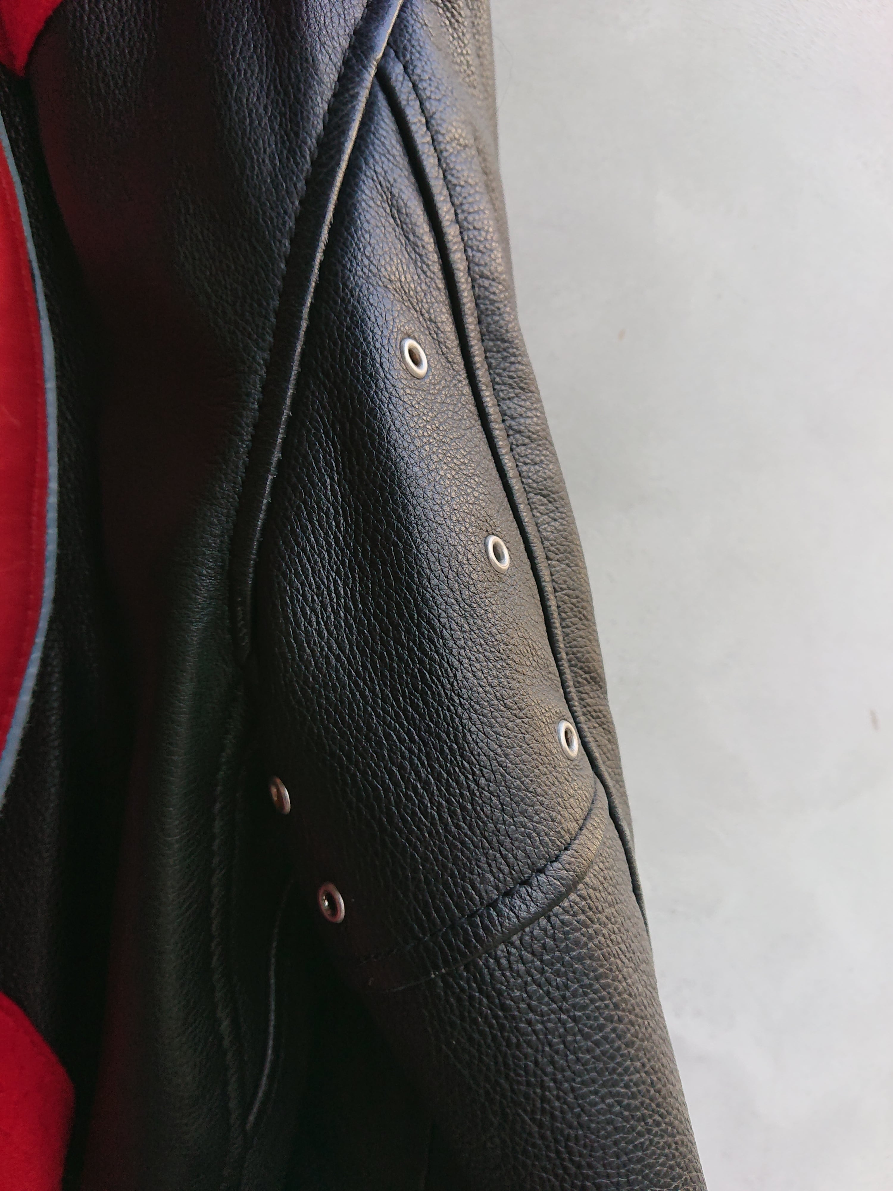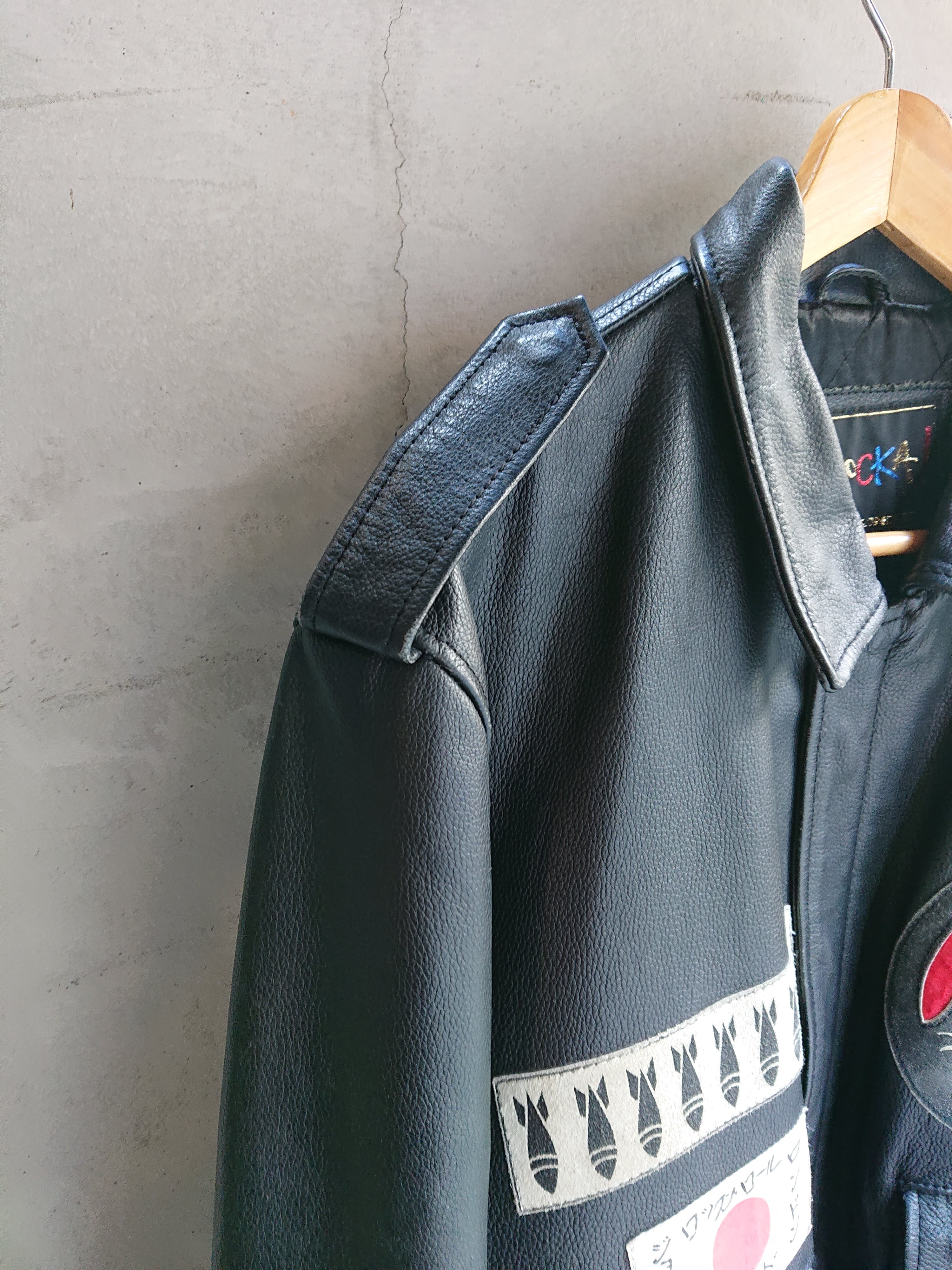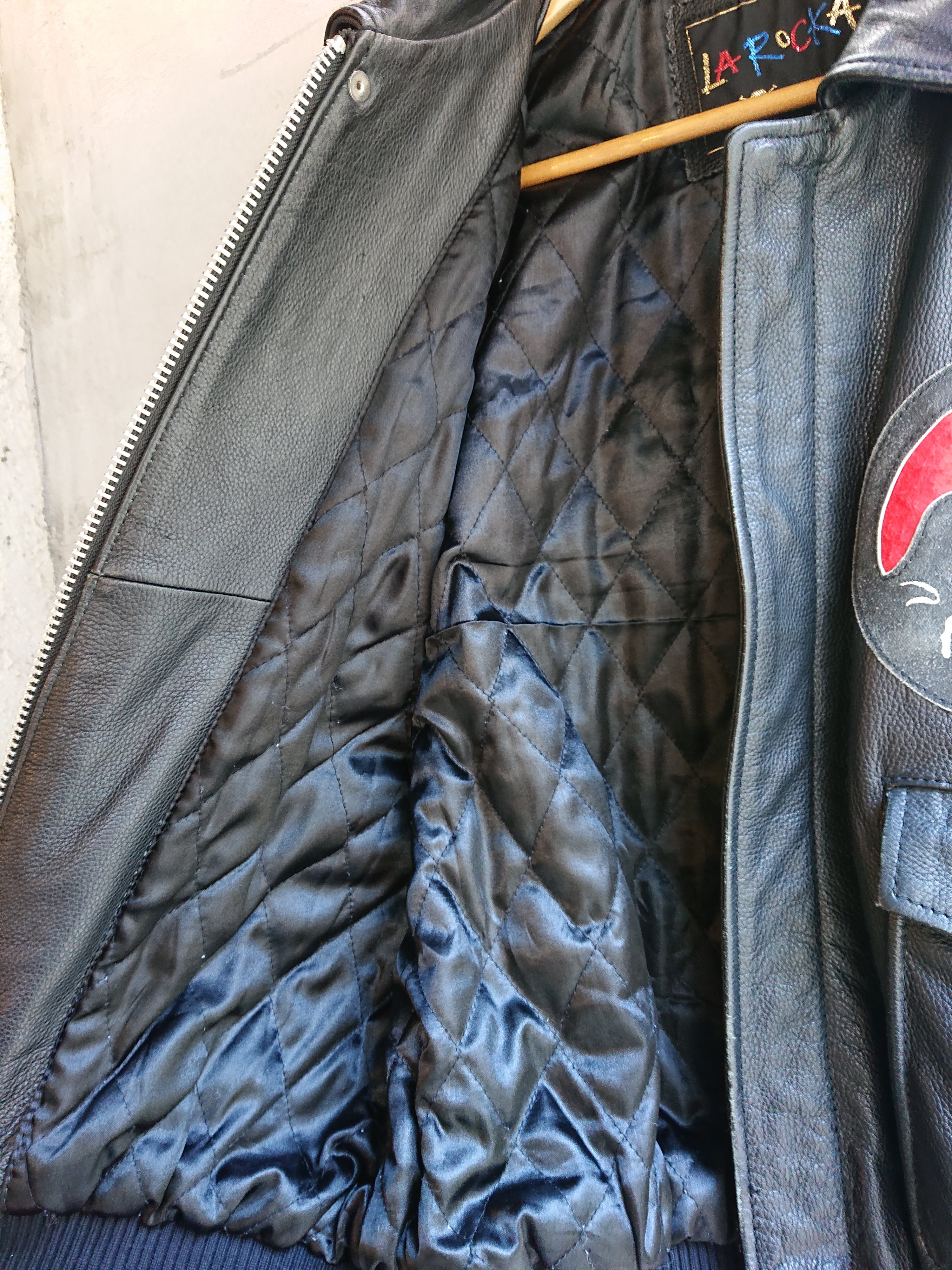 1980年代 LAROCKAの名作の1つにあがる"SKY BANDIT"。今回紹介するのは1990年代に再販されたものになります。ボンバージャケットにフロント、背中にはインパクトあるワッペンが目を奪います!フライトジャケットのA-2を思わせる雰囲気もまた男前。レザーは牛革。内側はキルティング仕様。右袖口に擦れがありますがその他は全体的にコンディションも良いほうかと思います。
