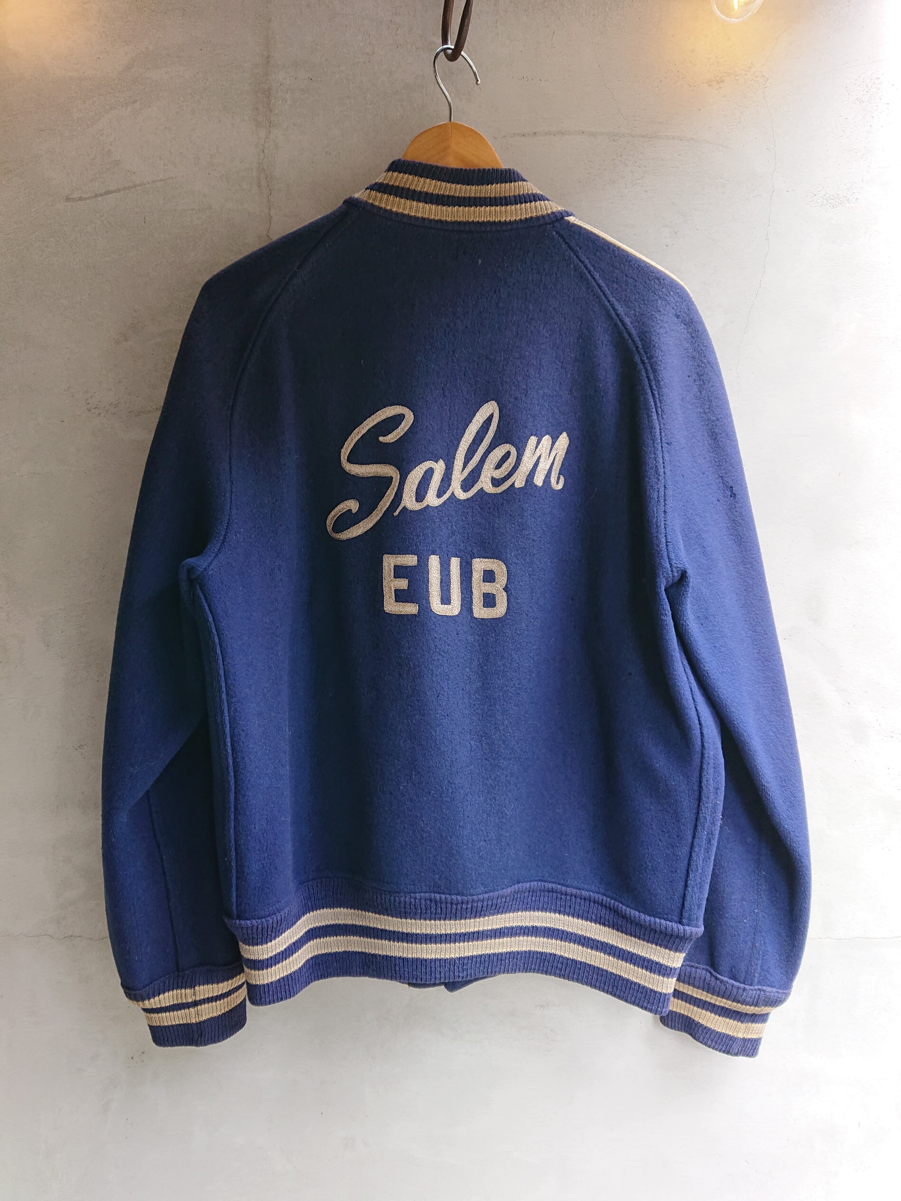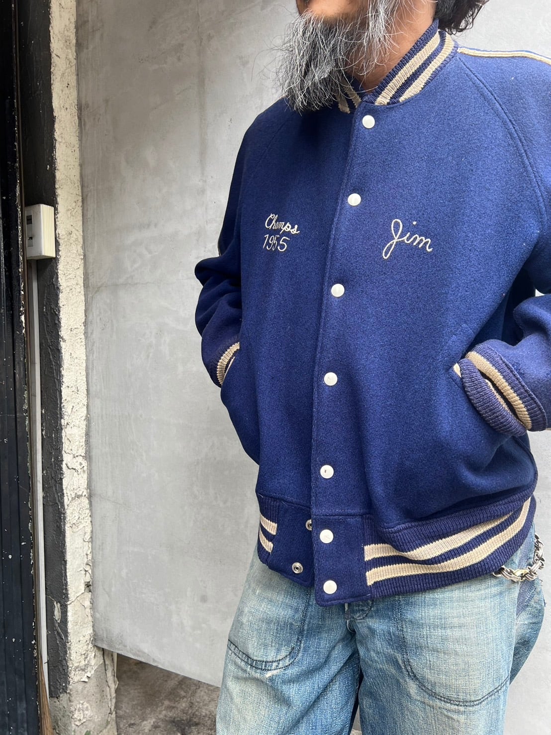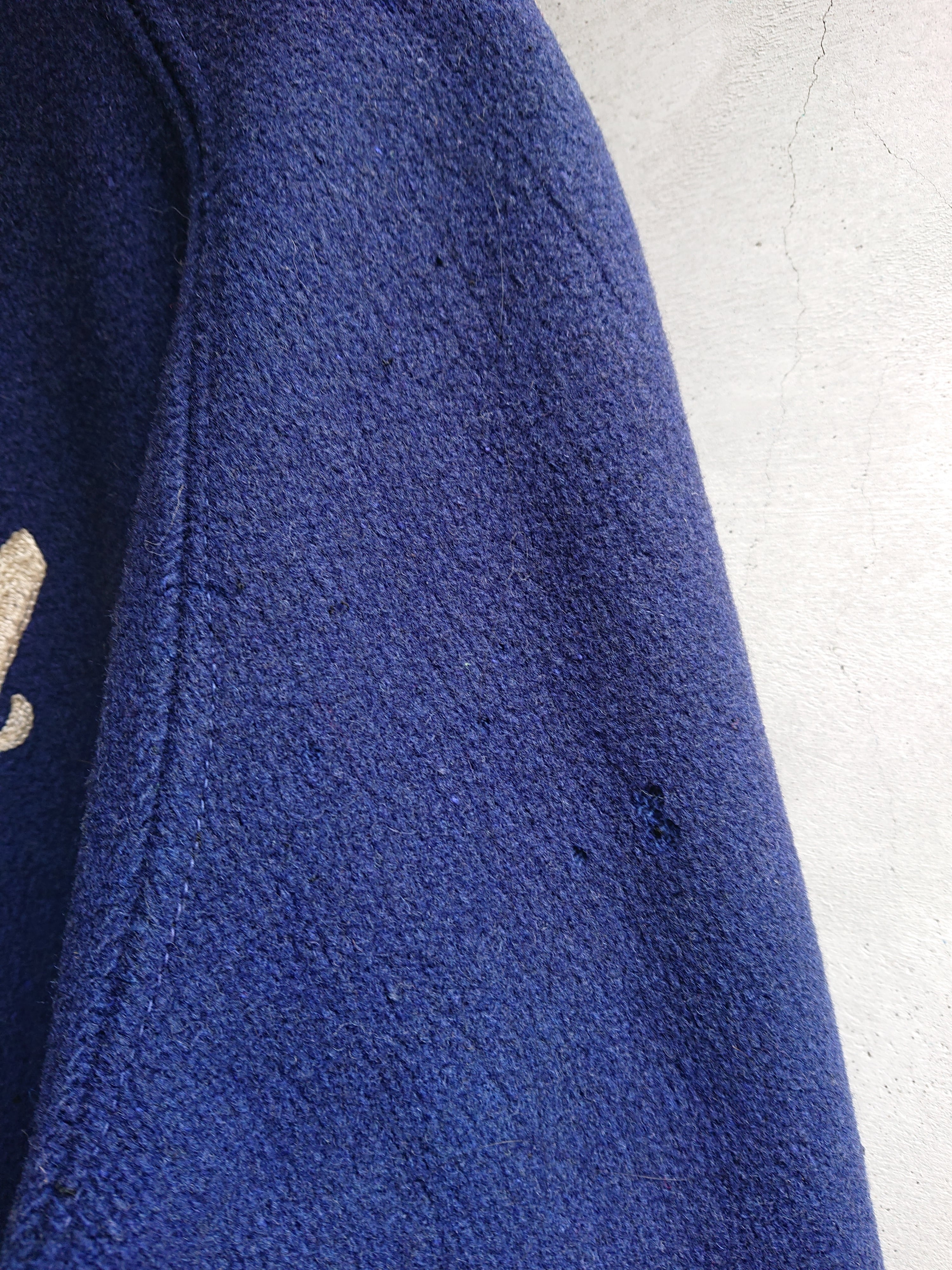1950年代 VINTAGE AWARD JACKETになります。ラグランスリーブでオールメルトン。ネイビーカラーに両袖にテープラインにネイビーカラーのヌバックレザーのエルボーパッチが縫い付けられており、背中と胸元には刺繍が入ります。