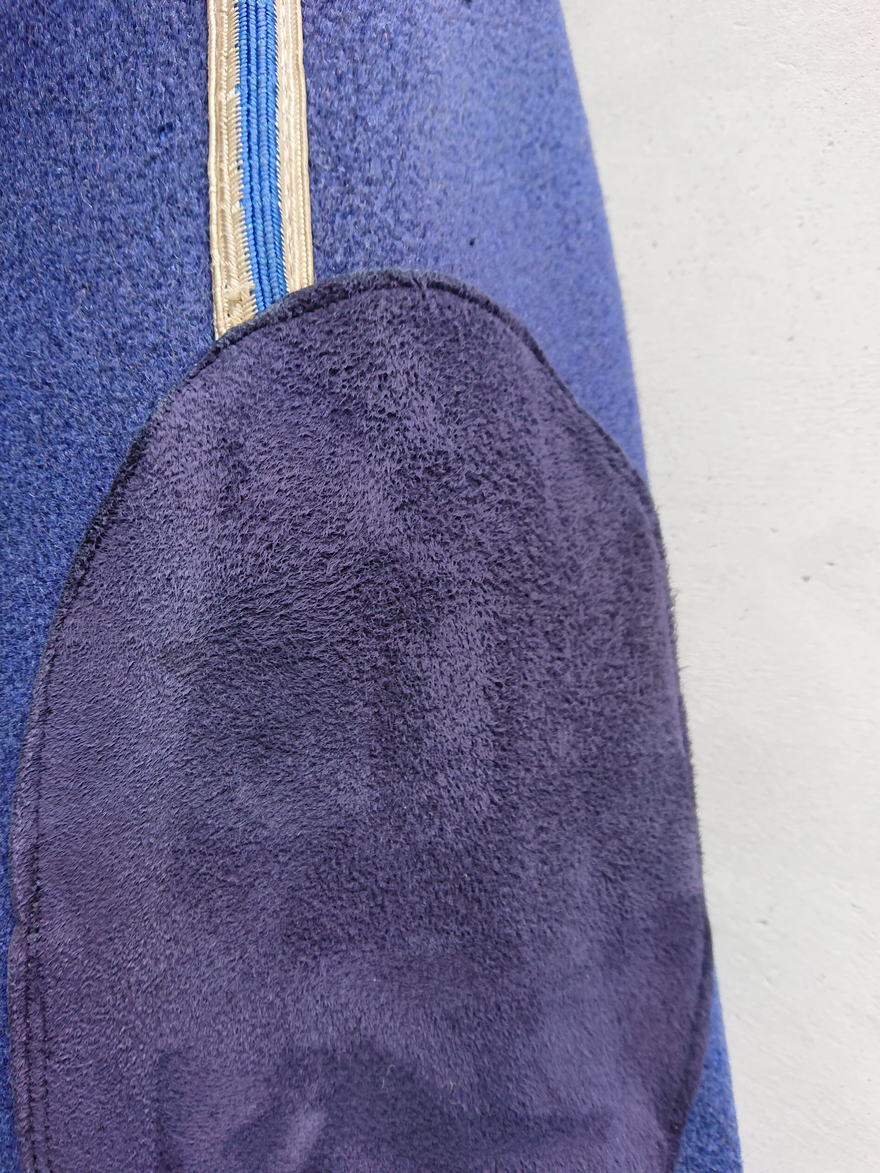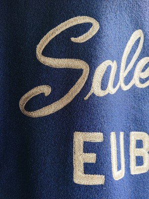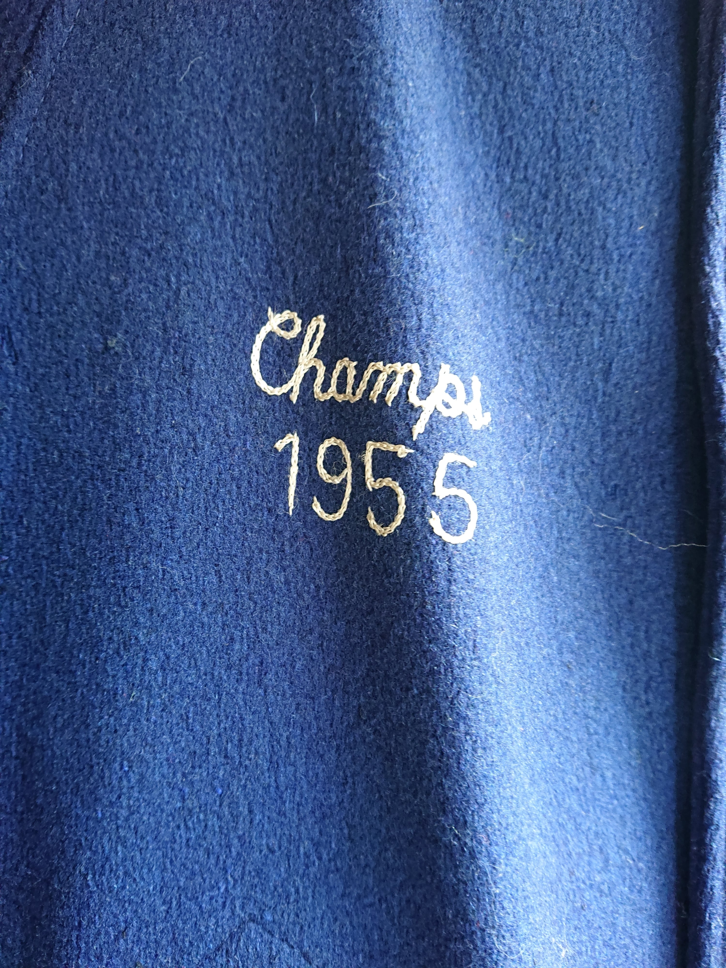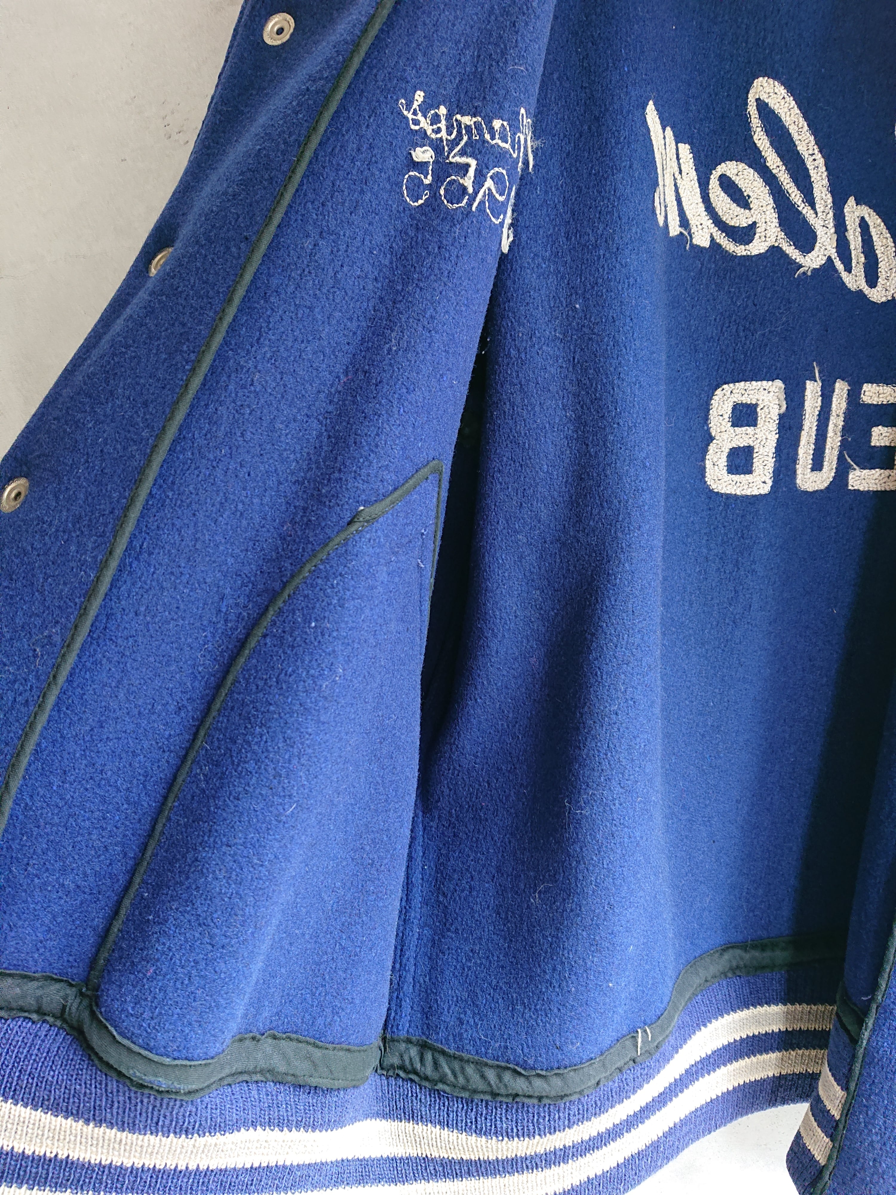 1950年代 VINTAGE AWARD JACKETになります。ラグランスリーブでオールメルトン。ネイビーカラーに両袖にテープラインにネイビーカラーのヌバックレザーのエルボーパッチが縫い付けられており、背中と胸元には刺繍が入ります。