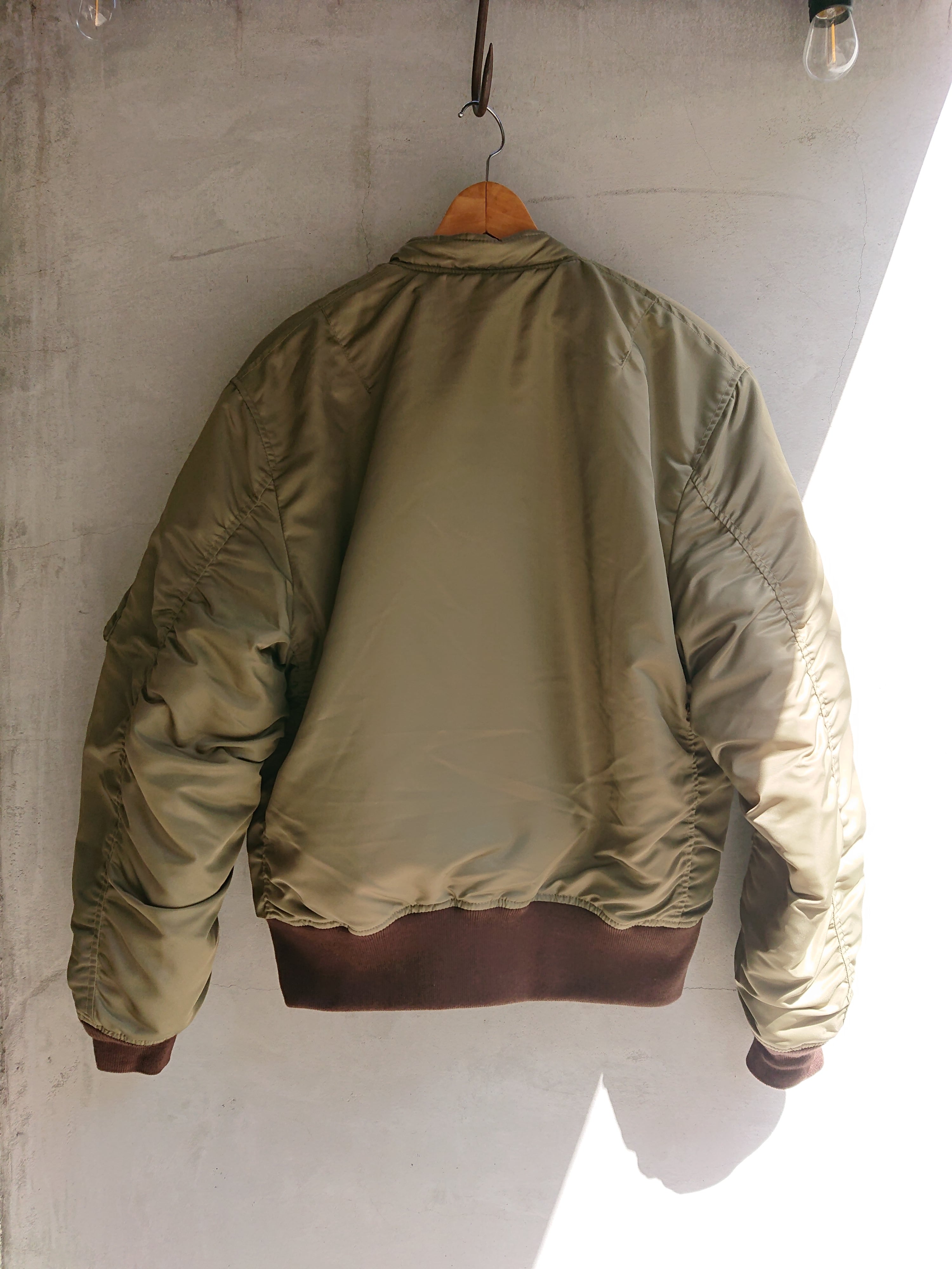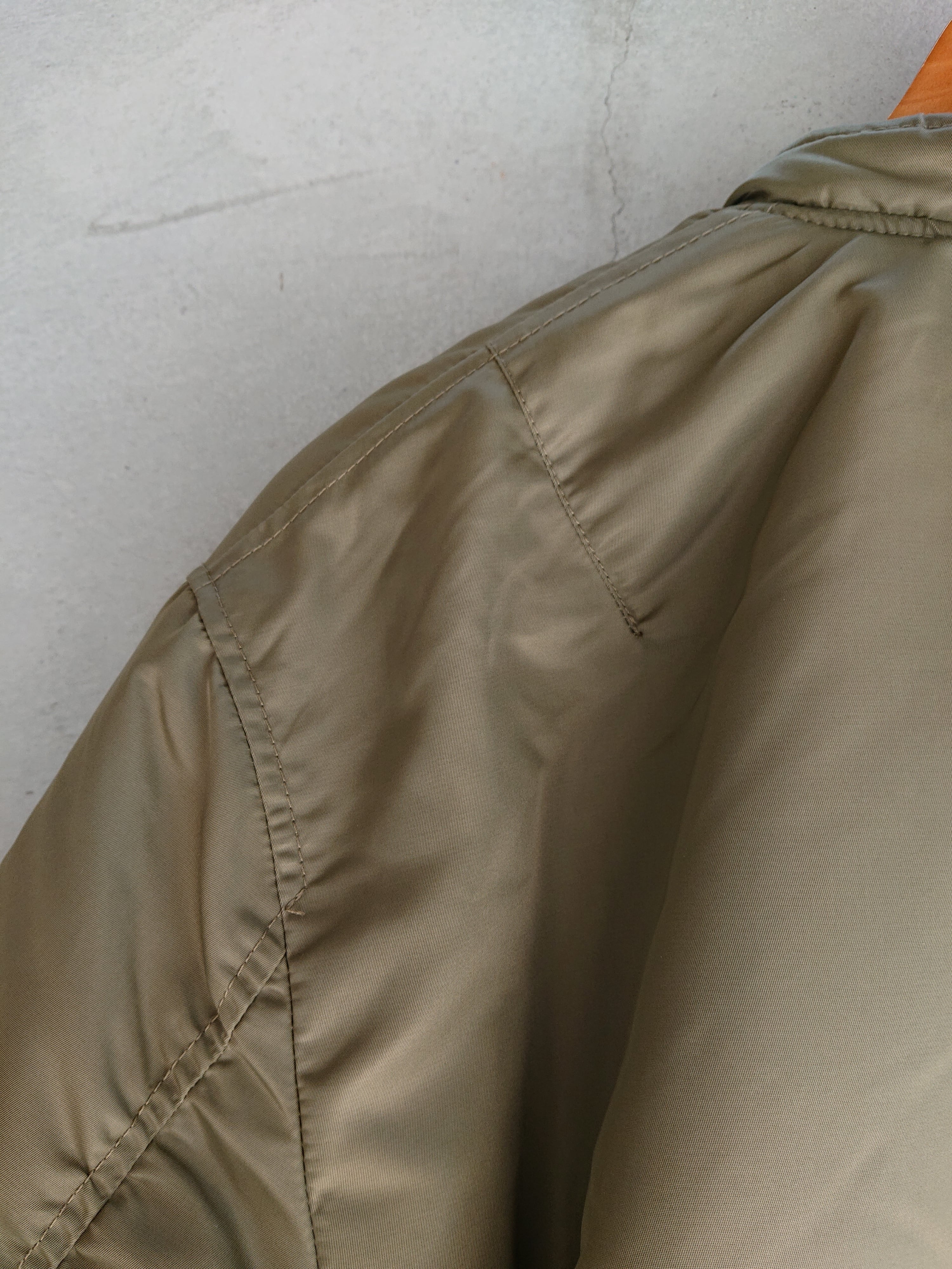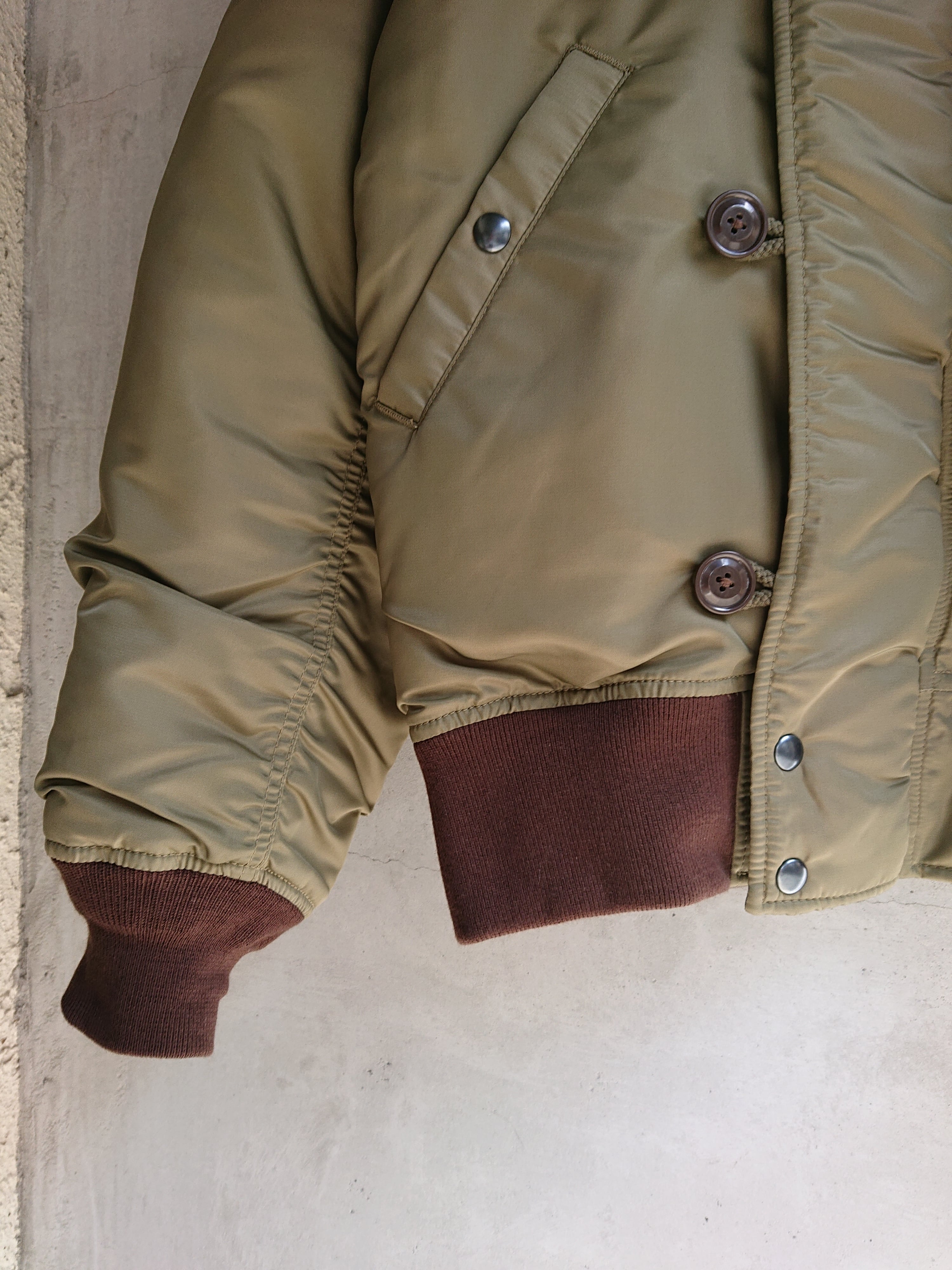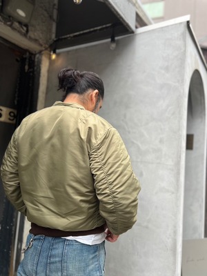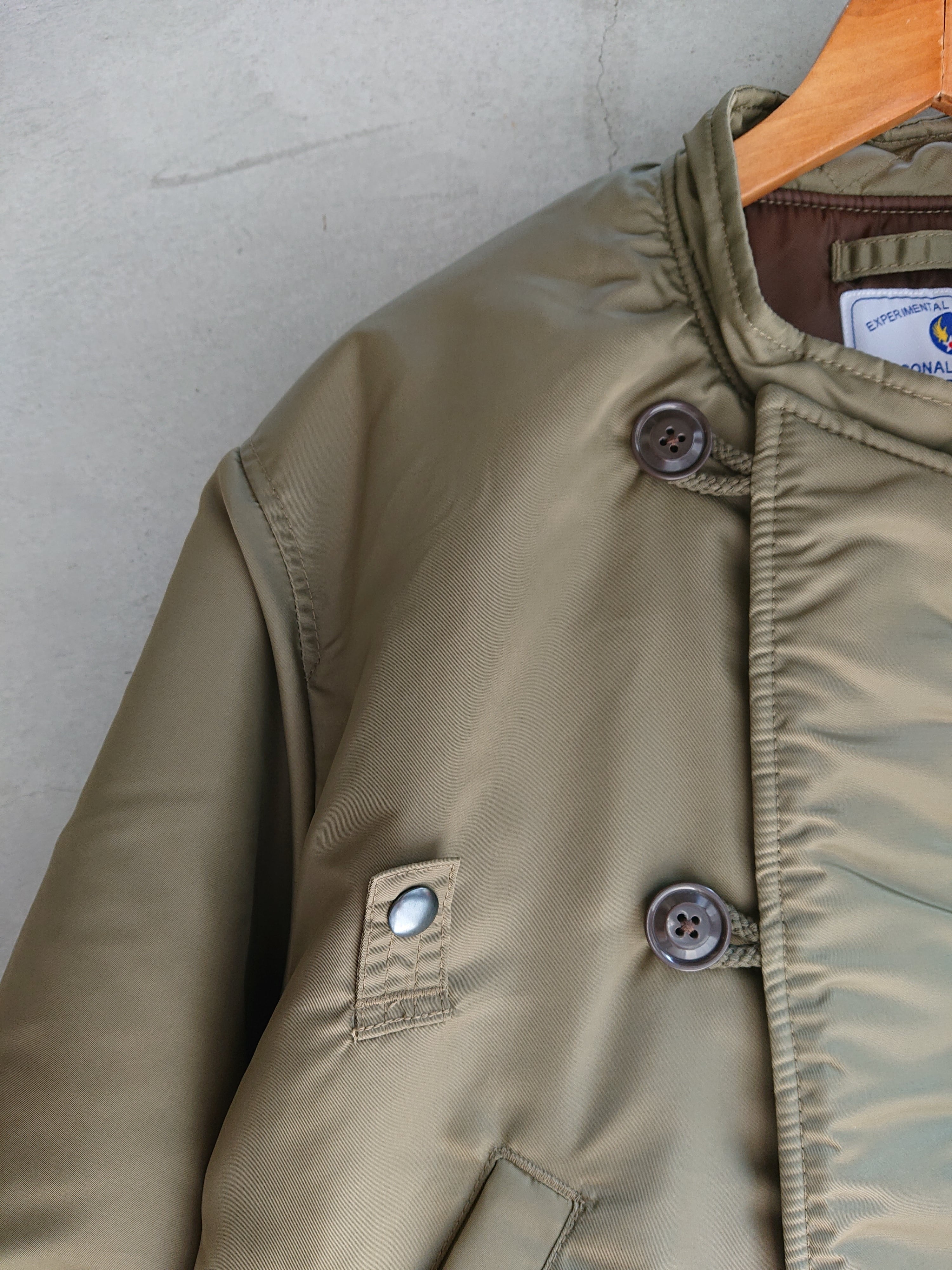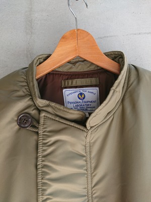 1945年に採用されたヘビーゾーン向けのN-2フライトジャケットを基に、制作されたTEST SAMPLEモデルになります。昔の資料や、当時の写真などを元に現代のニュアンスを取り入れたフライトジャケット。当時のPersonal Equipment Laboratory(個人装備研究所)テストサンプルラベルも再現されてます。本来のN-2はオリーブドラブのボディカラーにN-2Bにも続くフードファーが特徴ですが、こちらのTEST SAMPLEモデルは大胆にもフードをファスナーの脱着式に変更し、スタンドカラーにアレンジ。ショート丈のN-2は狭いコックピット内での機動性に優れ、ヘルメットの上から着用可能な大きなフードが特徴でしたが、さらに快適性を高めるためにフードを脱着式に改良したと思われます。WAIPER.incでは襟ぐりのファスナーを排除し、最大の特徴である首回りをよりすっきりと仕上げられ、シルエットは大人が着ても子供っぽくならないリラックス感のあるオーバーサイズに。昔の良いディテールと現代のファッションがうまく融合できているフライトジャケットです。アームのパッカリングなどフライトジャケットの魅力的なディテールもしっかりと再現された、WAIPER.inc "U.S.A.F. PERSONAL EQUIPMENT LABORATORY TYPE N-2 "になります。