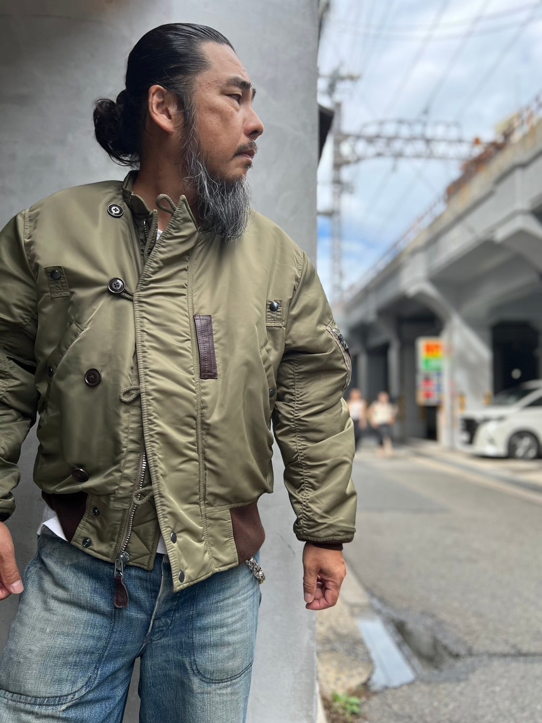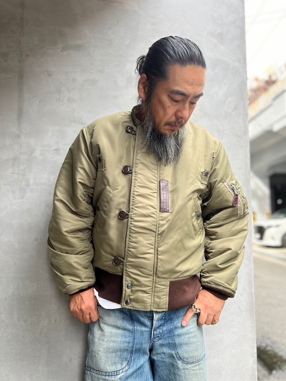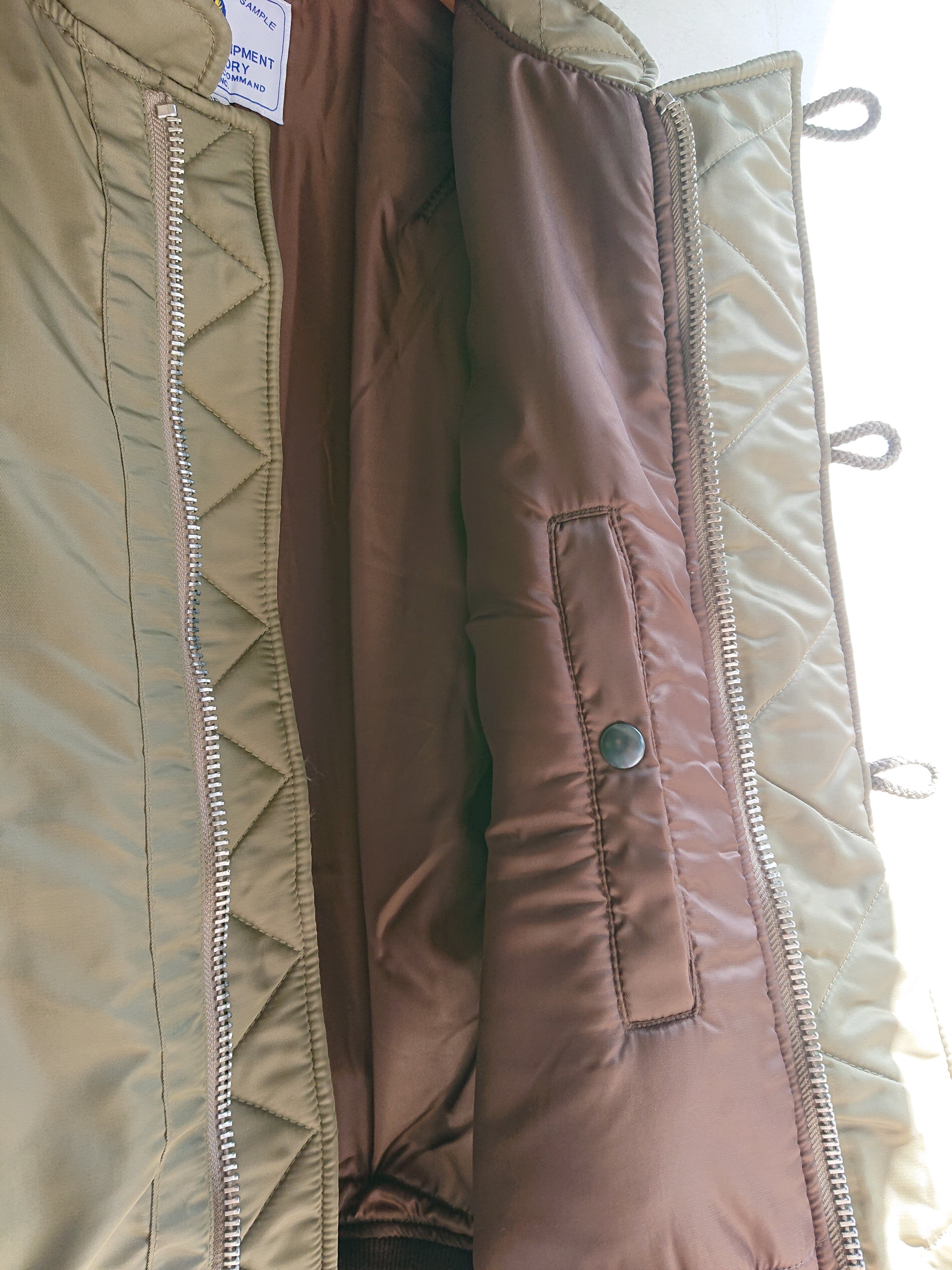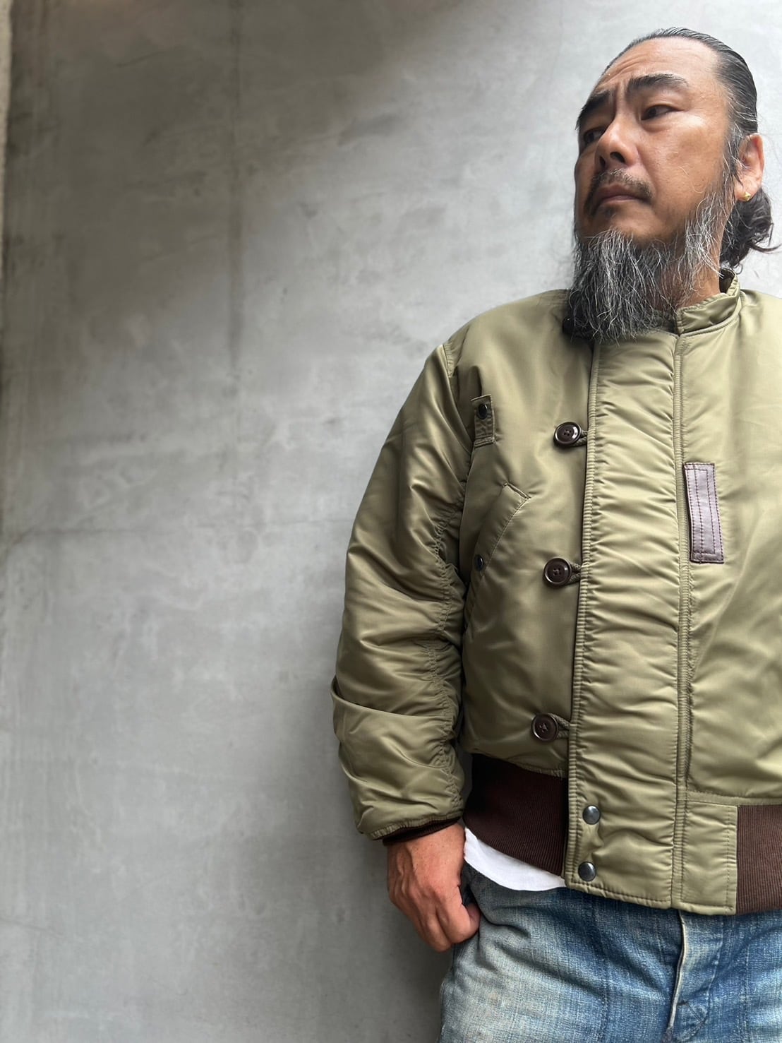 1945年に採用されたヘビーゾーン向けのN-2フライトジャケットを基に、制作されたTEST SAMPLEモデルになります。昔の資料や、当時の写真などを元に現代のニュアンスを取り入れたフライトジャケット。当時のPersonal Equipment Laboratory(個人装備研究所)テストサンプルラベルも再現されてます。本来のN-2はオリーブドラブのボディカラーにN-2Bにも続くフードファーが特徴ですが、こちらのTEST SAMPLEモデルは大胆にもフードをファスナーの脱着式に変更し、スタンドカラーにアレンジ。ショート丈のN-2は狭いコックピット内での機動性に優れ、ヘルメットの上から着用可能な大きなフードが特徴でしたが、さらに快適性を高めるためにフードを脱着式に改良したと思われます。WAIPER.incでは襟ぐりのファスナーを排除し、最大の特徴である首回りをよりすっきりと仕上げられ、シルエットは大人が着ても子供っぽくならないリラックス感のあるオーバーサイズに。昔の良いディテールと現代のファッションがうまく融合できているフライトジャケットです。アームのパッカリングなどフライトジャケットの魅力的なディテールもしっかりと再現された、WAIPER.inc "U.S.A.F. PERSONAL EQUIPMENT LABORATORY TYPE N-2 "になります。