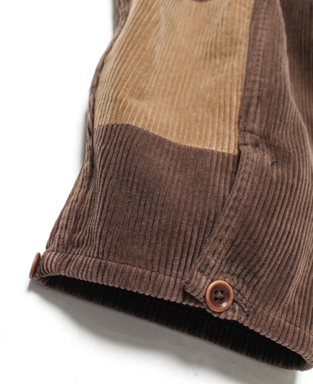 このコーデュロイのセットアップは、当時の雰囲気 をイメージし製作。一着を大事に着続けたリペアの 様子をデザインとして表現し、過去の時代感を漂わ せています。1930年代に完成されたプルオーバーシ ャツをモチーフにし、その特徴的なデザインを現代に蘇らせました。