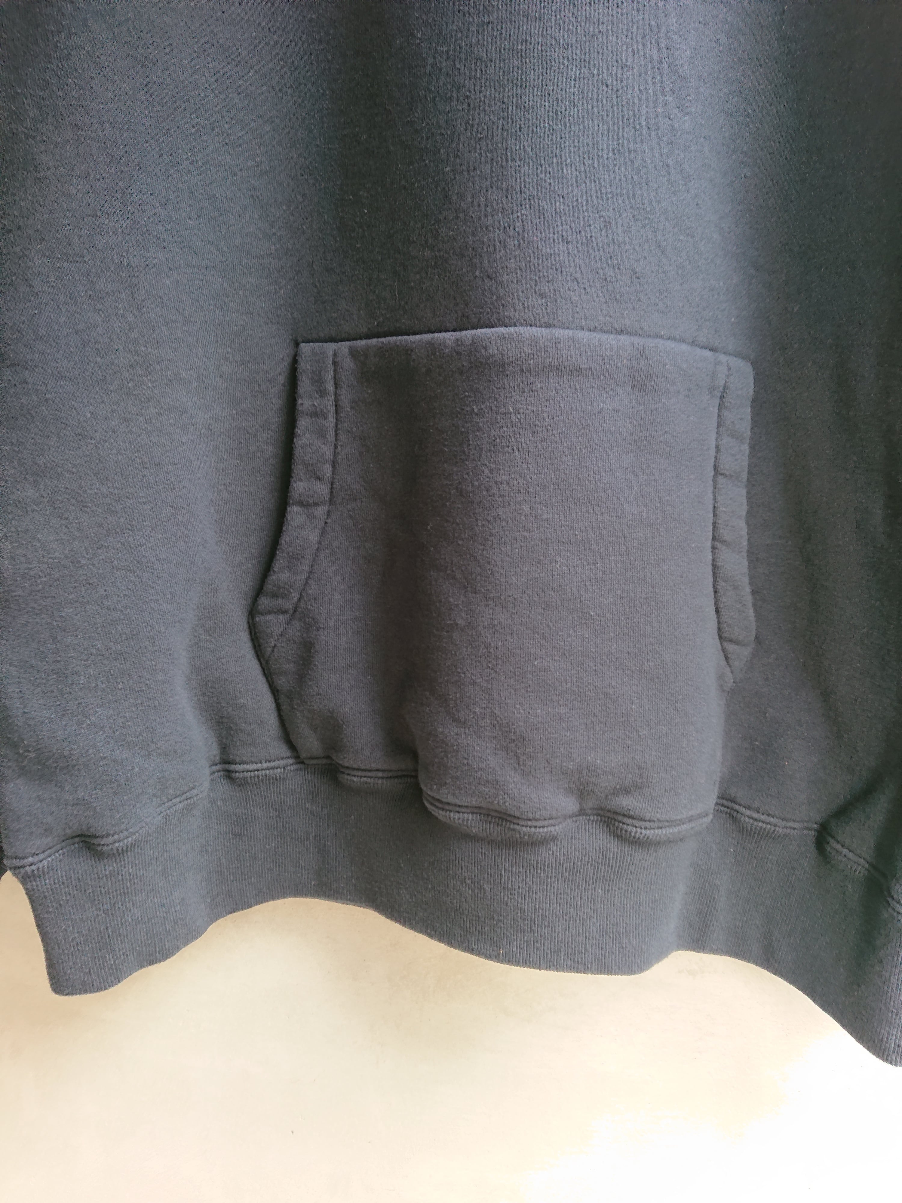 100%コットンのライトウェイトの裏毛を2重で使用することで、しっかりとしたスウェットになるようにしています。着用の際にゴワゴワしないように柔らかく編み立てました。ネック部分はバインダーにVガゼットをはめ込んだヴィンテージスタイル。フロントにはカンガルーポケット。生地を2重で使用したダブルフェイスの仕様です。
