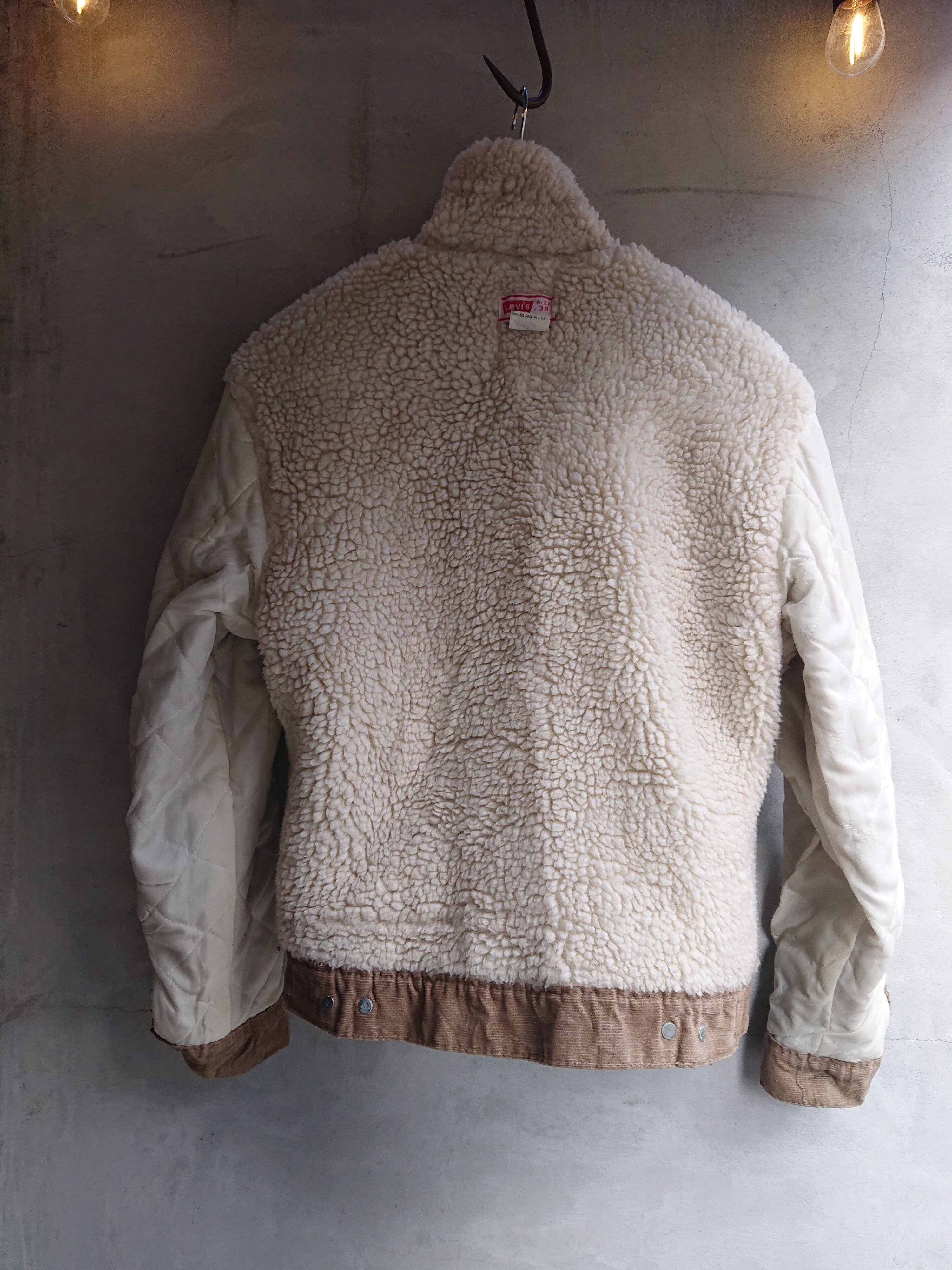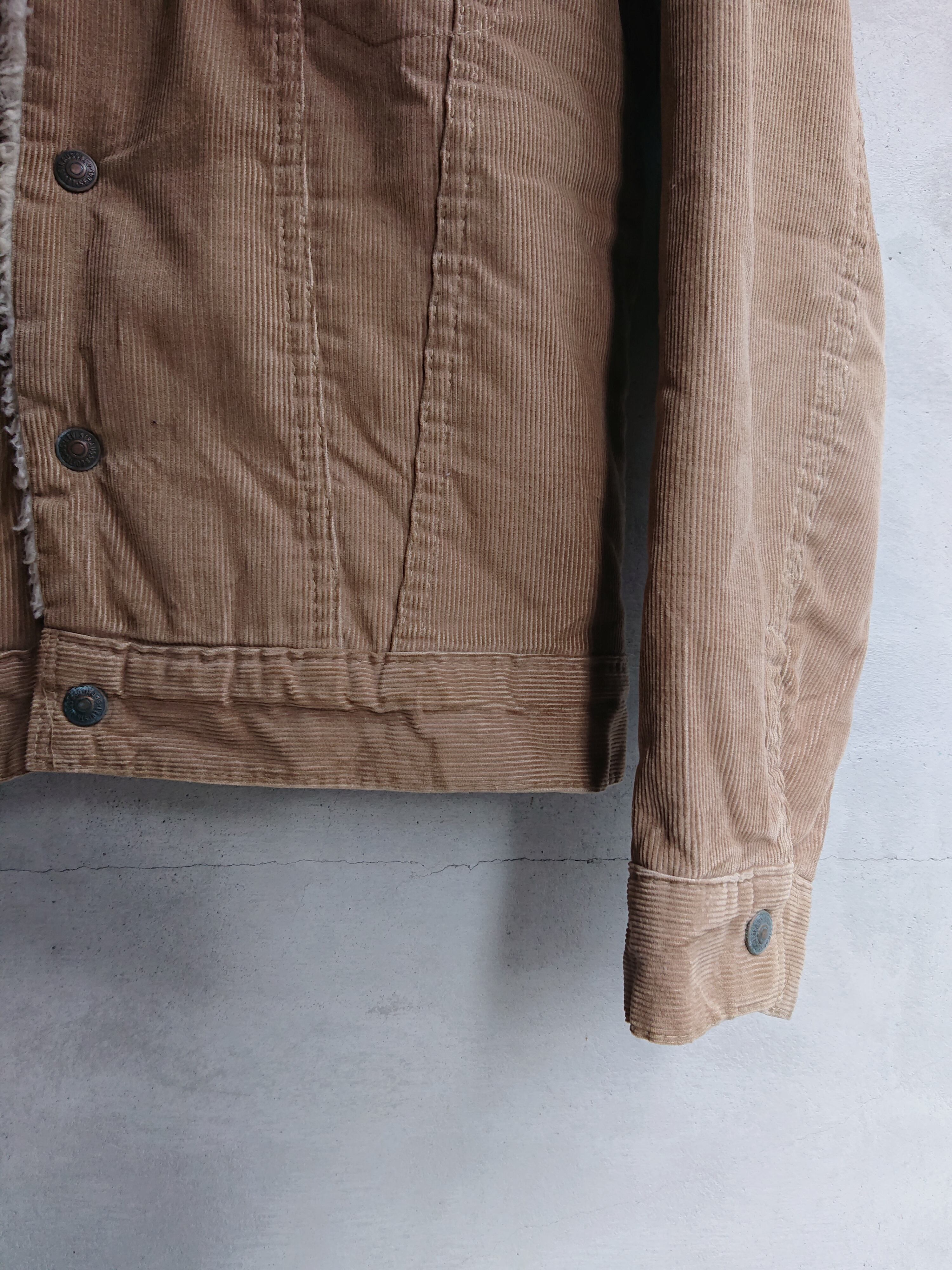 コーデュロイボアになります。コンディションが良く、裏地も綺麗な一着です。私も長年愛用してるジャケットの1つで、個人的にですが裏のボア面でも着ることも多く、リバーシブルではないものをリバーシブル仕様としてスタイリングを楽しんでます。是非色々なコーディネートにプラスしてもらえたらと思います。