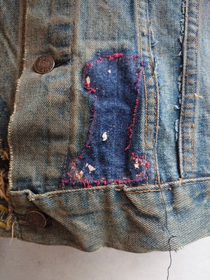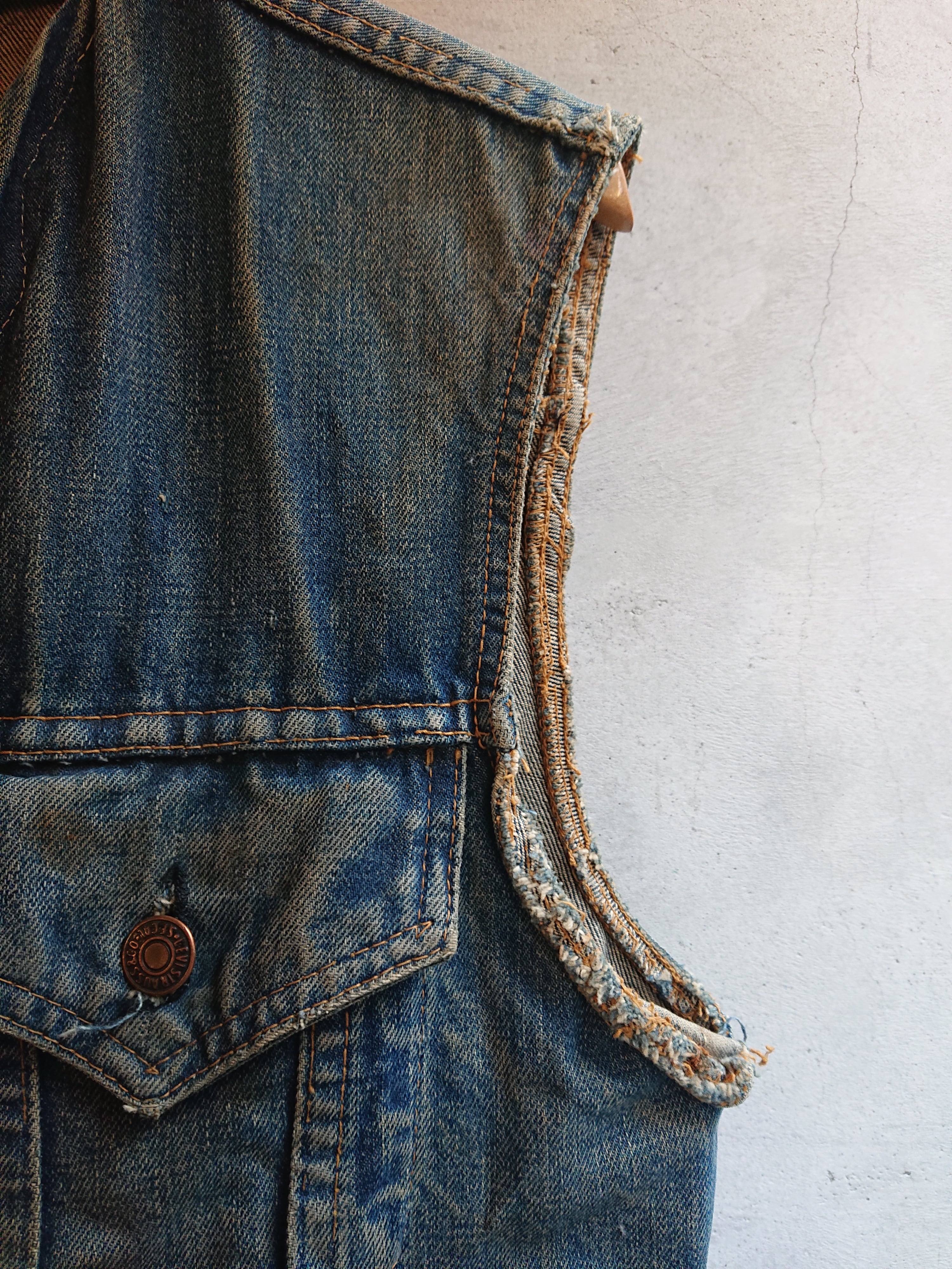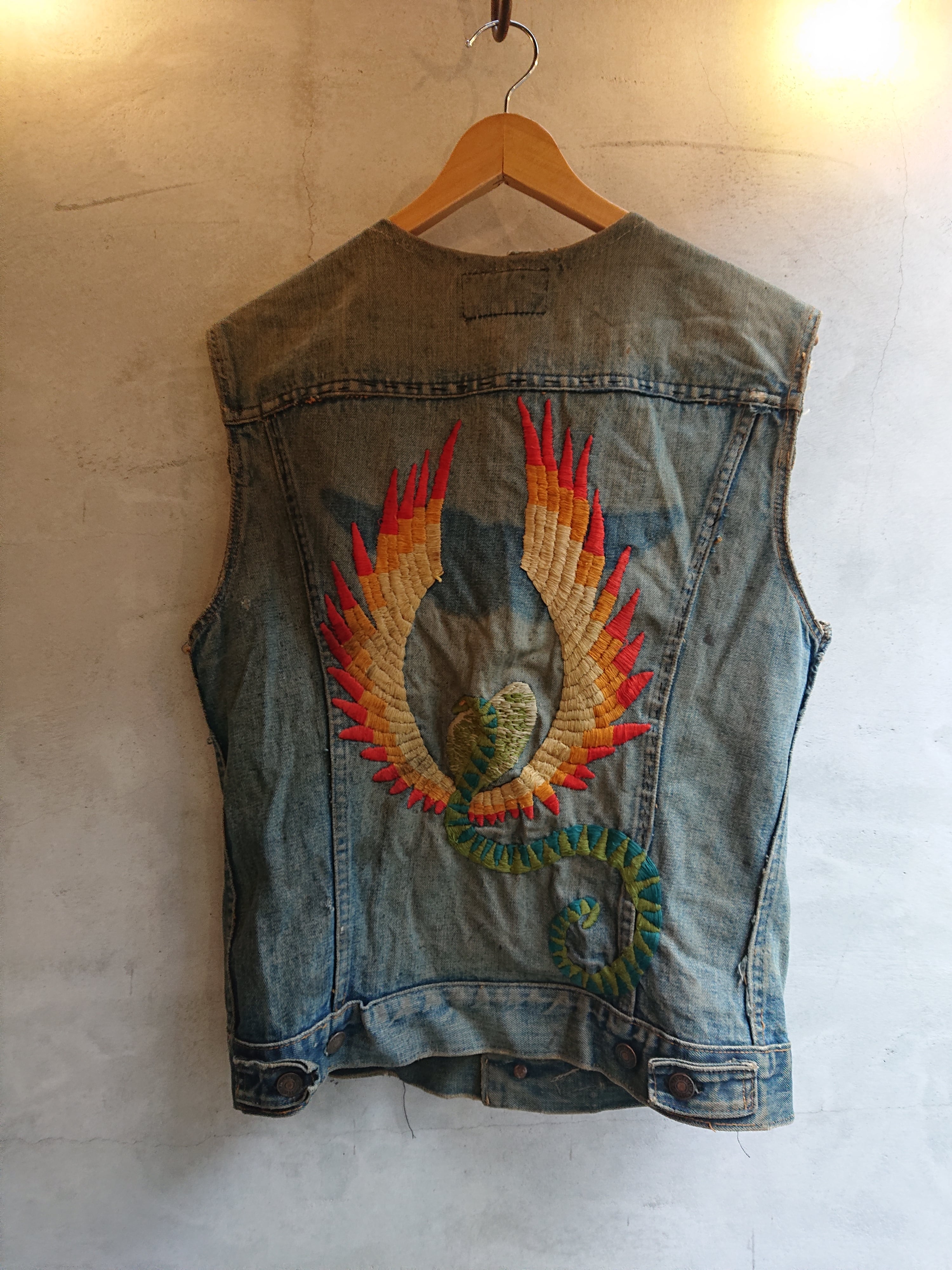 雰囲気抜群なヴィンテージ MC GANG VESTになります。1960~1970年代の個体になるでしょうか。LEVI'S 70505 Eをベストにしたもので、背中にはいる蛇と羽の刺繍。色落ち具合、所々のダメージにワッペンを取った跡すらもこのMCベストがもつ魅力。MC関連の物自体、もともと現存数が少なく希少なアイテムになります。
