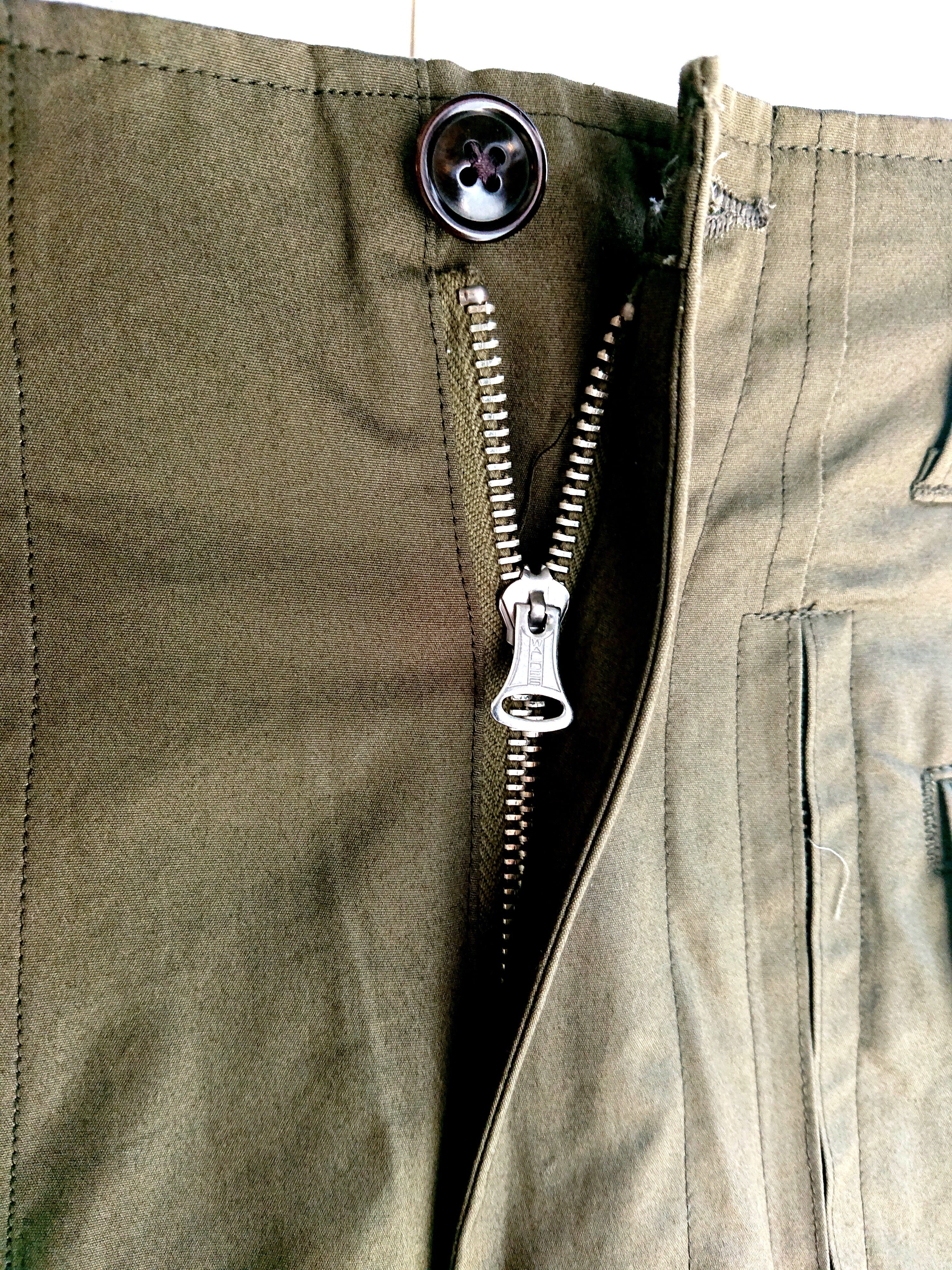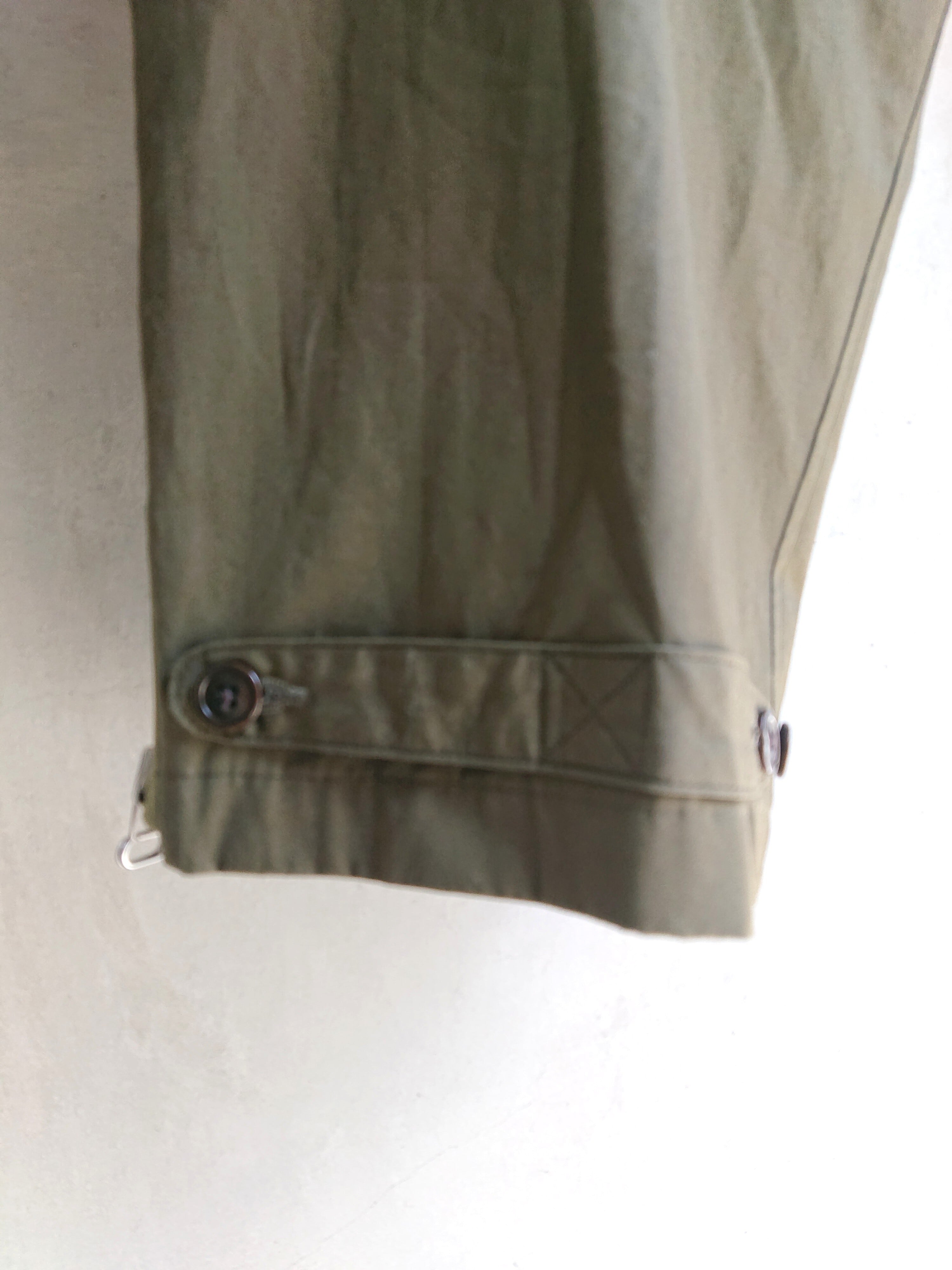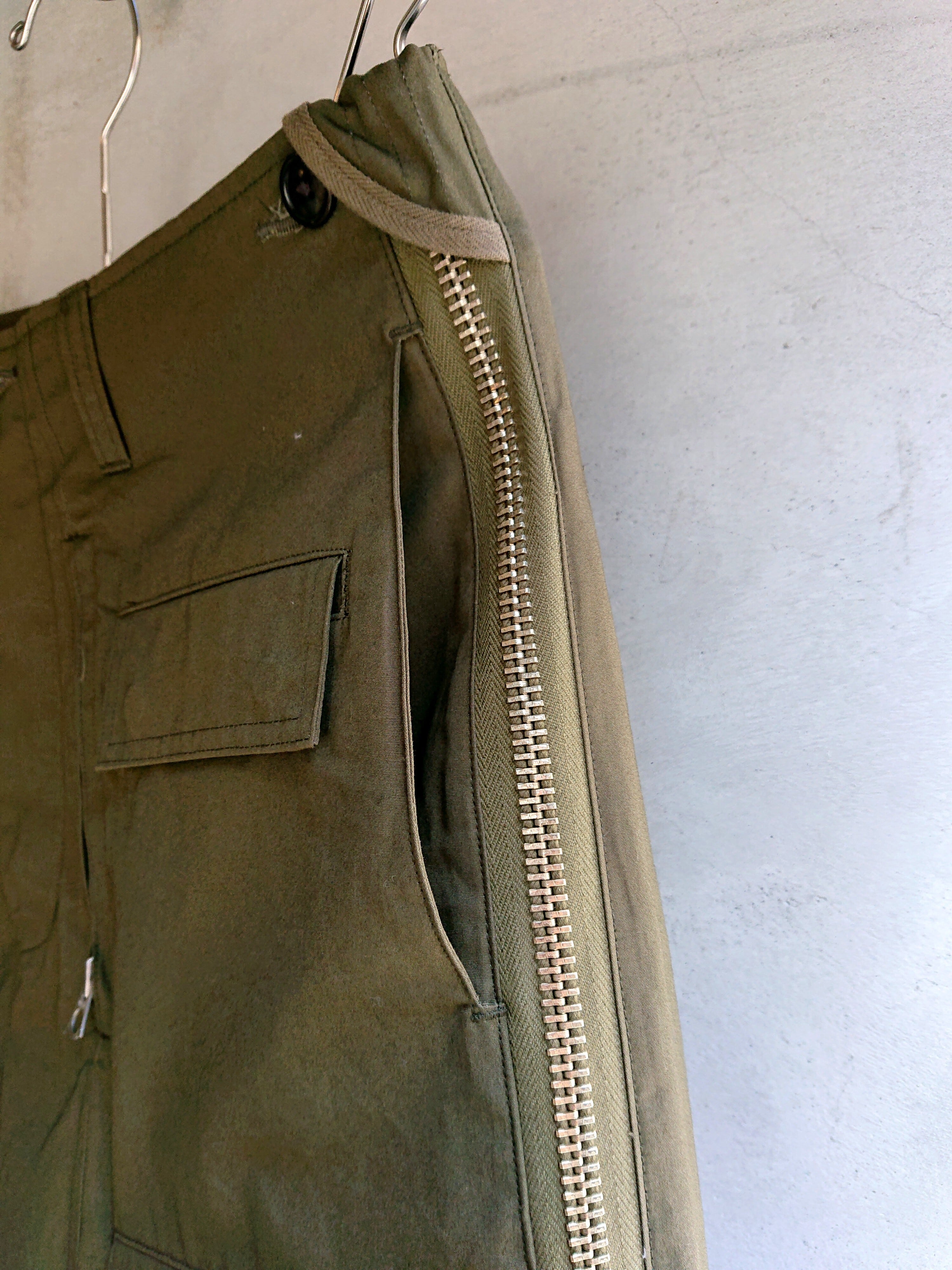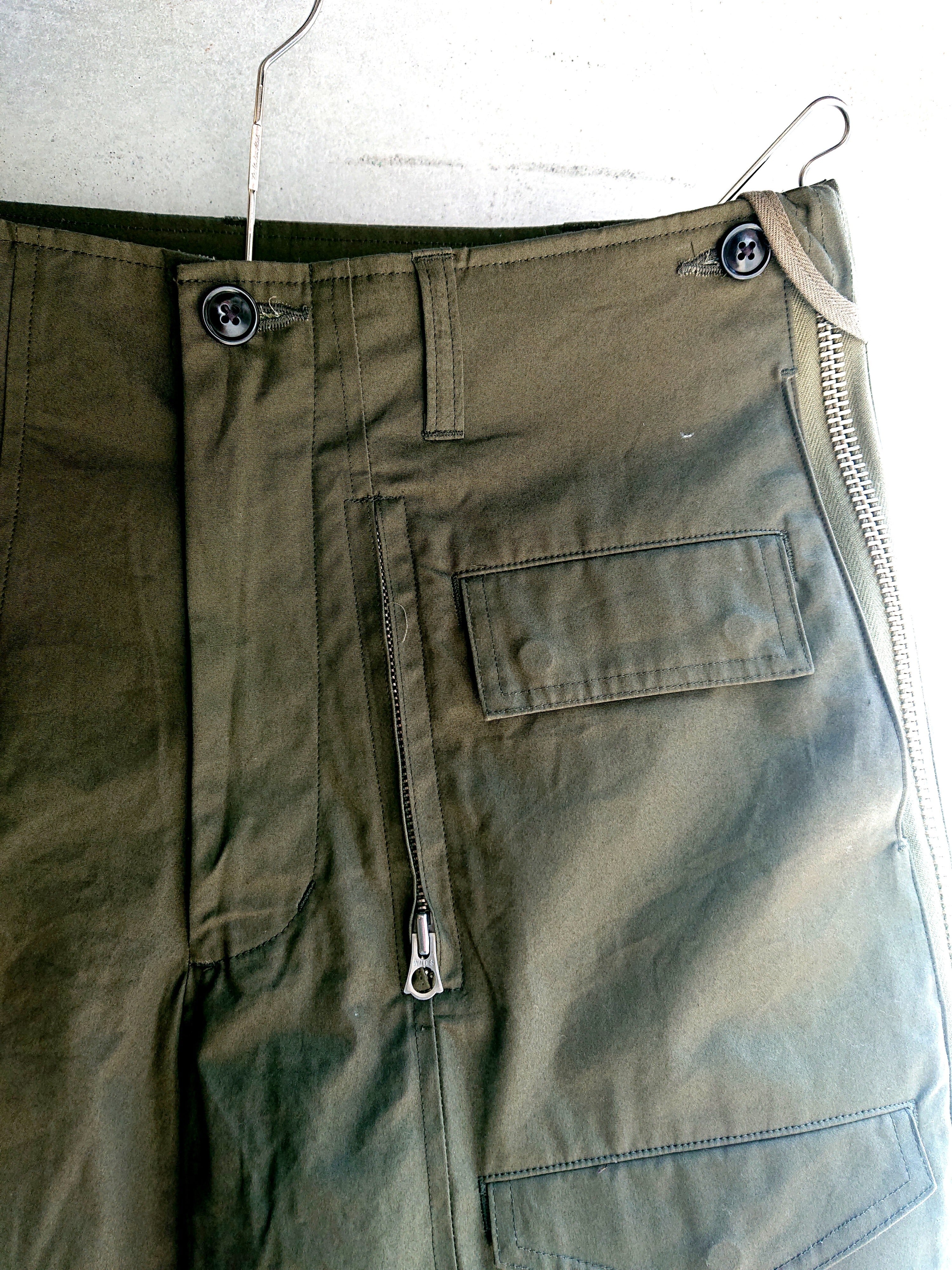 50sのAIR FORCEのフライトパンツを大胆にサンプリング。ポケットが10個以上あり多機能。脇のジッパーやポケットの配置を変えシルエットは太くミリタリーらしい雰囲気を残しています。生地はVENTILEを使用。VENTILEとはコットン100%の超高密度織物です。天然素材でありながら、織り密度が高く、またコットンの水に濡れて膨らむという特性をいかし、防風、防水、撥水など機能を確保しています。またコットン素材の持つ通気性も兼ね備えています。コットン100%ですが防風、防水、撥水、通気性にすぐれた天然の高機能ファブリックです。裏地もVENTILEを使用する等贅沢な作りとなっております。ディテールやギミック、ポケットの多さなど書ききれないくらいにたくさんのディテールが詰め込まれています。脇に配置されたファスナーはフルオープンで開き、ポケット口やフロントファスナーなどのスライダーも全て種類を細かく変えています。シームを利用したポケットや、玉淵ポケットが多いため、わりとシンプルな見え方で、きれいなミリタリーらしい太いシルエット裾のタブがアジャスターになり絞ることも可能です。