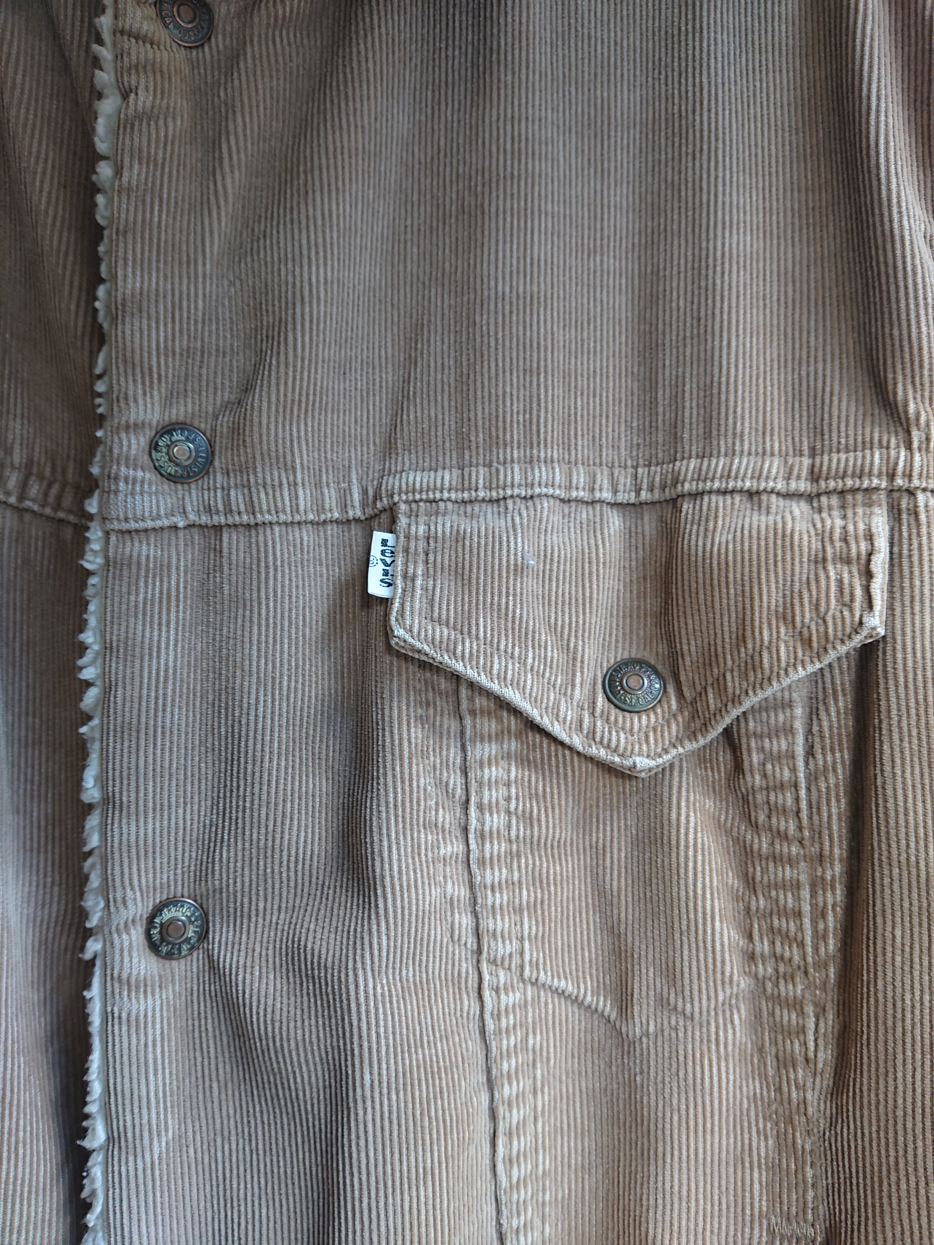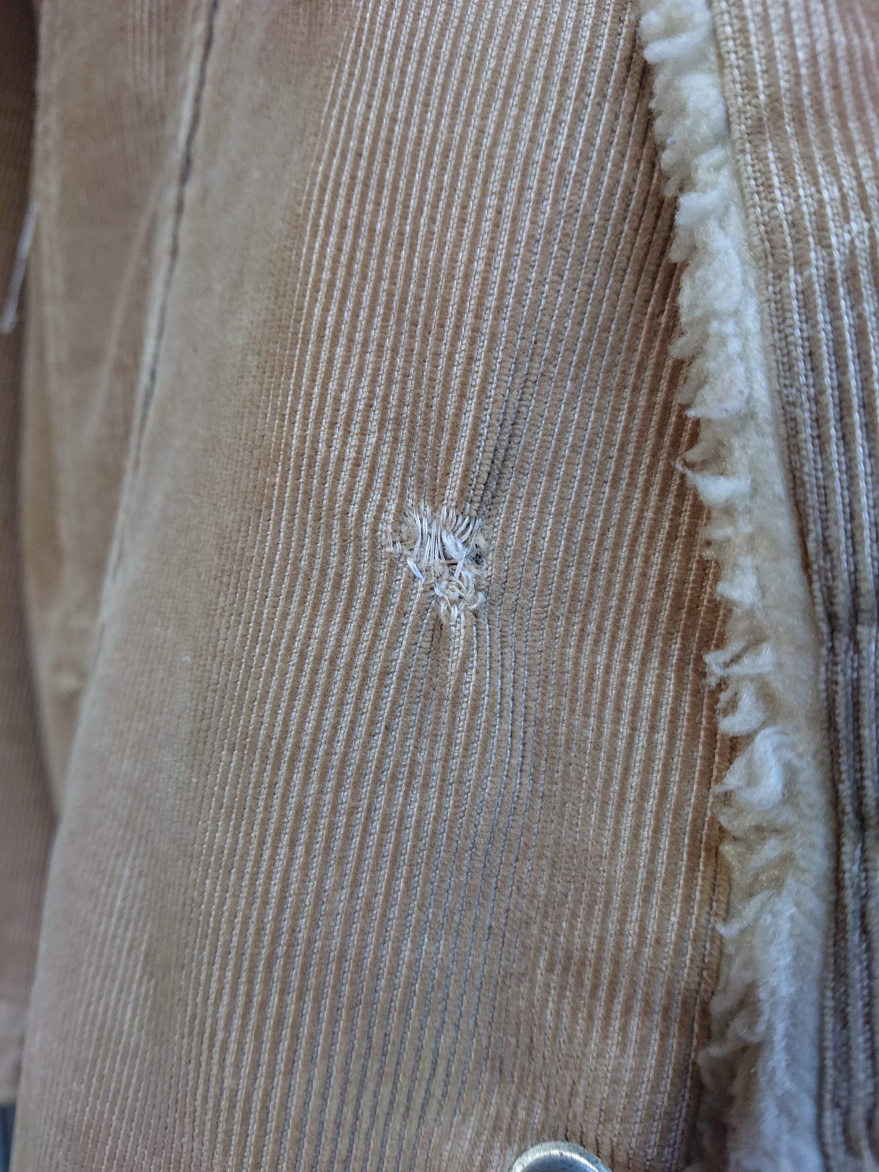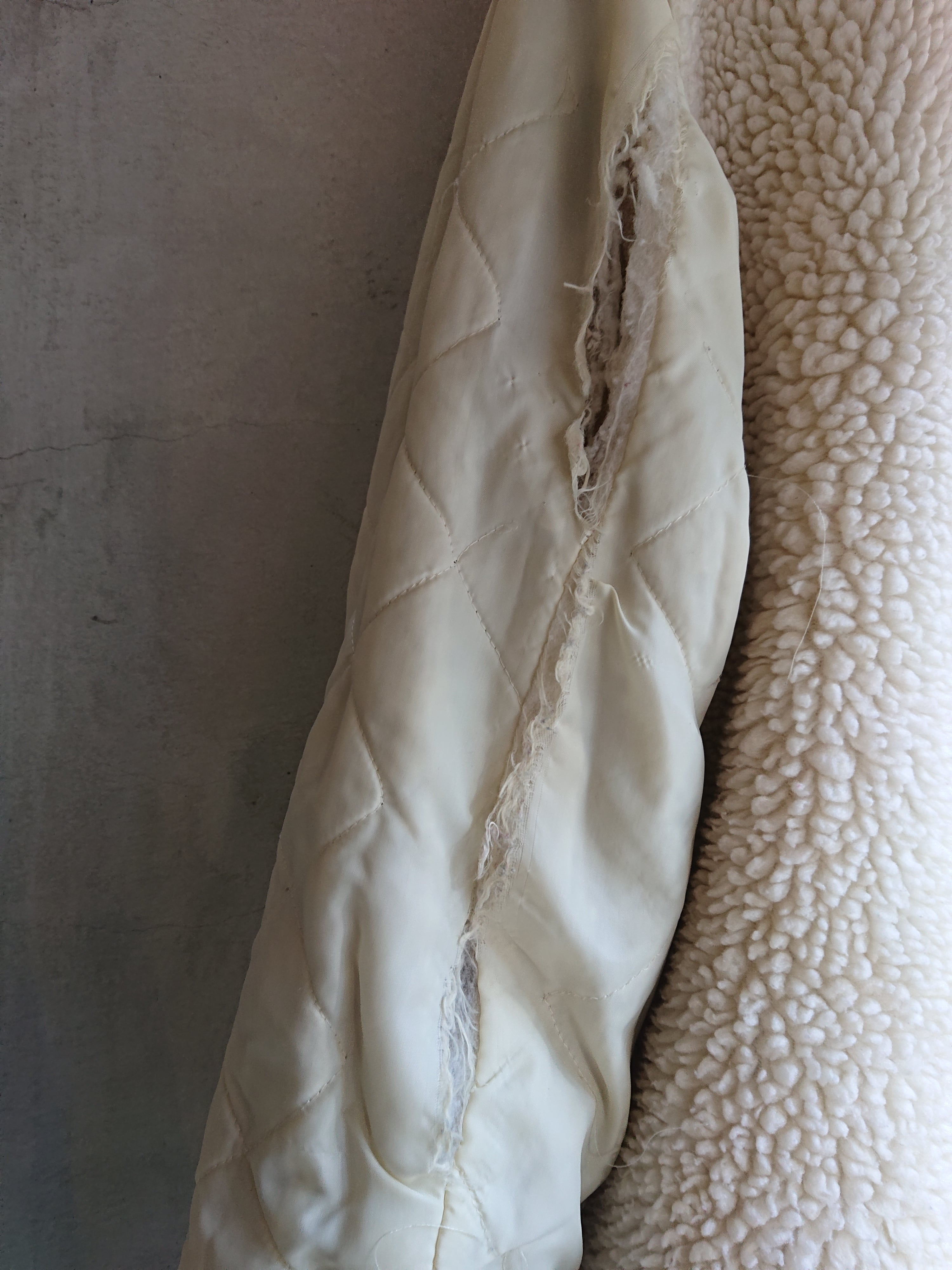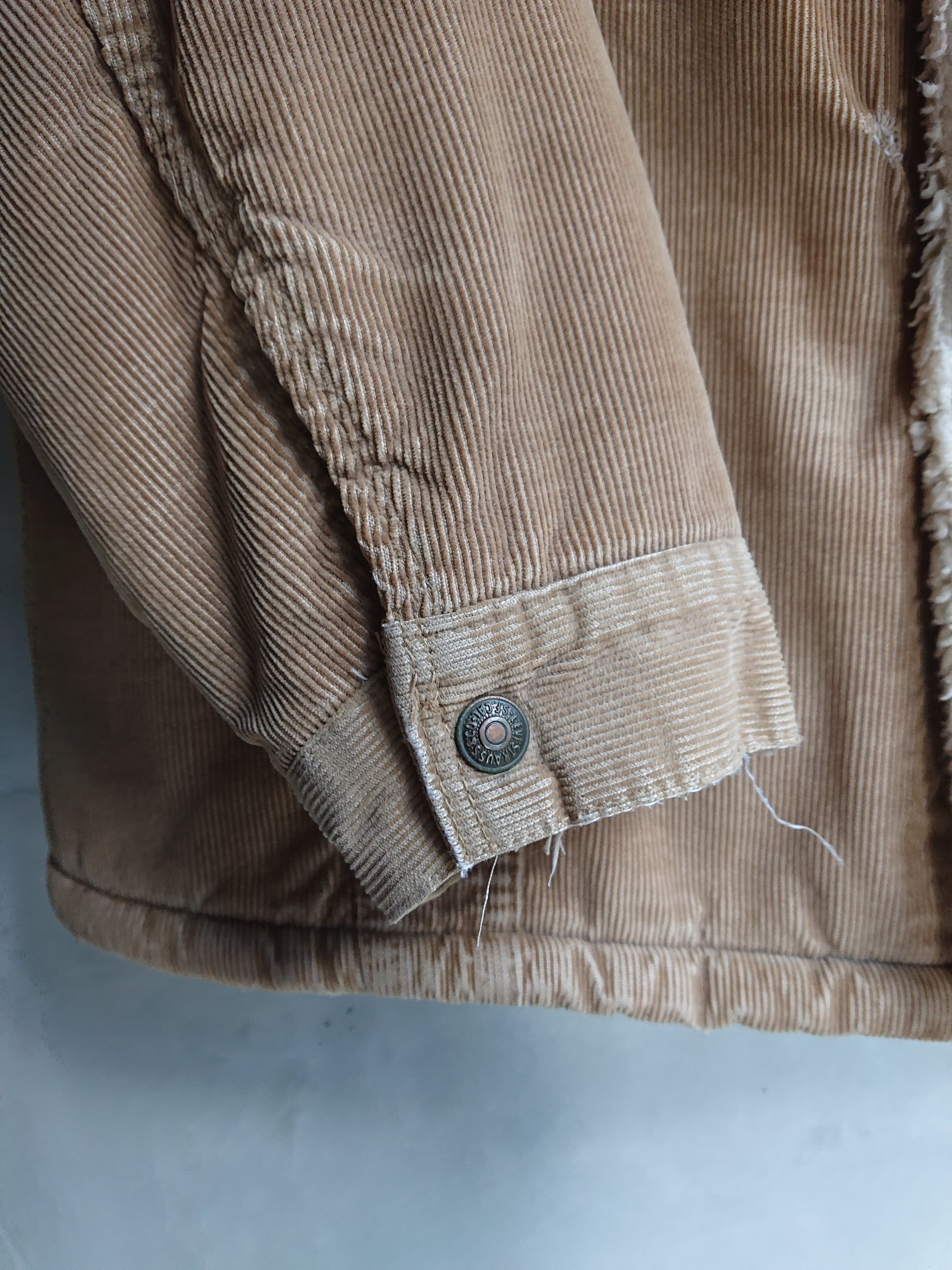 コーデュロイボアのロングタイプ。意外と少ないモデルかと思います。ランチコートのようなデザインも良いですね。コーデュロイの色褪せた雰囲気も抜群。フロントに小さな傷と袖口に擦れ、内側両腕のキルティング部分に破れがありますが着用に問題はありません。