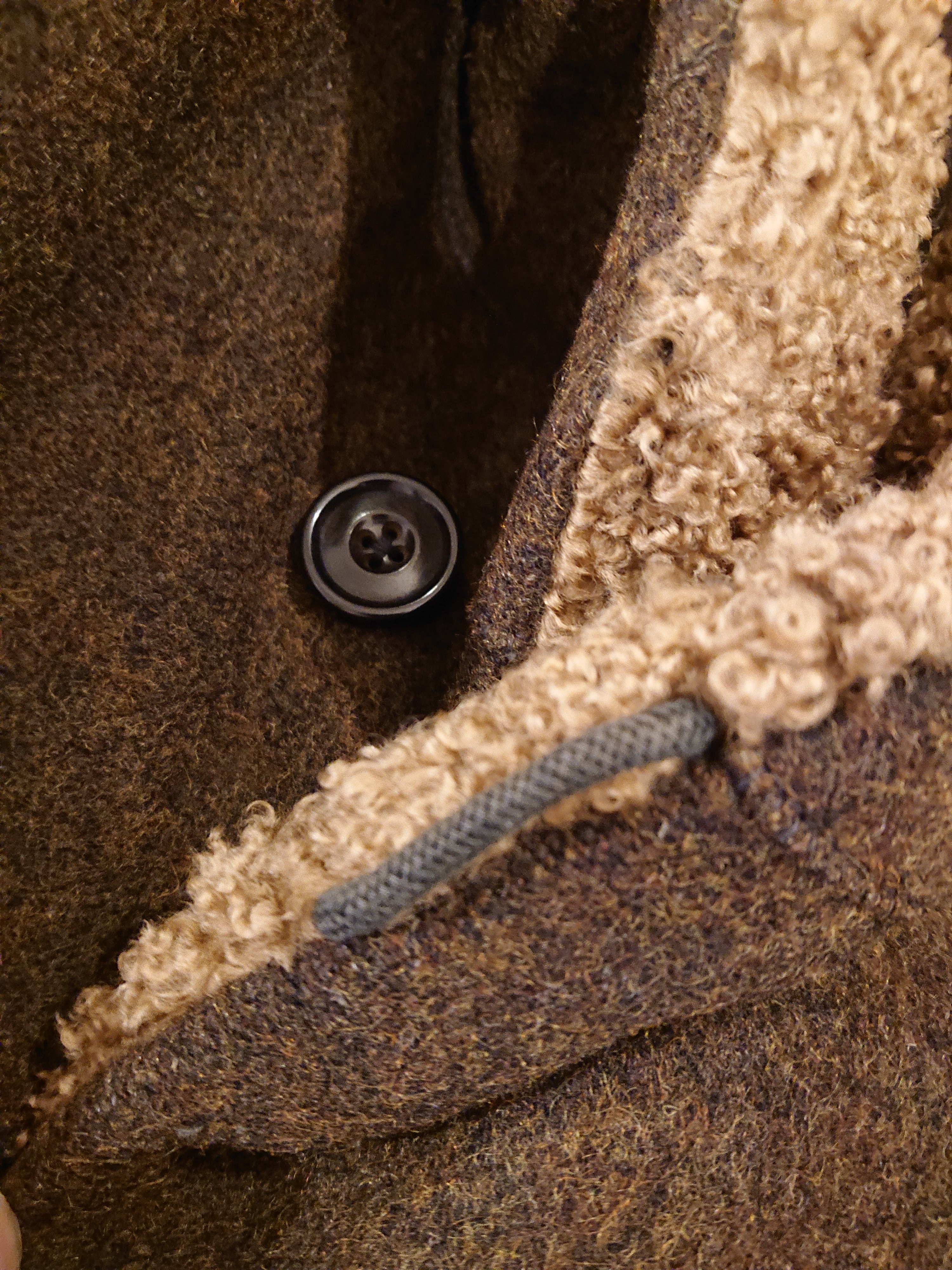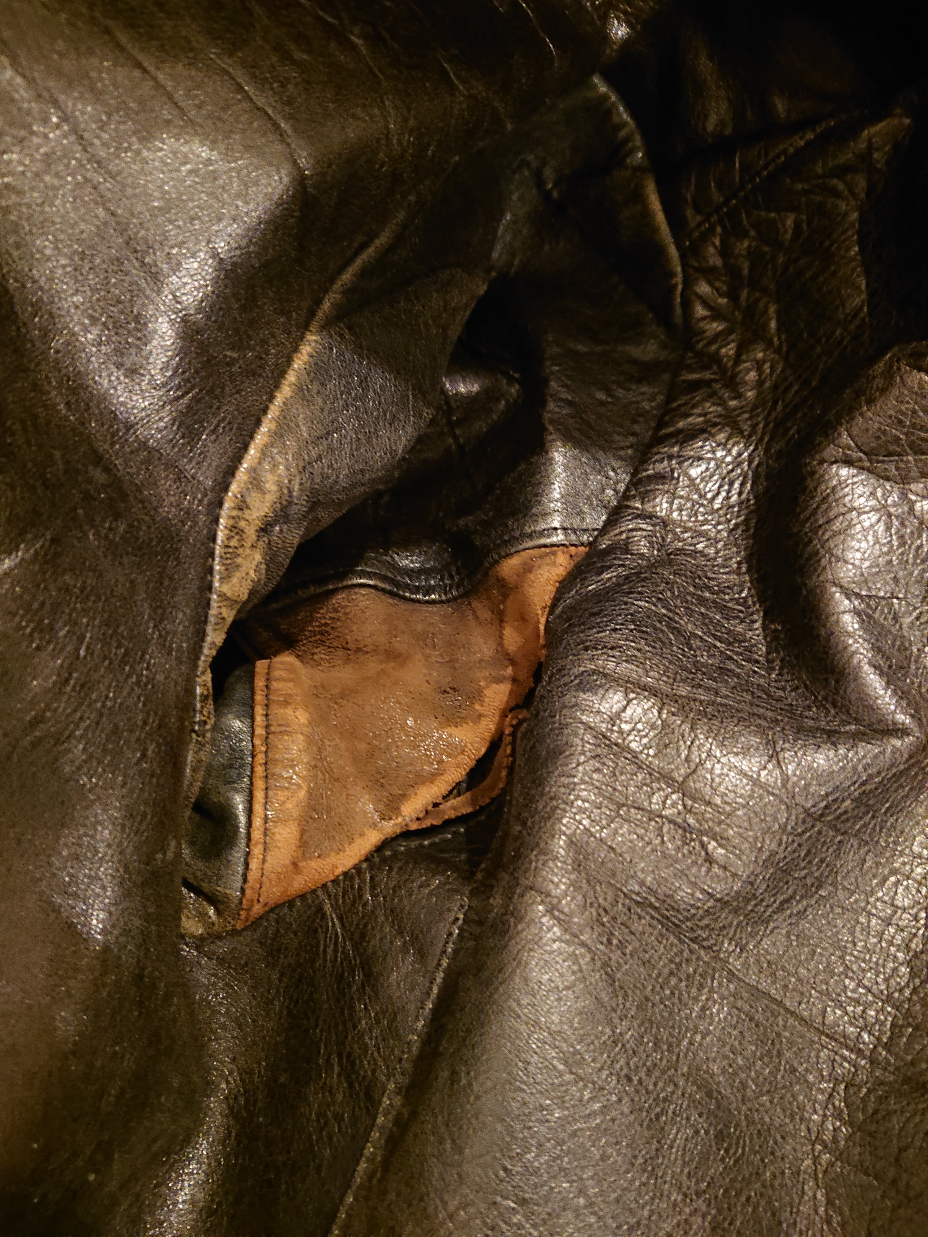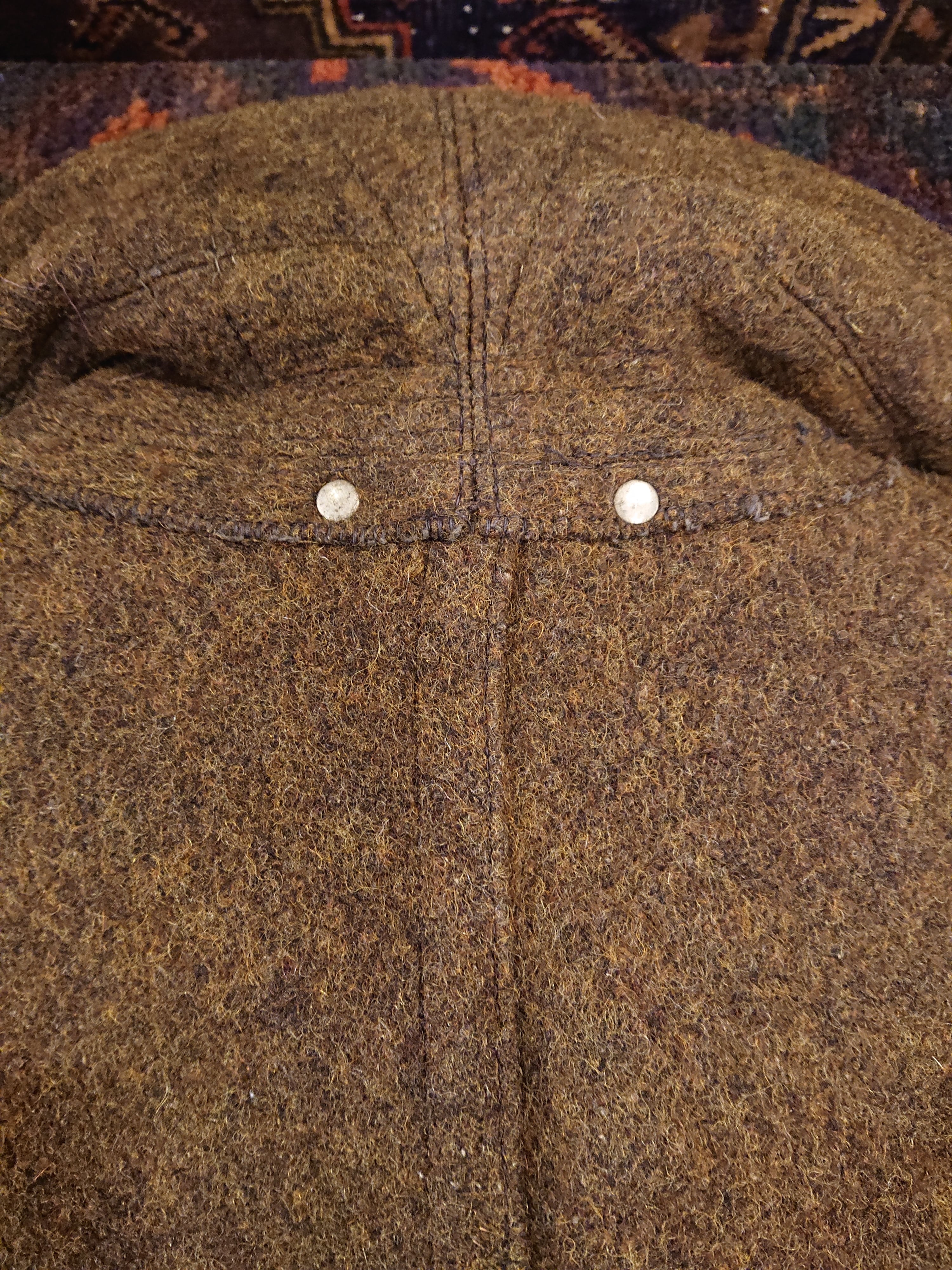 スペシャル!!1920~30年代 GREAT WESTERN RAILROAD COATになります。フロントはダブルでヘビーなウールコート。ショールカラーの部分はカールを巻いたシープ(羊)。内側にはなんとホースハイドを使用!!内側の腰位置位までと両袖までレザーをライナーにしてる、とんでもないコートになります。それゆえに重量もあり、ずっしりとしてますが古いヴィンテージのコートに軽量なんて求めてはいけない、この重みもこのコートがもつ魅力の1つ。早々お目にかかる事のないアイテムかと。襟部分に擦れ、両腕に数ヶ所ホールと内側の右腕レザー部分に破れがありますが着用に問題はありません。