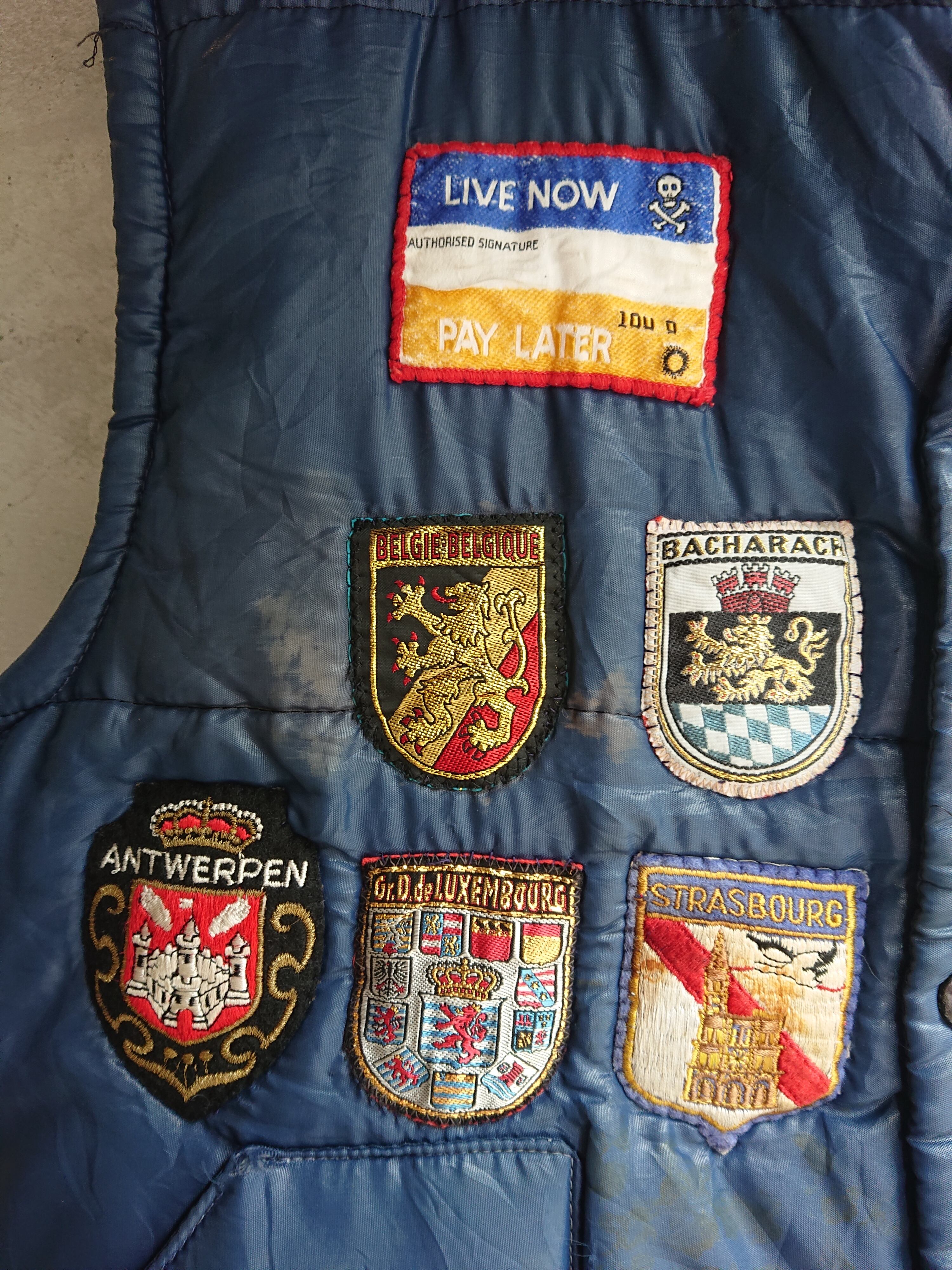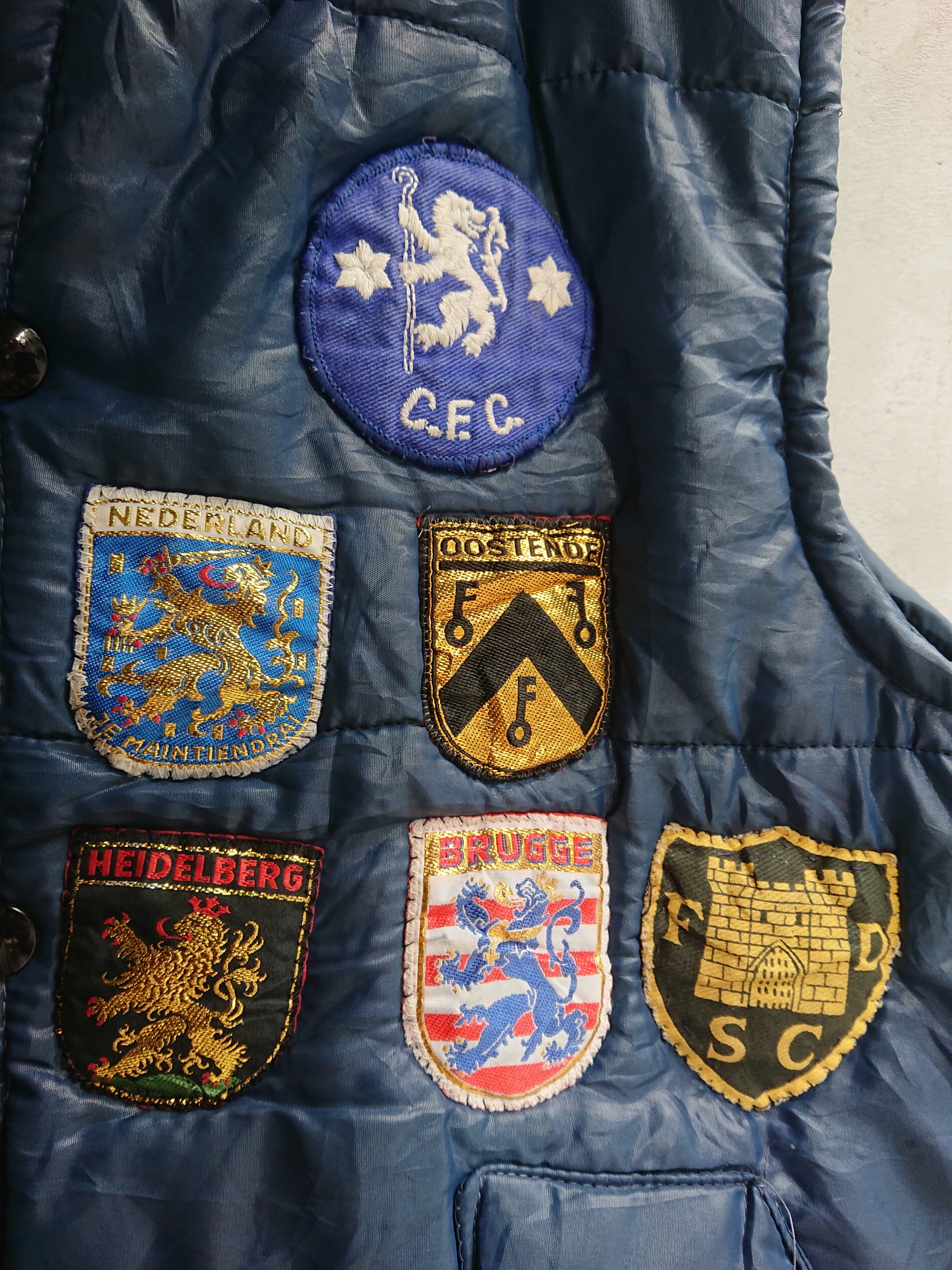 70年代 ヴィンテージ 中綿入りベストになります。12個のワッペン付く中綿ベスト。付いてるワッペンはほとんどがヨーロッパのもの。右上のワッペンの端には小さくドクロが入ってるのもポイントに。サイズ感も良くアウター、インナーとしても使っていただけます。フロントはスナップ仕様。フロントの右側ワッペン下辺りにうっすらと汚れがありますが、その他致命的な傷等はありません。