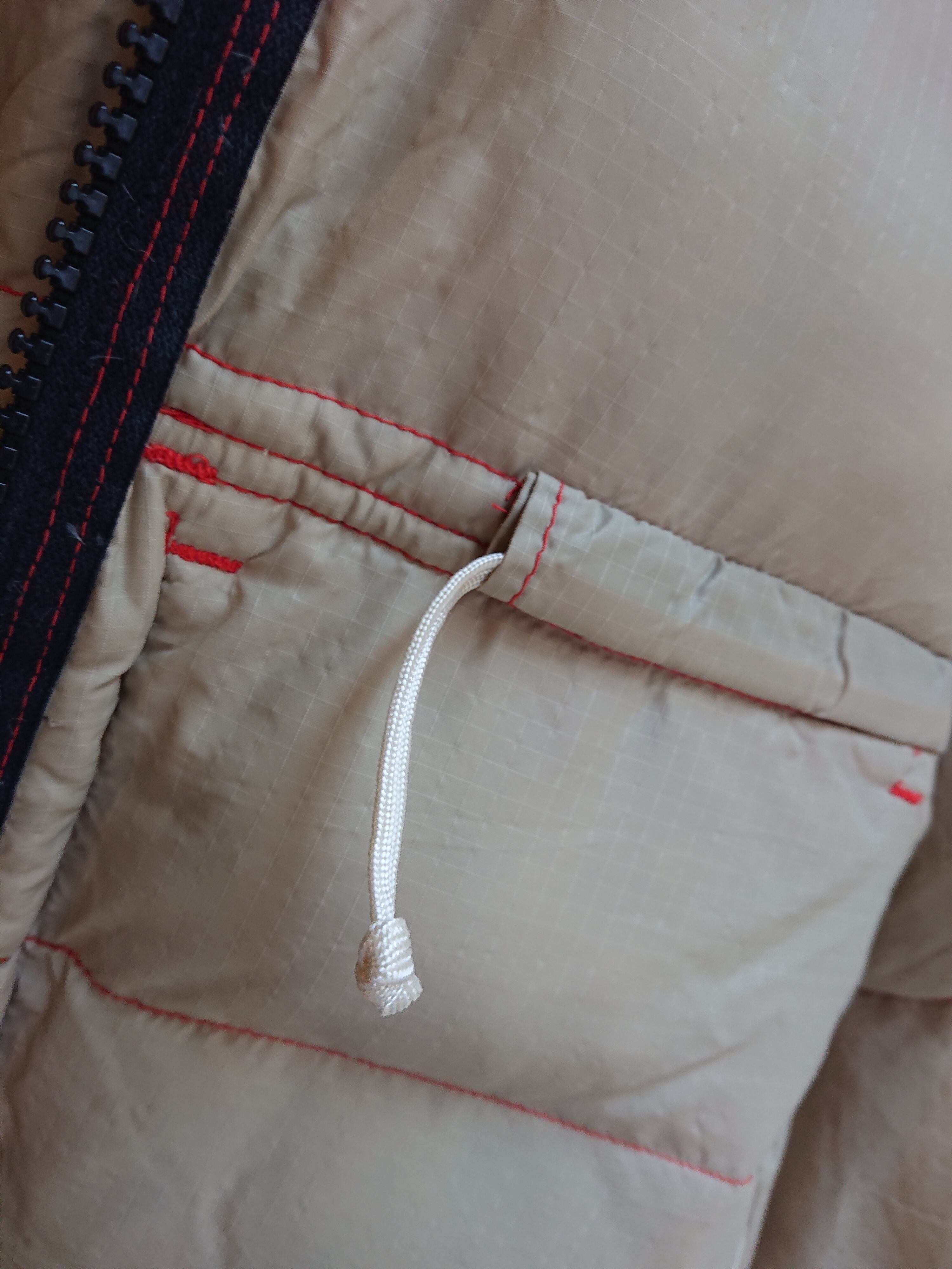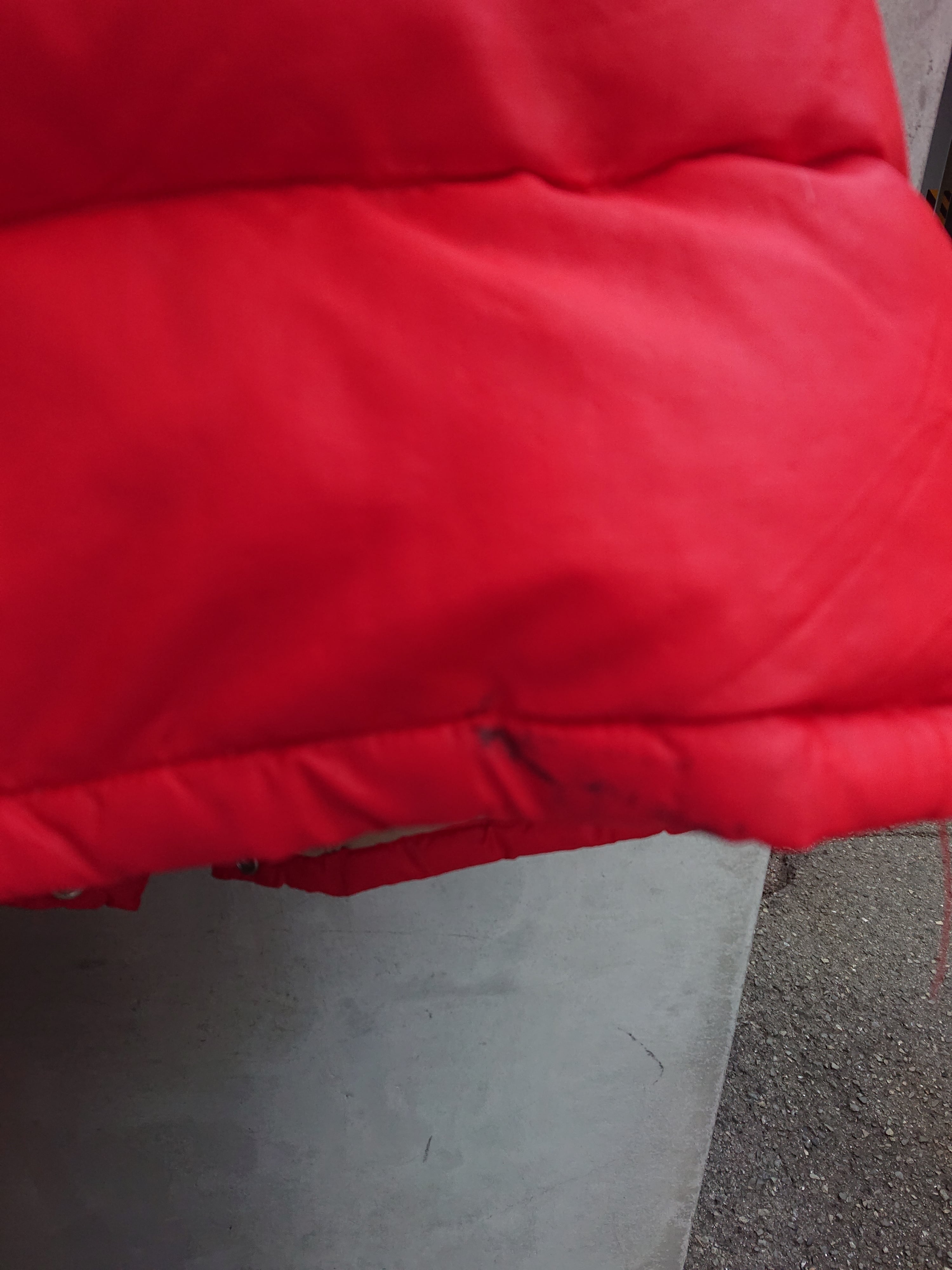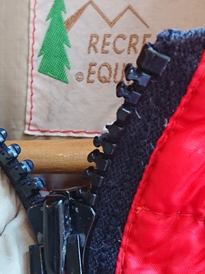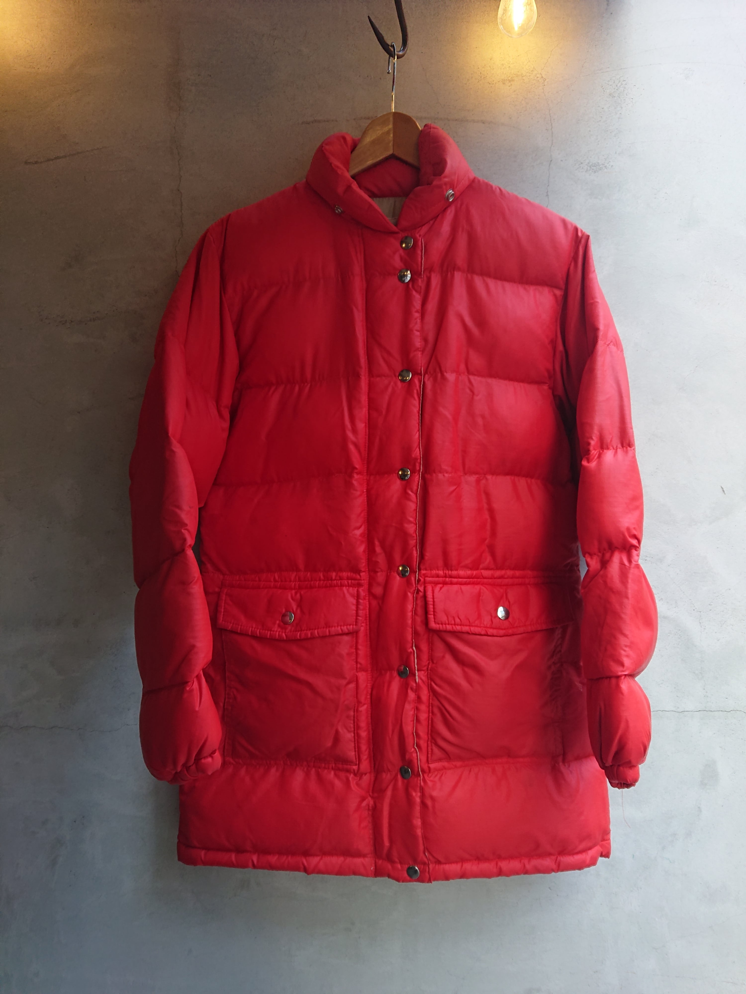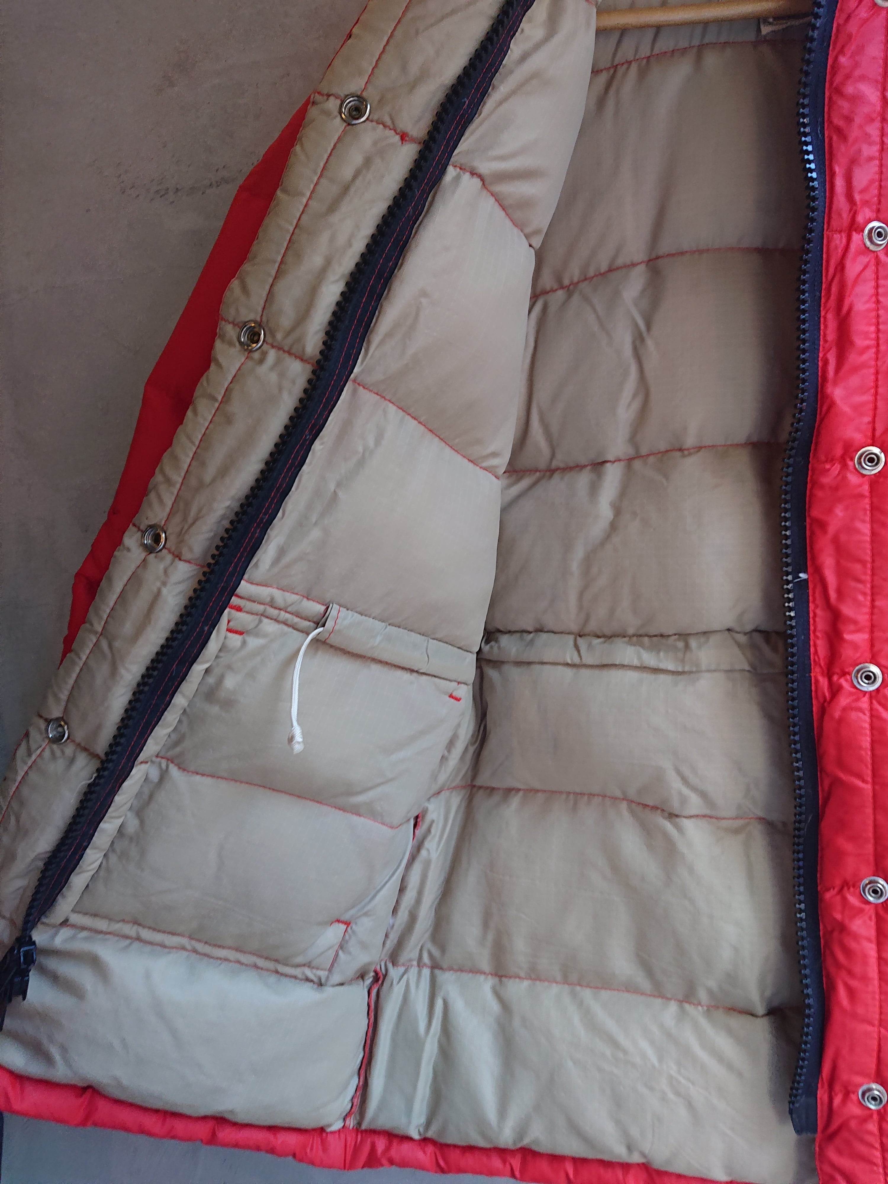 今回紹介するのは70年代のタグがつくダウンで、レディースものになります。着丈が少し長めのモデルでレディースなのでフロント合わせが右上になります。色は発色良い赤。背中裾に2ヶ所ほどインク汚れがあります。フロントのジッパー右側の上から4~5つ目のコマ(写真参照)が歯こぼれしてますが着用に問題はありません。