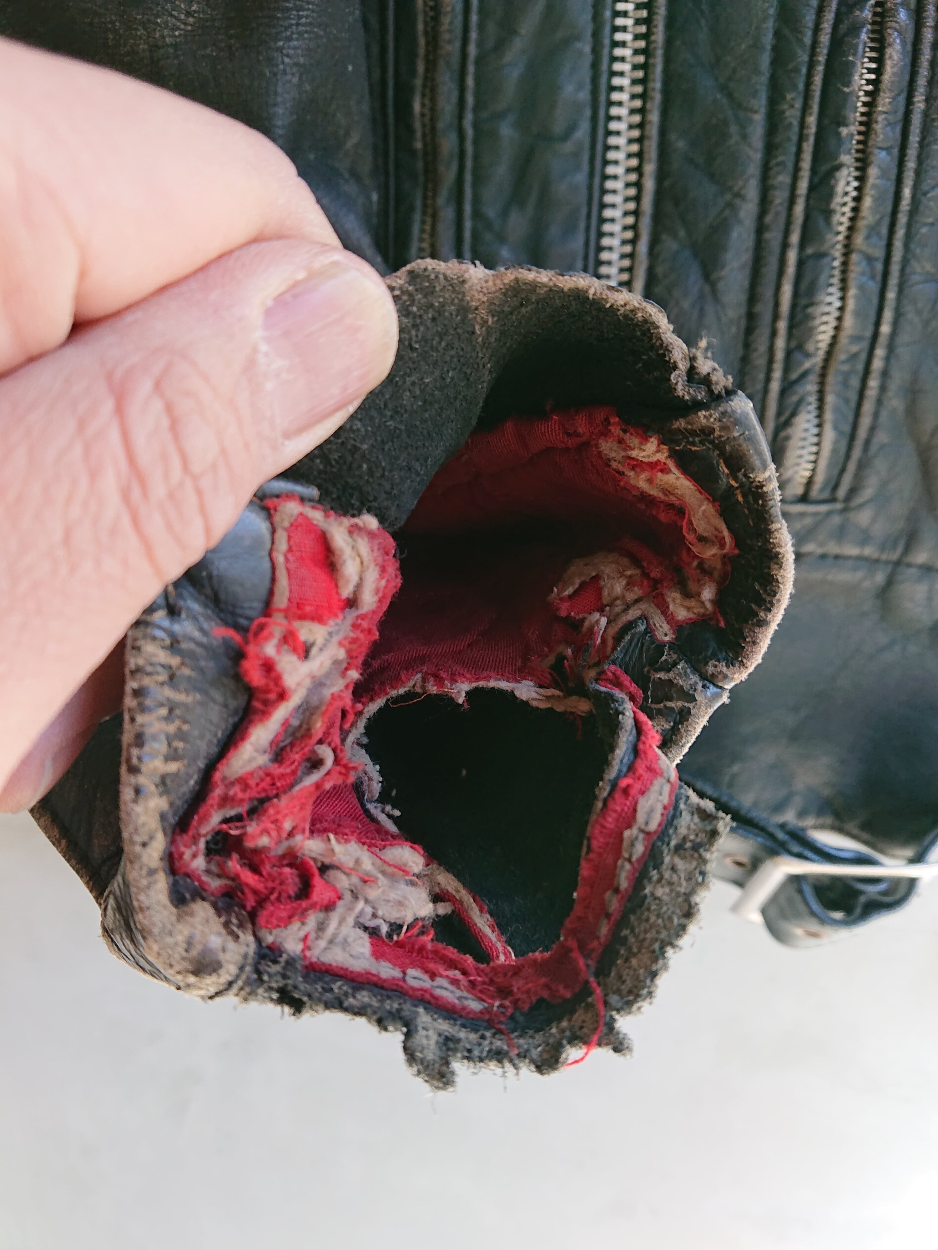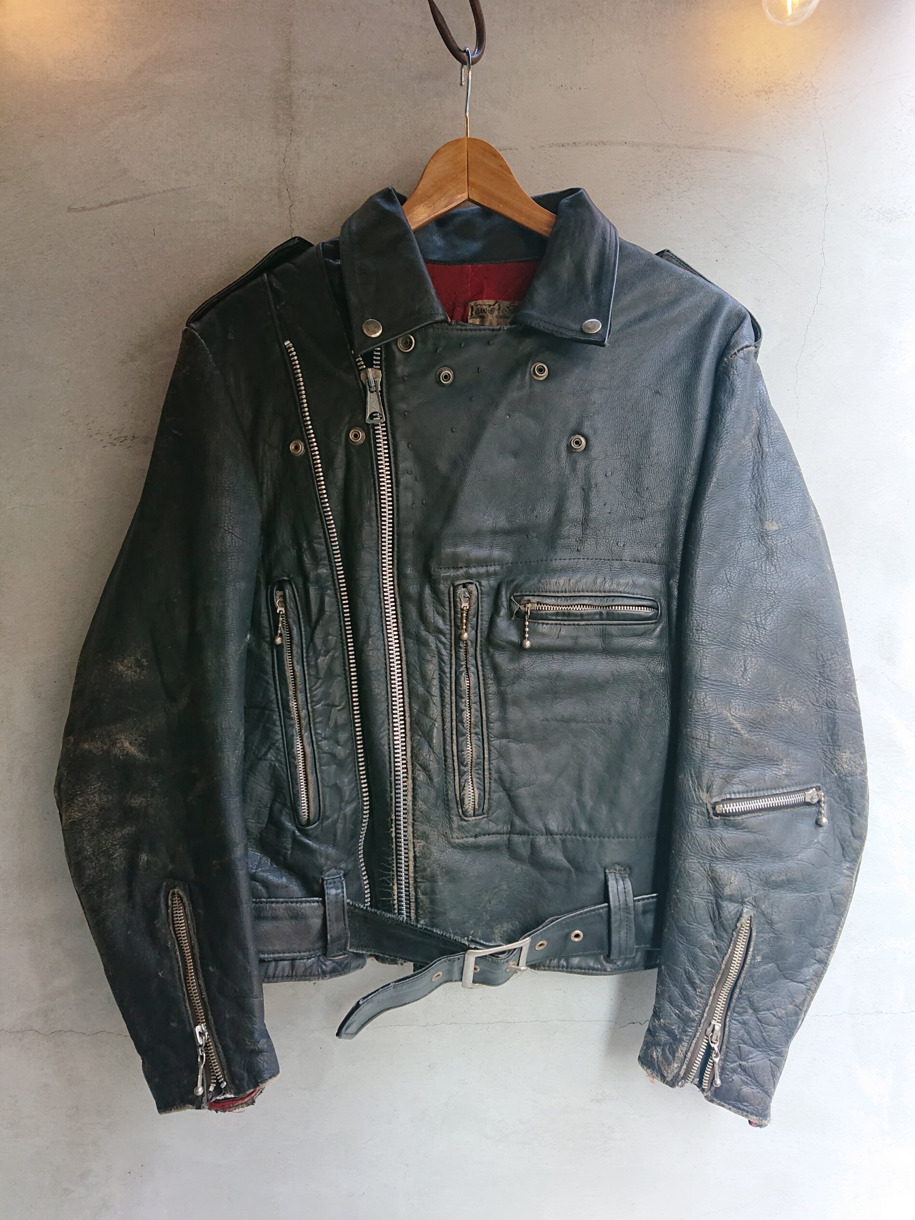1970年代 LEWIS LEATHERS TWIN TRACK BRONXになります。ツイントラック ブロンクスは、ブロンクスの発売から10年後の1966年に登場しフロントにツイントラック ジッパーを採用したブロンクスのアップデートバージョンになります。ツインジッパー仕様の前開きは、冬服のインナーの厚み分を調整して全シーズンを通して着れるフィット感。後部両脇に左右から手袋や地図が取り出せるマップポケットが追加。肩の後ろにはアクションプリーツがあり動きやすさの配慮。タグ下にはリアルハイドタグ(馬革)。見た目、デザイン性プラス機能性も追加されたツイントラック。フロントのピンズの跡、ダメージや擦れ、リペア等全てがパンクな雰囲気も出てて格好良し。ハズしたスタイルも洒落てると思いますが自分ならベタにタイトシルエットのパンツでバチっときめたくなります。フロントのジッパーは交換されてますが、このジャケットの全体の雰囲気を考えたら変わってるくらいのほうがリアルで男前!雰囲気系レザーお探しの方いかがでしょうか。
