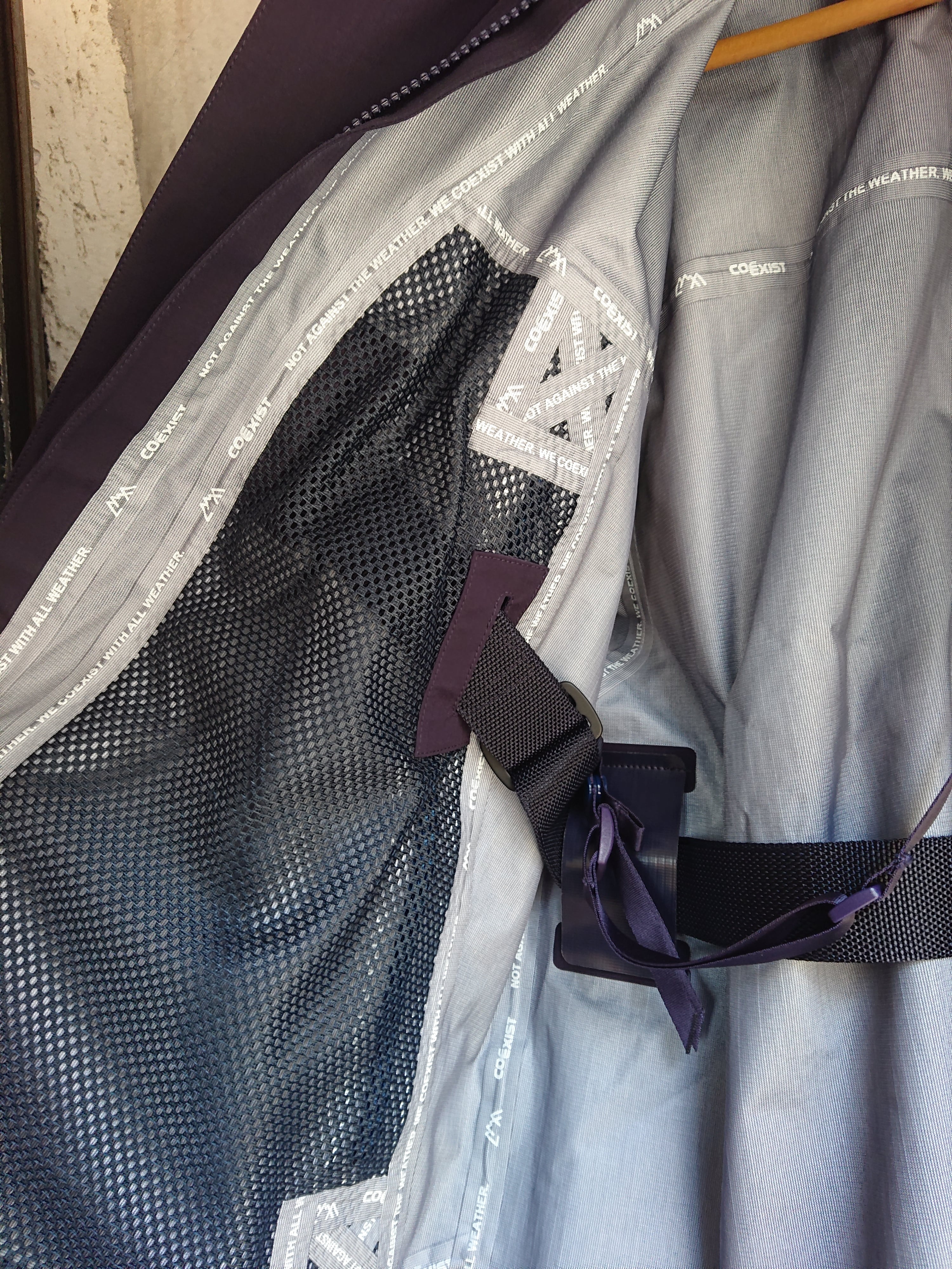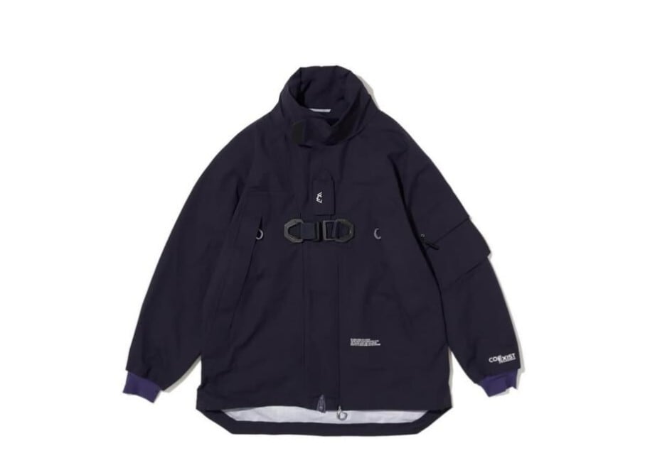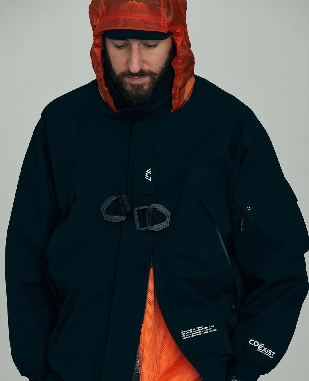 コムフィとしては抗うのではなく共存していけるハイスペックなアパレルをCOEXIST LINEとして 他の型と差別化していく。今期は耐水20000透湿20000撥水度5レベルで今までと全く違う質感の 少しごつめのストレッチ3レイヤー変更しました。
