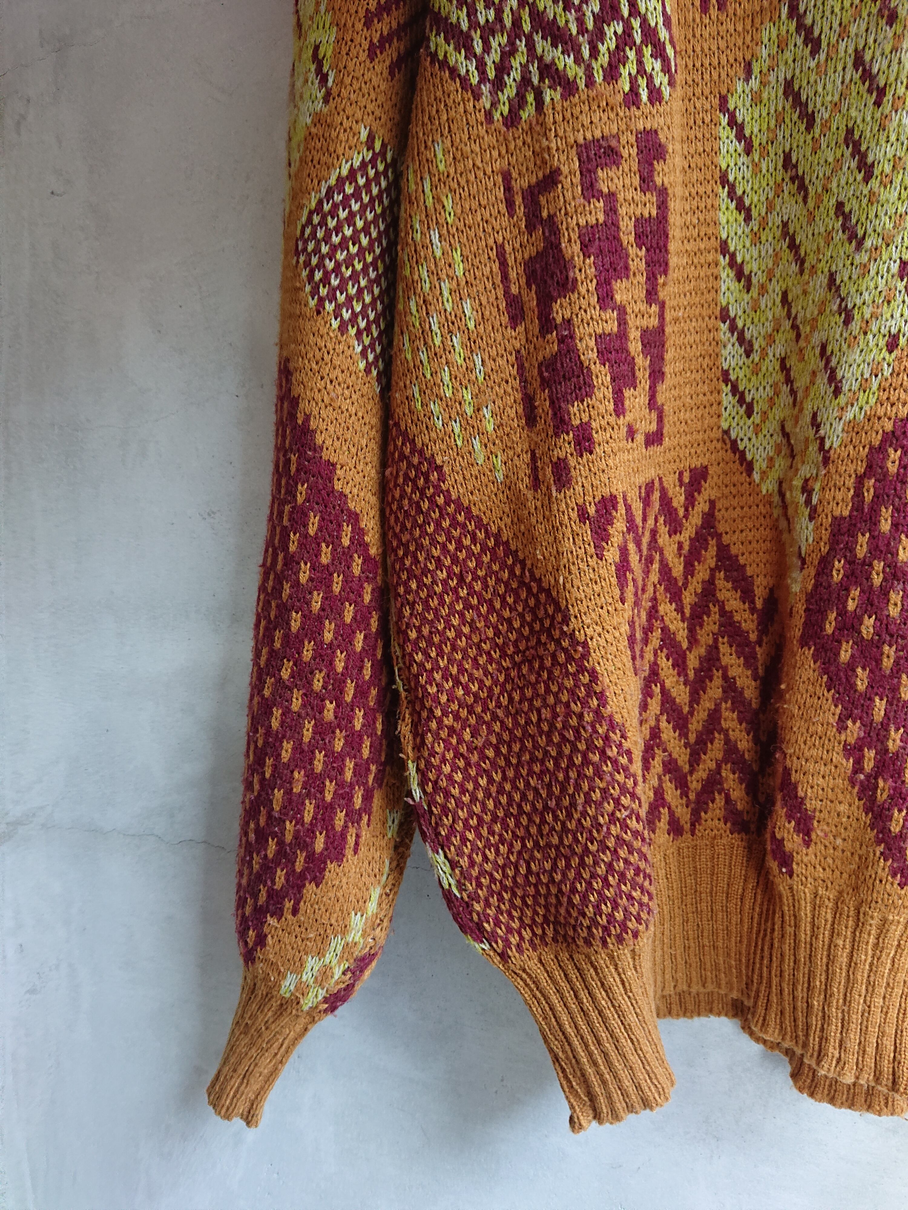 80年代のデザインセーターになります。色だけみると地味ですが柄が良い感じに映えます。