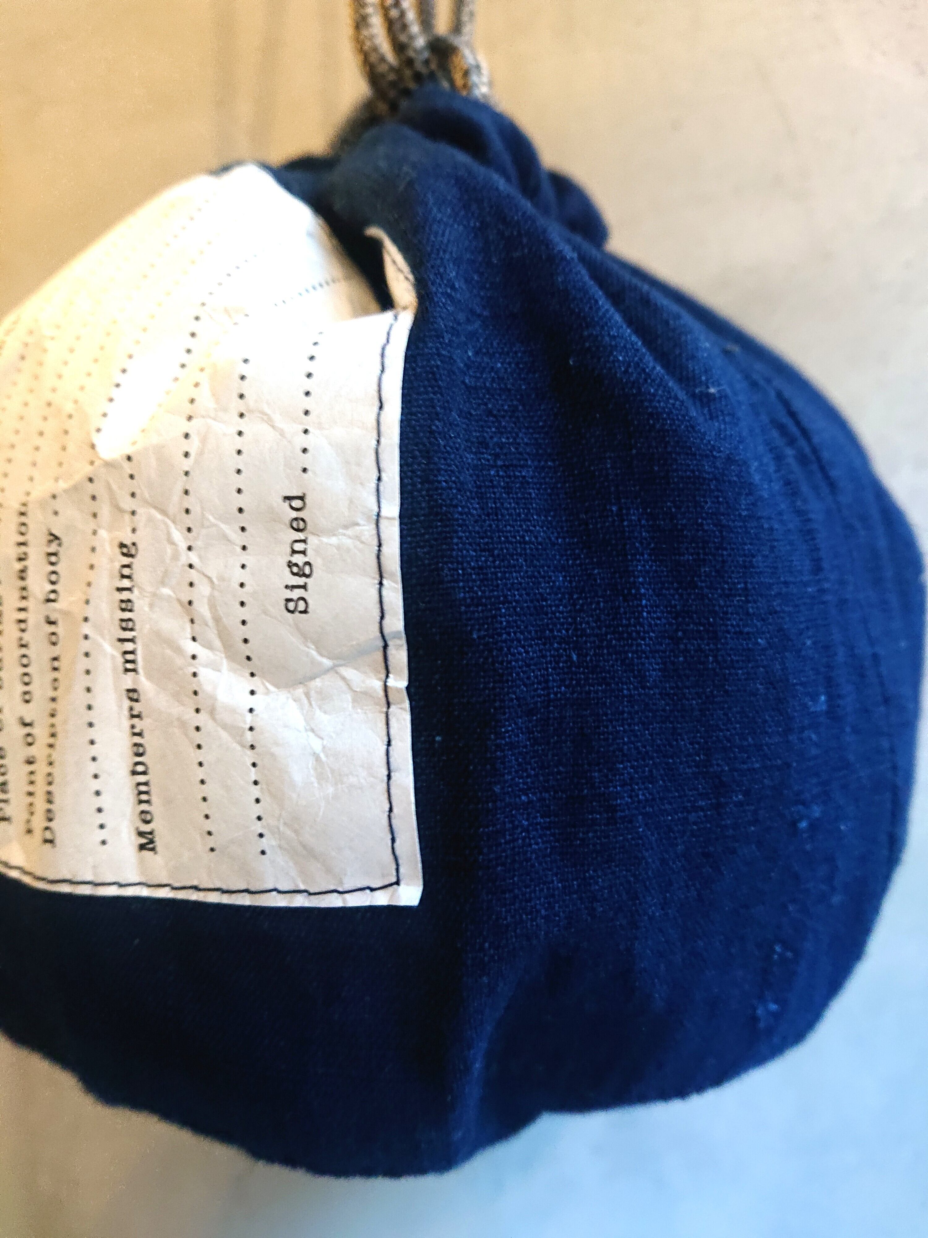 ヴィンテージを再現。ヴィンテージの本藍古布を可能な限り色合わせして組み上げ本藍の贅沢な PERSONAL EFFECTS BAG製作致しました。一点一点雰囲気が異なるのも魅力。ドローコードにはアウトドア用の反射材入りパラコードを使用し、タウンユースに耐える強度に仕上げました。