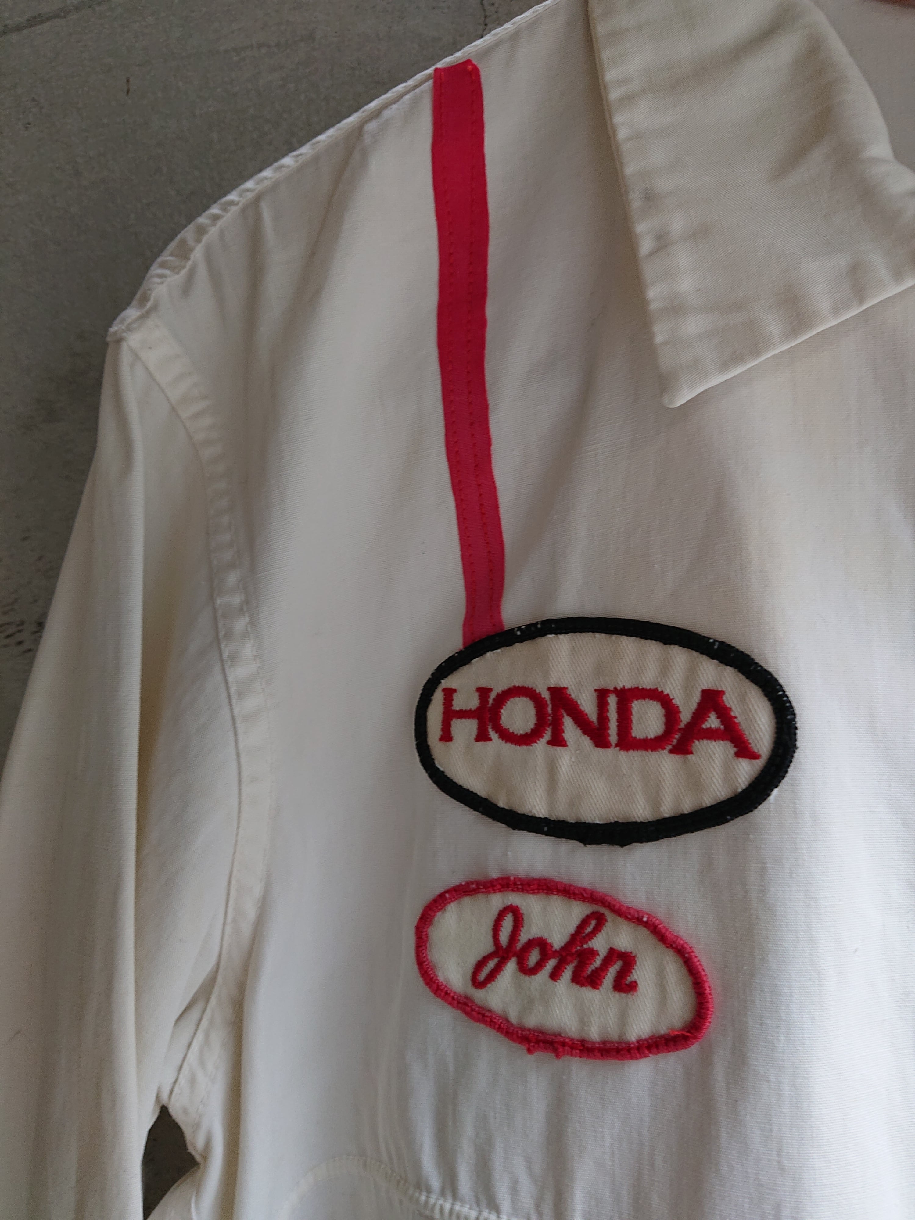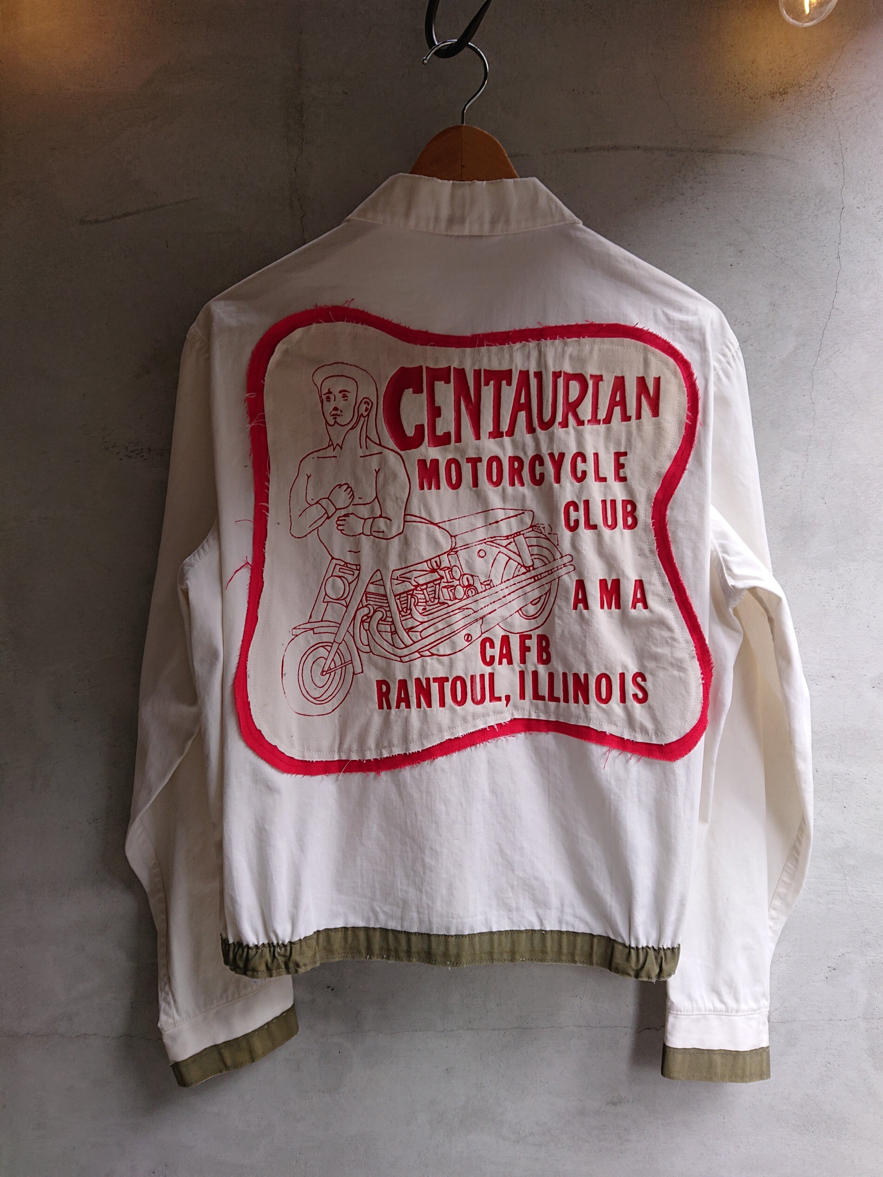 お好きな方も多いヴィンテージ モーターサイクルジャケットのご紹介。アメリカはイリノイ州ラントゥールのCENTAURIAN MOTORCYCLE CLUB JACKET。背中にはギリシャ神話に登場する半人半馬のケンタウロスがモチーフにされたプリントの生地が縫い付け。フロントはHONDAとアイアンクロスのワッペンが装着。袖口、裾にはオリーブカラーの別生地がテープ代わりに縫いつけされてます。ボディは50年代のSir Jacのスウィングトップ。Sir Jacと言えばスウィングトップが有名で頭に浮かぶ人も多いと思います。ワッペン、裾テープの縫い付けから1950年代当時のMOTORCYCLE CLUBのものではないと思います。いつの年代か定かではありませんがヴィンテージのスウィングトップにCENTAURIAN MOTORCYCLE CLUBが