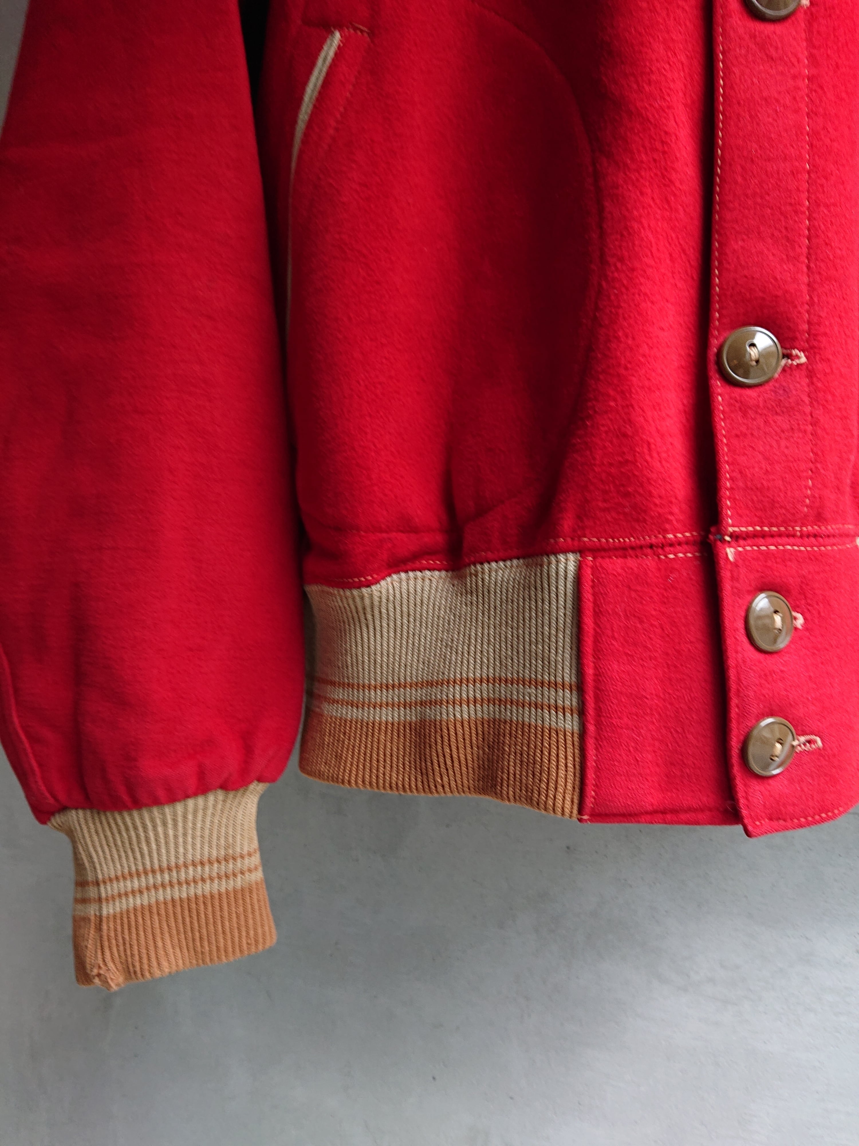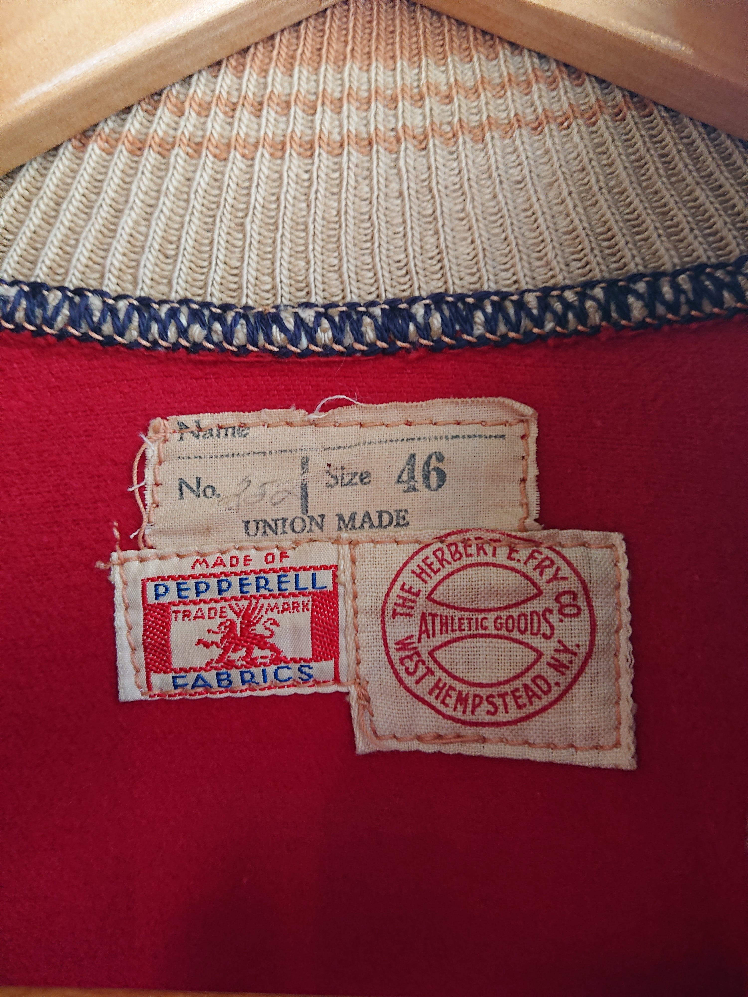 スペシャル!!ヴィンテージ ワークウェアで稀に見かける生地メーカー "PEPPERELL FABRICS"のタグがつくネル生地のアワードジャケット。フロントはボタン仕様。左胸にフェルトのパッチがつきます。ネルと言ってもモールスキンの様なしっかりした生地感。コンディションもかなり良く、ほぼ未使用にちかいと思います。サイズも46とこの年代のスタジャンにしては大きめです。リブやフロント裾にうっすらと汚れがありますが気にならないほど。その他ダメージ等はありません。早々入荷するアイテムではござません。気になった方はこの機会に是非!!