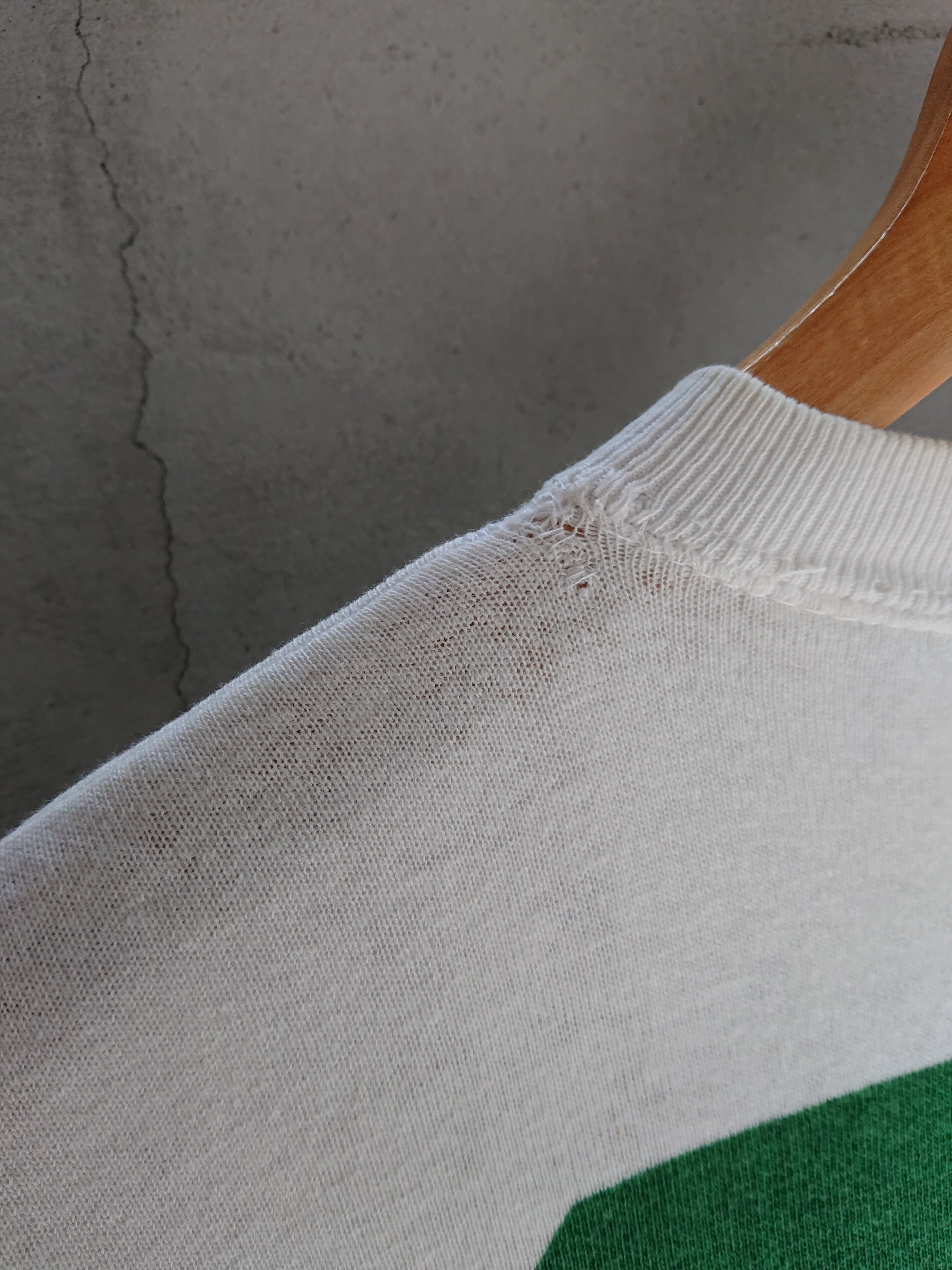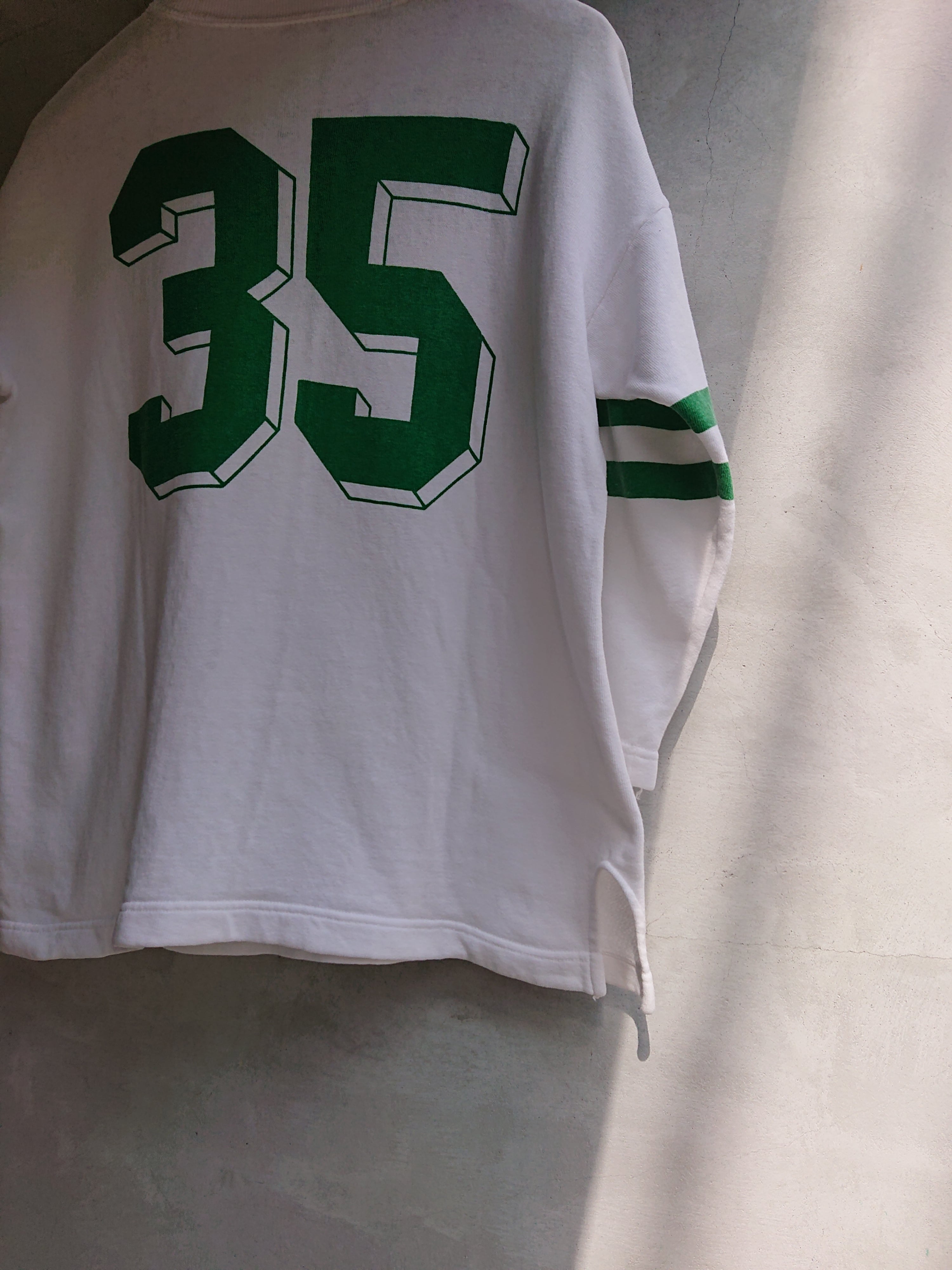 1960年代のナンバリング スウェットになります。 フットボールTEEのスウェットタイプ。"35"のナンバリング。ホワイトボディにグリーンの染み込みプリント。アメカジど真ん中のナンバリング。昨今着てる人も少ないアイテムだけに、そろそろ着たくなってきませんか。フットボールTシャツじゃなく、フットボールスウェット。普通のナンバリングスウェットとはまた違う格好良さがあります。着用感あり。背中首もと辺りの生地が少し薄くなってますが着用に問題はありません。