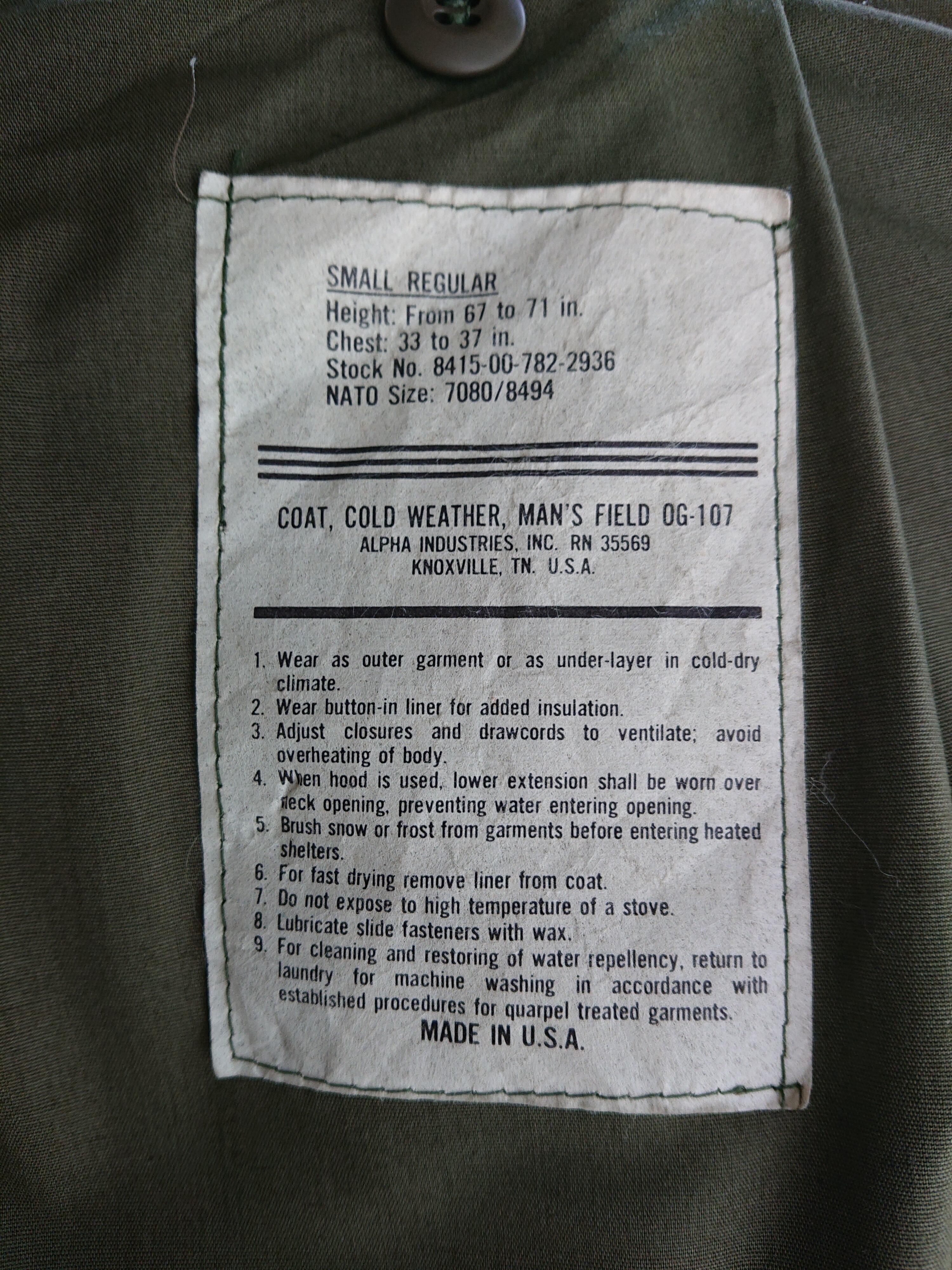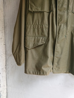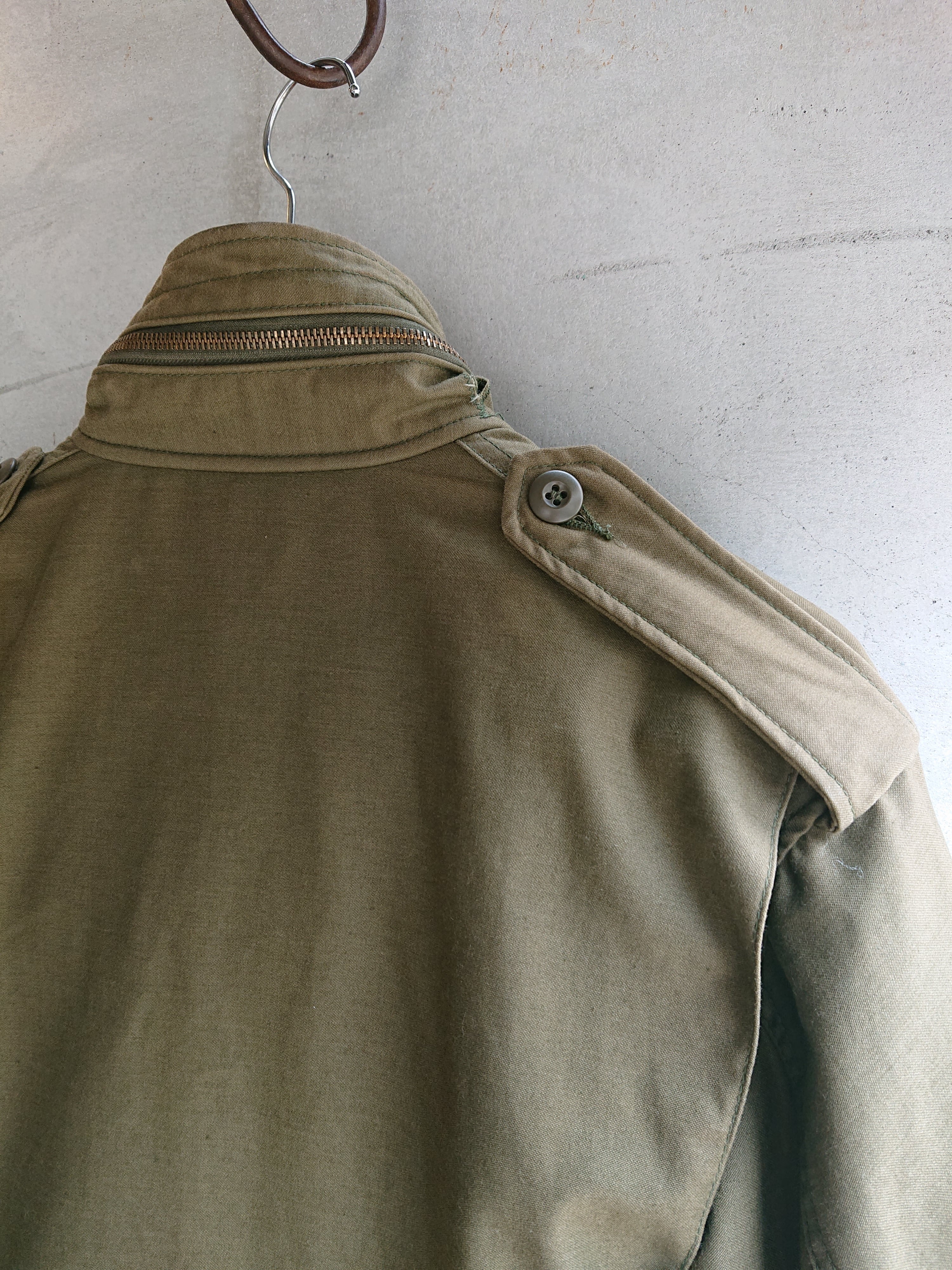 流行り廃りなく人気の高いM-65 フィールド ジャケット。素材はコットン50% ナイロン50%を仕様。軍用素材ということもあり強度に撥水効果もあります。なんといってもMADE IN USAなのも魅力です。私も長年愛用してますが、服装に困った時にサッと羽織って様になるジャケットです。裾に入るドローコードが抜けてないですが、その他は致命的な傷等はござません。